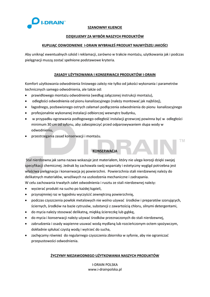 SZANOWNY KLIENCIE DZIĘKUJEMY ZA WYBÓR NASZYCH PRODUKTÓW KUPUJĄC ODWODNIENIE I-DRAIN WYBRAŁEŚ PRODUKT NAJWYŻSZEJ JAKOŚCI Aby uniknąć ewentualnych szkód i reklamacji, zarówno w trakcie montażu, użytkowania jak i podczas pielęgnacji muszą zostać spełnione podstawowe kryteria. ZASADY UŻYTKOWANIA I KONSERWACJI PRODUKTÓW I-DRAIN Komfort użytkowania odwodnienia liniowego zależy nie tylko od jakości wykonania i parametrów technicznych samego odwodnienia, ale także od: prawidłowego montażu odwodnienia (według załączonej instrukcji montażu), odległości odwodnienia od pionu kanalizacyjnego (należy montować jak najbliżej), łagodnego, pozbawionego ostrych załamań podłączenia odwodnienia do pionu kanalizacyjnego profesjonalnie wykonanej instalacji odbiorczej wewnątrz budynku, w przypadku ogrzewania podłogowego odległość instalacji grzewczej powinna być w odległości minimum 30 cm od syfonu, aby zabezpieczyć przed odparowywaniem słupa wody w odwodnieniu, przestrzegania zasad konserwacji i montażu. KONSERWACJA Stal nierdzewna jak sama nazwa wskazuje jest materiałem, który nie ulega korozji dzięki swojej specyfikacji chemicznej. Jednak by zachowała swój wspaniały i estetyczny wygląd potrzebna jest właściwa pielęgnacja i konserwacja jej powierzchni. Powierzchnia stali nierdzewnej należy do delikatnych materiałów, wrażliwych na uszkodzenia mechaniczne i zadrapania. W celu zachowania trwałych zalet odwodnienia i rusztu ze stali nierdzewnej należy: wycierać produkt na sucho po każdej kąpieli, przynajmniej raz w tygodniu wyczyścić zewnętrzną powierzchnię, podczas czyszczenia powłok metalowych nie wolno używać środków i preparatów szorujących, ściernych, środków na bazie cytrusów, substancji z zawartością chloru, silnymi detergentami, do mycia należy stosować delikatną, miękką ściereczkę lub gąbkę, do mycia i konserwacji należy używać środków przeznaczonych do stali nierdzewnej, zabrudzenia i osady wapienne usuwać wodą mydlaną lub rozcieńczonym octem spożywczym, dokładnie spłukać czystą wodą i wytrzeć do sucha, zachęcamy również do regularnego czyszczenia zbiornika w syfonie, aby nie ograniczać przepustowości odwodnienia. ŻYCZYMY NIEZAWODNEGO UŻYTKOWANIA NASZYCH PRODUKTÓW I-DRAIN POLSKA www.i-drainpolska.pl