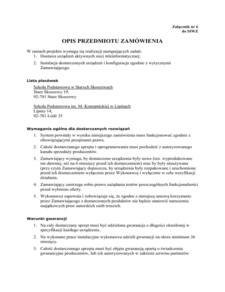 Załącznik nr 6 do SIWZ OPIS PRZEDMIOTU ZAMÓWIENIA W ramach projektu wymaga się realizacji następujących zadań: 1. Dostawa urządzeń aktywnych sieci teleinformatycznej; 2. Instalacja dostarczonych urządzeń i konfiguracja zgodnie z wytycznymi Zamawiającego. Lista placówek Szkoła Podstawowa w Starych Skoszewach Stare Skoszewy 19, 92-701 Stare Skoszewy Szkoła Podstawowa im. M. Konopnickiej w Lipinach Lipiny 14, 92-701 Łódź 35 Wymagania ogólne dla dostarczanych rozwiązań 1. System powstały w wyniku niniejszego zamówienia musi funkcjonować zgodnie z obowiązującymi przepisami prawa. 2. Całość dostarczanego sprzętu i oprogramowania musi pochodzić z autoryzowanego kanału sprzedaży producentów. 3. Zamawiający wymaga, by dostarczone urządzenia były nowe (tzn. wyprodukowane nie dawniej, niż na 6 miesięcy przed ich dostarczeniem) oraz by były nieużywane (przy czym Zamawiający dopuszcza, by urządzenia były rozpakowane i uruchomione przed ich dostarczeniem wyłącznie przez Wykonawcę i wyłącznie w celu weryfikacji działania. 4. Zamawiający zastrzega sobie prawo zażądania testów poszczególnych funkcjonalności przed wyborem oferty. 5. Wykonawca zapewnia i zobowiązuje się, że zgodne z niniejszą umową korzystanie przez Zamawiającego z dostarczonych produktów nie będzie stanowić naruszenia majątkowych praw autorskich osób trzecich. Warunki gwarancji 1. Na cały dostarczany sprzęt musi być udzielona gwarancja o długości określonej w specyfikacji każdego urządzenia. 2. Na wykonane prace instalacyjne wykonawca udzieli gwarancji na okres minimum 36 miesięcy. 3. Całość dostarczonego sprzętu musi być objęta gwarancją opartą o świadczenia gwarancyjne producentów, lub ich autoryzowanych w zakresie serwisu partnerów. 4. Wymaga się by serwis gwarancyjny świadczony był w miejscu instalacji sprzętu; czas reakcji na zgłoszony problem (rozumiany jako podjęcie działań diagnostycznych i kontakt ze zgłaszającym) nie może przekroczyć 3 dni roboczych Wymagania co do harmonogramu realizacji projektu 1. Zamawiający wymaga realizacji przedmiotu zamówienia w terminie 2 miesięcy od daty podpisania umowy. Zadanie I. Rekonfiguracja sieci światłowodowej W ramach tego zadania należy wykonać wszystkie prace niezbędne do podłączenia wskazanych wcześniej szkół do istniejącej sieci światłowodowej Gminy Nowosolna. W w/w obiektach znajdują się przełącznice światłowodowe. Należy połączyć planowany Główny Punkt Dystrybucyjny z istniejącą przełącznicą kablem światłowodowym (lub patchcordem) oraz wykonać niezbędne krosowania i pomiary. Efektem powyższych prac ma być możliwość podłączenia urządzeń dostarczonych w ramach kolejnych zadań do sieci światłowodowej. W ramach tego zadania Wykonawca dostarczy do każdej placówki niezbędne patchcordy światłowodowe. Zamawiający zaleca przeprowadzenie wizji lokalnej w obiektach. Zadanie II. Dostawa i instalacja sprzętu oraz urządzeń aktywnych sieci teleinformatycznej Do obowiązków Wykonawcy zamówienia w ramach tego Zadania należy dostawa, montaż i konfiguracja w środowisku sieciowym Zamawiającego urządzeń opisanych poniżej. W ramach konfiguracji urządzeń obowiązkiem Wykonawcy będzie uzyskanie od operatora sieci światłowodowej do której mają być włączone urządzenia (t.j. Wydziału Informatyki Urzędu Miasta Łodzi) wytycznych odnośnie konfiguracji interfejsów WAN. Ponadto w celu włączenia urządzeń do sieci światłowodowej Wykonawca dostarczy następujące wkładki światłowodowe: Wkładka dla przełącznika szkieletowego dostarczonego w ramach zadania II.2 umożliwiająca komunikację z prędkością 1Gb po dwóch włóknach kabla światłowodowego jednomodowego na odległość do 40km kompatybilna z siecią Urzędu Miasta Łodzi – 1 szt. Komplet wkładek umożliwiających połączenie przełączników dostępowych dostarczonych w ramach zadania II.3 do przełącznika szkieletowego dostarczonego w ramach zadania II.2 interfejsem 1Gb po światłowodzie jednomodowym długości do 20km. – 1 kpl (2 pary wkładek). II.1. Urządzenie zabezpieczające styk z siecią Internet– szt. 1 Interfejsy: Co najmniej 2 porty WAN zgodne ze standardem 1000Base-T (IEEE 802.3ab) z obsługą Flow COntrol (IEEE 802.3x). Co najmniej 4 porty LAN zgodne ze standardem 1000Base-T (IEEE 802.3ab) z obsługą Flow COntrol (IEEE 802.3x). Punkt dostępowy sieci bezprzewodowej zgodny ze standardem 802.11n, pracujący jednocześnie w pasmach częstotliwości 2.4GHz oraz 5GHz. Co najmniej 2 porty USB 2.0 Interfejsy WAN powinny obsługiwać konfiguracje: o statycznych adresów IP o dynamicznych adresów IP o klienta PPPoE o połączeń komórkowych 3G (za pomocą dodatkowej karty podłączanej poprzez złącze USB) Urządzenie powinno posiadać funkcjonalności: - obsługa co najmniej 50000 sesji jednoczesnych - obsługa równoważenia obciążenia dla ruchu wychodzącego na wiele interfejsów WAN, obsługa konfiguracji łącza zapasowego. - praca w trybach: NAT/PAT, routing, transparent - obsługa ramek Jumbo - IGMP Snooping - serwer VPN: IPSec (obsługa Hub-and-Spoke, co najmniej 50 tuneli, szyfrowanie AES, PFS), L2TP/PPTP (co najmniej 20 tuneli), SSL (co najmniej 20 tuneli) - certyfikacja VPNC AES Interoperability - klient VPN: co najmniej PPTP - obsługa uwierzytelniania użytkowników w oparciu o bazę danych RADIUS, LDAP oraz Active Directory - obsługa VPN Passthrough (co najmniej 5 sesji VPN) - obsługa h.323/SIP NAT Traversal - łatwą konfigurację zabezpieczeń sieci bezprzewodowej w oparciu o WPS (Push Button Configuration) - blokowanie komunikacji pomiędzy klientami przyłączonymi w ramach tej samej sieci bezprzewodowej - szyfrowanie WPA2-EAP (IEEE 802.11i) - zapora sieciowa typu Stateful Inspection - filtrowanie ruchu IPv4 i IPv6 (dostępnych co najmniej 500 reguł filtrowania) - filtrowanie adresów MAC (co najmniej 500 reguł) - Port forwardi