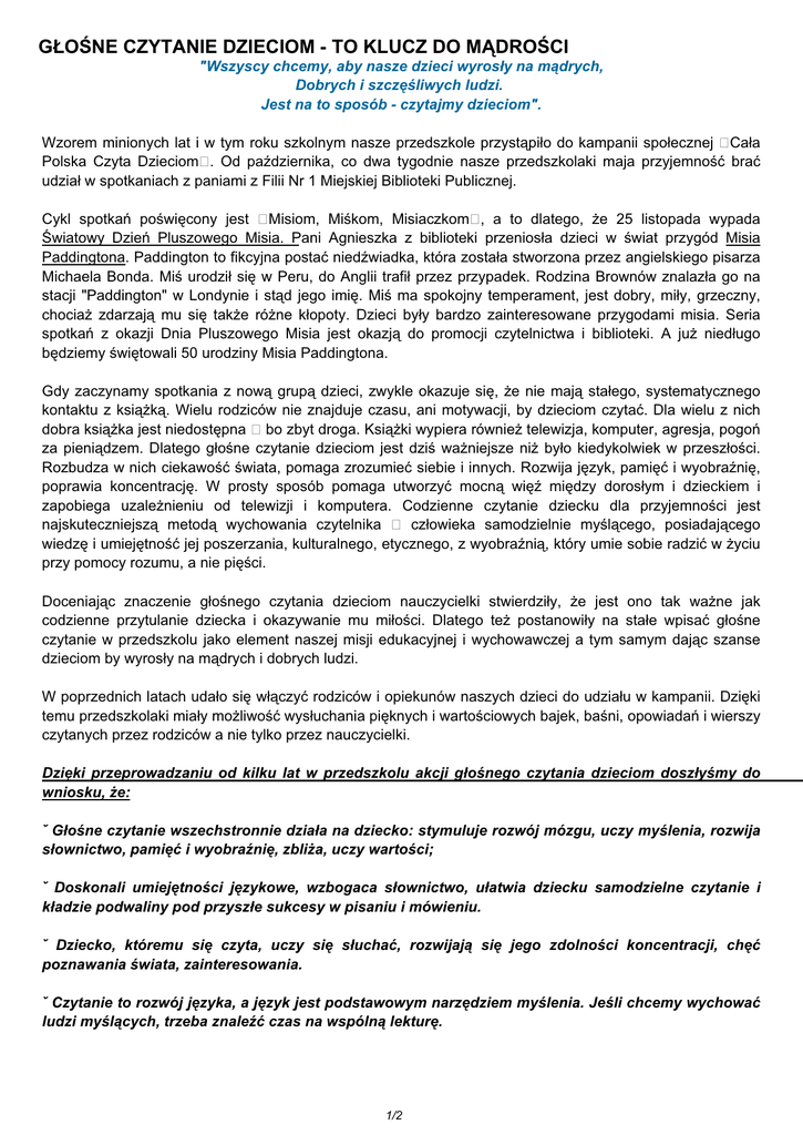GŁOŚNE CZYTANIE DZIECIOM - TO KLUCZ DO MĄDROŚCI "Wszyscy chcemy, aby nasze dzieci wyrosły na mądrych, Dobrych i szczęśliwych ludzi. Jest na to sposób - czytajmy dzieciom". Wzorem minionych lat i w tym roku szkolnym nasze przedszkole przystąpiło do kampanii społecznej Cała Polska Czyta Dzieciom . Od października, co dwa tygodnie nasze przedszkolaki maja przyjemność brać udział w spotkaniach z paniami z Filii Nr 1 Miejskiej Biblioteki Publicznej. Cykl spotkań poświęcony jest Misiom, Miśkom, Misiaczkom , a to dlatego, że 25 listopada wypada Światowy Dzień Pluszowego Misia. Pani Agnieszka z biblioteki przeniosła dzieci w świat przygód Misia Paddingtona. Paddington to fikcyjna postać niedźwiadka, która została stworzona przez angielskiego pisarza Michaela Bonda. Miś urodził się w Peru, do Anglii trafił przez przypadek. Rodzina Brownów znalazła go na stacji "Paddington" w Londynie i stąd jego imię. Miś ma spokojny temperament, jest dobry, miły, grzeczny, chociaż zdarzają mu się także różne kłopoty. Dzieci były bardzo zainteresowane przygodami misia. Seria spotkań z okazji Dnia Pluszowego Misia jest okazją do promocji czytelnictwa i biblioteki. A już niedługo będziemy świętowali 50 urodziny Misia Paddingtona. Gdy zaczynamy spotkania z nową grupą dzieci, zwykle okazuje się, że nie mają stałego, systematycznego kontaktu z książką. Wielu rodziców nie znajduje czasu, ani motywacji, by dzieciom czytać. Dla wielu z nich dobra książka jest niedostępna bo zbyt droga. Książki wypiera również telewizja, komputer, agresja, pogoń za pieniądzem. Dlatego głośne czytanie dzieciom jest dziś ważniejsze niż było kiedykolwiek w przeszłości. Rozbudza w nich ciekawość świata, pomaga zrozumieć siebie i innych. Rozwija język, pamięć i wyobraźnię, poprawia koncentrację. W prosty sposób pomaga utworzyć mocną więź między dorosłym i dzieckiem i zapobiega uzależnieniu od telewizji i komputera. Codzienne czytanie dziecku dla przyjemności jest najskuteczniejszą metodą wychowania czytelnika człowieka samodzielnie myślącego, posiadającego wiedzę i umiejętność jej poszerzania, kulturalnego, etycznego, z wyobraźnią, który umie sobie radzić w życiu przy pomocy rozumu, a nie pięści. Doceniając znaczenie głośnego czytania dzieciom nauczycielki stwierdziły, że jest ono tak ważne jak codzienne przytulanie dziecka i okazywanie mu miłości. Dlatego też postanowiły na stałe wpisać głośne czytanie w przedszkolu jako element naszej misji edukacyjnej i wychowawczej a tym samym dając szanse dzieciom by wyrosły na mądrych i dobrych ludzi. W poprzednich latach udało się włączyć rodziców i opiekunów naszych dzieci do udziału w kampanii. Dzięki temu przedszkolaki miały możliwość wysłuchania pięknych i wartościowych bajek, baśni, opowiadań i wierszy czytanych przez rodziców a nie tylko przez nauczycielki. Dzięki przeprowadzaniu od kilku lat w przedszkolu akcji głośnego czytania dzieciom doszłyśmy do wniosku, że: ˇ Głośne czytanie wszechstronnie działa na dziecko: stymuluje rozwój mózgu, uczy myślenia, rozwija słownictwo, pamięć i wyobraźnię, zbliża, uczy wartości; ˇ Doskonali umiejętności językowe, wzbogaca słownictwo, ułatwia dziecku samodzielne czytanie i kładzie podwaliny pod przyszłe sukcesy w pisaniu i mówieniu. ˇ Dziecko, któremu się czyta, uczy się słuchać, rozwijają się jego zdolności koncentracji, chęć poznawania świata, zainteresowania. ˇ Czytanie to rozwój języka, a język jest podstawowym narzędziem myślenia. Jeśli chcemy wychować ludzi myślących, trzeba znaleźć czas na wspólną lekturę. 1/2 ˇ Czas na czytanie powinien być zaplanowany a nie przypadkowy. ˇ Dziecko, któremu się czyta, czyli poświęca mu się czas, będzie mądrzejsze, poczuje się ważne, kompetentne i nabierze wiary w siebie. Nikt nie rodzi się czytelnikiem, czytelnika trzeba wychować codziennie czytając dziecku dla przyjemności. Op racowała: Iwona Cygnarowska 2/2