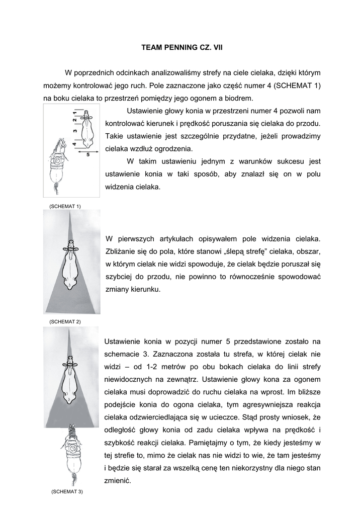 TEAM PENNING CZ. VII W poprzednich odcinkach analizowaliśmy strefy na ciele cielaka, dzięki którym możemy kontrolować jego ruch. Pole zaznaczone jako część numer 4 (SCHEMAT 1) na boku cielaka to przestrzeń pomiędzy jego ogonem a biodrem. Ustawienie głowy konia w przestrzeni numer 4 pozwoli nam kontrolować kierunek i prędkość poruszania się cielaka do przodu. Takie ustawienie jest szczególnie przydatne, jeżeli prowadzimy cielaka wzdłuż ogrodzenia. W takim ustawieniu jednym z warunków sukcesu jest ustawienie konia w taki sposób, aby znalazł się on w polu widzenia cielaka. (SCHEMAT 1) W pierwszych artykułach opisywałem pole widzenia cielaka. Zbliżanie się do pola, które stanowi „ślepą strefę” cielaka, obszar, w którym cielak nie widzi spowoduje, że cielak będzie poruszał się szybciej do przodu, nie powinno to równocześnie spowodować zmiany kierunku. (SCHEMAT 2) Ustawienie konia w pozycji numer 5 przedstawione zostało na schemacie 3. Zaznaczona została tu strefa, w której cielak nie widzi – od 1-2 metrów po obu bokach cielaka do linii strefy niewidocznych na zewnątrz. Ustawienie głowy kona za ogonem cielaka musi doprowadzić do ruchu cielaka na wprost. Im bliższe podejście konia do ogona cielaka, tym agresywniejsza reakcja cielaka odzwierciedlająca się w ucieczce. Stąd prosty wniosek, że odległość głowy konia od zadu cielaka wpływa na prędkość i szybkość reakcji cielaka. Pamiętajmy o tym, że kiedy jesteśmy w tej strefie to, mimo że cielak nas nie widzi to wie, że tam jesteśmy i będzie się starał za wszelką cenę ten niekorzystny dla niego stan zmienić. (SCHEMAT 3) Prowadzenie cielaka przez umieszczenie konia w tej strefie to ruch w przód, kiedy chcemy zmienić kierunek, wystarczy przesunąć konia w bok w pole widzenia cielaka. Jeżeli przesuniemy się w kierunku prawego boku cielaka i znajdziemy się w strefie, w której cielak nas widzi to jego reakcją będzie skręt w lewą stronę. Powinien tu zadziałać prosty mechanizm – jeżeli znajdziemy się po lewej stronie cielaka zachowa on się odwrotnie – wykona skręt w prawą stronę. Chciałbym Państwu dać tutaj dobrą radę – gdy prowadzimy cielaka prosto i znajdujemy się w polu dla niego niewidocznym to cielaka z reguły nie będzie chciał zbyt długo dać się prowadzić w linii prostej na otwartej przestrzeni. Po kilku metrach będzie chciał sam z siebie skręcić. W poprzednich odcinkach wspominałem już o tym, że cielak zanim wykona ruch do przodu lub skręt – to wcześniej da nam sygnał, co zamierza zrobić. Musimy tylko umieć te sygnały odczytać. W przypadku, kiedy cielak chce skręcić w lewą stronę to wcześniej zasygnalizuje nam to prawym uchem poprzez zgięcie go w kierunku swojej szyi. Jeżeli będziemy dobrymi obserwatorami i np. w danym momencie skręt cielaka w prawo nie będzie w naszym interesie, to powinniśmy po tym sygnale cielaka przesunąć konia na prawy bok cielaka w strefę przez niego widzianą – takie (SCHEMAT 4: zgięte lewe ucho, koń przesunięty na prawy bok cielaka) Cdn. posunięcie na pewno zablokuje skręt cielaka w prawo.