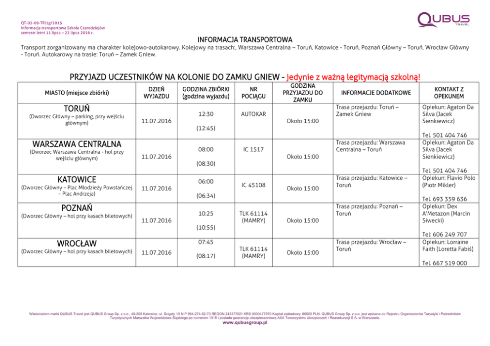 QT-02-09-TRl1g/2015 informacja transportowa Szkoła Czarodziejów semestr letni 11 lipca – 22 lipca 2016 r. INFORMACJA TRANSPORTOWA Transport zorganizowany ma charakter kolejowo-autokarowy. Kolejowy na trasach:, Warszawa Centralna – Toruń, Katowice - Toruń, Poznań Główny – Toruń, Wrocław Główny - Toruń. Autokarowy na trasie: Toruń – Zamek Gniew. PRZYJAZD UCZESTNIKÓW NA KOLONIE DO ZAMKU GNIEW - jedynie z ważną legitymacją szkolną! MIASTO (miejsce zbiórki) DZIEŃ WYJAZDU TORUŃ (Dworzec Główny – parking, przy wejściu głównym) AUTOKAR INFORMACJE DODATKOWE Trasa przejazdu: Toruń – Zamek Gniew Około 15:00 08:00 Trasa przejazdu: Warszawa Centralna – Toruń IC 1517 11.07.2016 KONTAKT Z OPEKUNEM Opiekun: Agaton Da Silva (Jacek Sienkiewicz) Około 15:00 Tel. 501 404 746 Opiekun: Agaton Da Silva (Jacek Sienkiewicz) (08:30) 06:00 11.07.2016 IC 45108 Około 15:00 Trasa przejazdu: Katowice – Toruń (06:34) POZNAŃ (Dworzec Główny – hol przy kasach biletowych) 12:30 GODZINA PRZYJAZDU DO ZAMKU (12:45) KATOWICE (Dworzec Główny – Plac Młodzieży Powstańczej – Plac Andrzeja) NR POCIĄGU 11.07.2016 WARSZAWA CENTRALNA (Dworzec Warszawa Centralna - hol przy wejściu głównym) GODZINA ZBIÓRKI (godzina wyjazdu) 10:25 11.07.2016 TLK 61114 (MAMRY) Trasa przejazdu: Poznań – Toruń Około 15:00 Tel. 501 404 746 Opiekun: Flavio Polo (Piotr Mikler) Tel. 693 359 636 Opiekun: Dex A’Metazon (Marcin Siwecki) (10:55) 07:45 WROCŁAW (Dworzec Główny – hol przy kasach biletowych) 11.07.2016 (08:17) TLK 61114 (MAMRY) Około 15:00 Trasa przejazdu: Wrocław – Toruń Tel: 606 249 707 Opiekun: Lorraine Faith (Loretta Fabiś) Tel. 667 519 000 Właścicielem marki QUBUS Travel jest QUBUS Group Sp. z o.o., 40-208 Katowice, ul. Ścigały 10 NIP 954-274-52-73 REGON 243377021 KRS 0000477970 Kapitał zakładowy: 60000 PLN. QUBUS Group Sp. z o.o. jest wpisana do Rejestru Organizatorów Turystyki i Pośredników Turystycznych Marszałka Województwa Śląskiego po numerem 1016 i posiada gwarancję ubezpieczeniową AXA Towarzystwa Ubezpieczeń i Reasekuracji S.A. w Warszawie. www.qubusgroup.pl QT-02-09-TRl1g/2015 informacja transportowa Szkoła Czarodziejów semestr letni 11 lipca – 22 lipca 2016 r. INFORMACJA TRANSPORTOWA Transport zorganizowany ma charakter kolejowo-autokarowy. Kolejowy na trasach: Toruń – Warszawa Centralna, Toruń – Katowice, Toruń – Poznań Główny, Toruń – Wrocław Główny. Autokarowy na trasie: Zamek Gniew – Toruń. POWRÓT UCZESTNIKÓW Z KOLONII - jedynie z ważną legitymacją szkolną! MIASTO DOCELOWE (odbiór uczestnika) DZIEŃ POWROTU GODZINA PRZYJAZDU (odbiór uczestnika) NR POCIĄGU GODZINA WYJAZDU Z ZAMKU Trasa przejazdu: Zamek Gniew – Toruń 22.07.2016 12:30 Autokar 10:00 10:00 Tel. 501 404 746 Opiekun: Agaton Da Silva (Jacek Sienkiewicz) Trasa przejazdu: Toruń – Warszawa Centralna WARSZAWA CENTRALNA (Dworzec Warszawa Centralna - hol przy wejściu głównym) 22.07.2016 17:30 TLK 53106 KATOWICE (Dworzec Główny - przy wejściu od Placu Andrzeja; Plac Młodzieży Powstańczej) 22.07.2016 21:55 IC 54108 10:00 22.07.2016 17:20 TLK 16115 10:00 WROCŁAW (Dworzec Główny – hol przy kasach biletowych) Trasa przejazdu: Toruń – Katowice Trasa przejazdu: Toruń – Poznań Główny POZNAŃ (Dworzec Główny – hol przy kasach biletowych) 22.07.2016 20:20 TLK 16115 KONTAKT Z OPEKUNEM Opiekun: Agaton Da Silva (Jacek Sienkiewicz) TORUŃ (Dworzec Główny – parking, przy wejściu głównym) INFORMACJE DODATKOWE 10:00 Trasa przejazdu: Toruń – Wrocław Główny Tel. 501 404 746 Opiekun: Flavio Polo (Piotr Mikler) Tel. 693 359 636 Opiekun: Dex A’Metazon (Marcin Siwecki) Tel: 606 249 707 Opiekun: Lorraine Faith (Loretta Fabiś) Tel. 667 519 000 Właścicielem marki QUBUS Travel jest QUBUS Group Sp. z o.o., 40-208 Katowice, ul. Ścigały 10 NIP 954-274-52-73 REGON 243377021 KRS 0000477970 Kapitał zakładowy: 60000 PLN. QUBUS Group Sp. z o.o. jest wpisana do Rejestru Organizatorów Turystyki i Pośredników Turystycznych Marszałka Województwa Śląskiego po numerem 1016 i posiada gwarancję ubezpieczeniową AXA Towarzystwa Ubezpieczeń i Reasekuracji S.A. w Warszawie. www.qubusgroup.pl QT-02-09-TRl1g/2015 informacja transportowa Szkoła Czarodziejów semestr letni 11 lipca – 22 lipca 2016 r. INFORMACJA TRANSPORTOWA dla transportu własnego Rodzica PRZYWÓZ UCZESTNIKA NA KOLONIE DO ZAMKU 11.07.2016 od godziny 13:00 do godziny 14:00 ODBIÓR UCZESTNIKA Z KOLONII 22.07.2016 od godziny 08:30 do godziny 09:30 INFORMACJE OGÓLNE 1. Turnus rozpoczyna się obiadem 11.07.2016 r. około godziny 16:00, a kończy śniadaniem 22.07.2016 r. o godzinie 08:00. 2. Kierownikiem turnusu jest Em Pica Soo (Mariusz Klimek), nr kontaktowy (nr tel. 511 177 814). 3. Wychowawcami w czasie wypoczynku są: Agaton Da Silva (Jacek Sienkiewicz), Egida Da Silva (Katarzyna Sienkiewicz), Flavio Polo (Piotr Mikler), Opiekun: Dex A’Metazon (Marcin Siwecki), Lorraine Faith (Loretta Fabiś). 4. We wszelkich sprawach dot. organizacji kolonii, uczestników, zakwaterowania itp. można kontaktować się wyłącznie z kierownikiem wypoczynku, najlepiej w godzinach: 09:30 - 10:30; 13:30 - 15:00; 18:45 - 19:30. 5. Uczestnicy korzystający z transportu organizatora mają obowiązek posiadania ważnej legitymacji szkolnej. 6. Prosimy o punktualne przybycie na miejsce zbiórki w czasie transportu na kolonie w dniu 11.07.2016 r. oraz o punktualne przybycie na miejsce odebrania uczestnika w dniu 22.07.2016 r. 7. Telefony do opiekunów transportu oraz kierownika turnusu, zawarte w poniższej informacji, są aktywne od 10 lipca 2016 r. 8. Odpowiedzi na nurtujące Państwa pytania, prosimy odnaleźć w strefie dla rodzica na stronie www.queverton.pl lub dzwonić do biura obsługi 728 66 33 23 (pn. - pt. w godzinach 09:00 - 16:30). Właścicielem marki QUBUS Travel jest QUBUS Group Sp. z o.o., 40-208 Katowice, ul. Ścigały 10 NIP 954-274-52-73 REGON 243377021 KRS 000047797