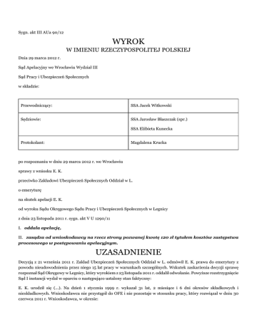 Sygn. akt III AUa 90/12 WYROK W IMIENIU RZECZYPOSPOLITEJ POLSKIEJ Dnia 29 marca 2012 r. Sąd Apelacyjny we Wrocławiu Wydział III Sąd Pracy i Ubezpieczeń Społecznych w składzie: Przewodniczący: SSA Jacek Witkowski Sędziowie: SSA Jarosław Błaszczak (spr.) SSA Elżbieta Kunecka Protokolant: Magdalena Krucka po rozpoznaniu w dniu 29 marca 2012 r. we Wrocławiu sprawy z wniosku E. K. przeciwko Zakładowi Ubezpieczeń Społecznych Oddział w L. o emeryturę na skutek apelacji E. K. od wyroku Sądu Okręgowego Sądu Pracy i Ubezpieczeń Społecznych w Legnicy z dnia 23 listopada 2011 r. sygn. akt V U 1290/11 I. oddala apelację, II. zasądza od wnioskodawcy na rzecz strony pozwanej kwotę 120 zł tytułem kosztów zastępstwa procesowego w postępowaniu apelacyjnym. UZASADNIENIE Decyzją z 21 września 2011 r. Zakład Ubezpieczeń Społecznych Oddział w L. odmówił E. K. prawa do emerytury z powodu nieudowodnienia przez niego 15 lat pracy w warunkach szczególnych. Wskutek zaskarżenia decyzji sprawę rozpoznał Sąd Okręgowy w Legnicy, który wyrokiem z 23 listopada 2011 r. oddalił odwołanie. Powyższe rozstrzygnięcie Sąd I instancji wydał w oparciu o następująco ustalony stan faktyczny: E. K. urodził się (...). Na dzień 1 stycznia 1999 r. wykazał 31 lat, 2 miesiące i 6 dni okresów składkowych i nieskładkowych. Wnioskodawca nie przystąpił do OFE i nie pozostaje w stosunku pracy, który rozwiązał w dniu 30 czerwca 2011 r. Wnioskodawca, w okresie: • od 3 sierpnia 1967 r. do 17 lutego 1969 r. był zatrudniony w (...) Przedsiębiorstwie (...) w N. na stanowisku stolarza; • od 4 marca 1969 r. do 28 marca 1970 r. był zatrudniony w (...) Fabrykach (...) zakładzie nr 2 w N. na stanowisku stolarza; • od 5 czerwca 1970 r. do 7 września 1974 r. był zatrudniony w (...) Przedsiębiorstwie Budowlanym Zakład (...) w L. na stanowisku cieśli; • od 1 marca 1994 r. do 31 grudnia 1998 r. był zatrudniony w (...) spółka z o.o. w P. na stanowisku cieśli. W okresie od 11 września 1974 r. do 28 lutego 1994 r. E. K. był zatrudniony w (...) Spółka z o.o. w L. na stanowisku cieśli budowlanego. Brygada wnioskodawcy pracowała, między innymi, przy wykonywaniu fundamentów pod znajdujące się na poszczególnych wydziałach maszyny i słupy suwnicowe, a także pod hale i urządzenia (kruszarki), które miały być na tych halach stawiane. Praca ta przebiegała w ten sposób, iż najpierw były wykonywane wykopy pod fundamenty, następnie szalowane były fundamenty pod budynek oraz pod poszczególne urządzenia. Wnioskodawca pracował także przy pracach remontowych urządzeń znajdujących się w poszczególnych wydziałach. W pierwszej kolejności konieczne było skucie fundamentów, wywiezienie taczkami gruzu, zrobienie wykopu pod nowy fundament, następnie obszalowanie na zewnątrz, przygotowanie zbrojenia, wniesienie go na halę, uzbrojenie i wylanie betonu na zbrojenia. Po 2-3 dniach konieczne było rozebranie szalunków i wykonanie izolacji na betonie, po czym beton był zasypywany piachem i ubijany oraz wylewana była posadzka. Takie same czynności były wykonywane przy remoncie innych urządzeń. W młynowni w toku prac remontowych dodatkowo był wykonywany tzw. chudziak, na który kładło się zbrojenie i wylewało beton. Wszystkie te prace były wykonywane ręcznie. Prace remontowe odbywały się podczas normalnej produkcji danego wydziału, wyłączone z pracy było tylko to urządzenie, przy którym wskazane prace akurat były wykonywane. Ubezpieczony pracował także w przy remoncie pieca na wydziale hutniczym w Hucie (...). Praca ta polegała na tym, iż najpierw konieczne było zburzenie pieca do fundamentów przy użyciu młota pneumatycznego. Następnie, miejsce to było szalowane, zbrojone i betonowane. W czasie pracy przy tym piecu, inne piece znajdowały się w ruchu. Po remoncie pieca, wnioskodawca pracował przy stawianiu nowego obrotowego pieca, a następnie na jednej z hal, gdzie wykonywał fundamenty pod suwnicę służącą do skuwania zastygłej masy, pozostałej po wytopie miedzi. W czasie pracy, produkcja na hali nie odbywała się. E. K. pracował także na wydziale S., na którym wykonywał fundamenty pod nowy budynek hali, na którym produkcja dopiero miała się odbywać. W Hucie (...) wnioskodawca pracował na wydziale odzyskiwania siarki z pieców hutniczych, gdzie wykonywał fundamenty pod maszyny odzyskujące ołów i siarkę z pozostałości po wytopie. W czasie wykonywania prac oddział był wyłączony z produkcji. Ubezpieczony pracował także przy budowie szybów, w szczególności ich głowic. W czasie wykonywania głowicy, szyb pracował i był głębiony; były to prace wykonywane na powierzchni. W Kopalni (...) wnioskodawca wykonywał fundamenty stropów na szybach wyciągowych. Praca odbywała się na piętrach stalowej konstrukcji postawionej wcześniej przez monterów i polegała na wylewaniu stropów, wykonaniu szalowania, zbrojenia i betonowania. W dniu 22 sierpnia 2011 r. E. K. złożył wniosek o przyznanie mu prawa do emerytury. Decyzją z 21 września 2011 r. Zakład Ubezpieczeń Społecznych oddział w L. odmówił wnioskodawcy prawa do wcześniejszej emerytury z tytułu pracy w warunkach szczególnych. W uzasadnieniu organ rentowy wskazał, że ubezpieczony udowodnił jedynie 4 lata, 9 miesięcy i 18 dni takiej pracy, wobec wymaganych 15 lat. Zakład nie uznał za prace w warunkach szczególnych zatrudnienia wykonywanego w okresie od 11 września 1974 r. do 28 lutego 1994 r. w (...) w L. na stanowisku betoniarza oraz zbrojarza betoniarza. Sąd I instancji, powołując art. 184 w zw. z art. 32 Ustawy z dnia 17 grudnia 1998 r. o emeryturach i rentach z FUS oraz przepisy Rozporządzenia Rady Ministrów z dnia 7 lutego 1983 r. w sprawie wieku emerytalnego pracowników zatrudnionych w szczególnych warunkach lub w szczególnym charakterze, uznał, że wnioskodawca nie spełnił przesłanki posiadania 15 lat pracy w 