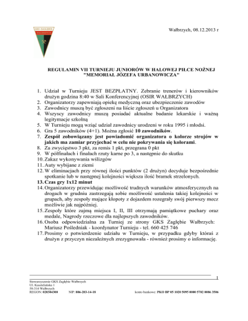 Wałbrzych, 08.12.2013 r REGULAMIN VII TURNIEJU JUNIORÓW W HALOWEJ PIŁCE NOŻNEJ "MEMORIAŁ JÓZEFA URBANOWICZA" 1. Udział w Turnieju JEST BEZPŁATNY. Zebranie trenerów i kierowników drużyn godzina 8:40 w Sali Konferencyjnej (OSIR WAŁBRZYCH) 2. Organizatorzy zapewniają opiekę medyczną oraz ubezpieczenie zawodów 3. Zawodnicy muszą być zgłoszeni na liście zgłoszeń u Organizatora 4. Wszyscy zawodnicy muszą posiadać aktualne badanie lekarskie i ważną legitymacje szkolną 5. W Turnieju mogą wziąć udział zawodnicy urodzeni w roku 1995 i młodsi. 6. Gra 5 zawodników (4+1). Można zgłosić 10 zawodników. 7. Zespół zobowiązany jest powiadomić organizatora o kolorze strojów w jakich ma zamiar przyjechać w celu nie pokrywania się kolorami. 8. Za zwycięstwo 3 pkt, za remis 1 pkt, przegrana 0 pkt 9. W półfinałach i finałach rzuty karne po 3, a następnie do skutku 10. Zakaz wykonywania wślizgów 11. Auty wybijane z ziemi 12. W eliminacjach przy równej ilości punktów (2 drużyn) decyduje bezpośrednie spotkanie lub w następnej kolejności większa ilość bramek strzelonych. 13. Czas gry 1x12 minut 14. Organizatorzy przewidując możliwość trudnych warunków atmosferycznych na drogach w grudniu zastrzegają sobie możliwość ustalenia takiej kolejności w grupach, aby zespoły mające kłopoty z dojazdem rozegrały swój pierwszy mecz możliwie jak najpóźniej. 15. Zespoły które zajmą miejsca I, II, III otrzymają pamiątkowe puchary oraz medale, Nagrody rzeczowe dla najlepszych zawodników. 16. Osoba odpowiedzialna za Turniej ze strony GKS Zagłębie Wałbrzych: Mariusz Pośledniak - koordynator Turnieju - tel. 660 425 746 17. Prosimy o potwierdzenie udziału w Turnieju, w przypadku gdyby któraś z drużyn z przyczyn niezależnych zrezygnowała - również prosimy o informację. Stowarzyszenie GKS Zagłębie Wałbrzych Ul. Kasztelańska 1 58-314 Wałbrzych REGON: 020304300 NIP: 886-283-14-18 1 konto bankowe: PKO BP 05 1020 5095 0000 5702 0086 3506 VII TURNIEJ JUNIORÓW W HALOWEJ PIŁCE NOŻNEJ "MEMORIAŁ JÓZEFA URBANOWICZA" 08.12.2013 GRUPA A 1. Stal Świdnica 2. Zagłębie II W-ch 3.Iskra Jaszkowa Dolna 4. Victoria Świebodzice 5. MKS Szczawno Zdrój Rozpoczęcie turnieju o godz. 900 1 2 3 4 Σ GRUPA B 1.Szczyt Boguszów 2. Bóbr Marciszów 3.Iskra Kochlice 4. Zagłębie I W-ch 5. Bystrzyca Górna 1 2 3 4 Σ Zebranie trenerów - kierowników drużyn 8:40 w Sali konferencyjnej Osir Wałbrzych. Nr Godz. Grupa Drużyna Drużyna Wynik meczu 1 9:00 A Stal Świdnica Zagłębie II W-ch 2 9:15 A Iskra Jaszkowa Dolna Victoria Świebodzice 3 9:30 B Szczyt Boguszów Bóbr Marciszów 4 9:45 B Iskra Kochlice Zagłębie I W-ch 5 10:00 A MKS Szczawno Zdrój Stal Świdnica 6 10:15 A Zagłębie II W-ch Iskra Jaszkowa Dolna 7 10:30 B Bystrzyca Górna Szczyt Boguszów 8 10:45 B Bóbr Marciszów Iskra Kochlice 9 11:00 A Victoria Świebodzice MKS Szczawno Zdrój 10 11:15 A Stal Świdnica Iskra Jaszkowa Dolna 11 11:30 B Zagłębie I W-ch Bystrzyca Górna 12 11:45 B Szczyt Boguszów Iskra Kochlice 13 12:00 A Zagłębie II W-ch MKS Szczawno Zdrój 14 12:15 A Victoria Świebodzice Stal Świdnica 15 12:30 B Bóbr Marciszów Bystrzyca Górna 16 12:45 B Zagłębie I W-ch Szczyt Boguszów 17 13:00 A Iskra Jaszkowa Dolna MKS Szczawno Zdrój 18 13:15 A Zagłębie II W-ch Victoria Świebodzice 19 13:30 B Iskra Kochlice Bystrzyca Górna 20 13:45 B Bóbr Marciszów Zagłębie I W-ch Stowarzyszenie GKS Zagłębie Wałbrzych Ul. Kasztelańska 1 58-314 Wałbrzych REGON: 020304300 NIP: 886-283-14-18 2 konto bankowe: PKO BP 05 1020 5095 0000 5702 0086 3506 Półfinały 21 22 14:00 14:15 1 2 Mecze finałowe 23 14:30 24 14:45 25 15:00 26 15:15 27 15:30 16:00 9 miejsce 7 miejsce 5 miejsce 3 miejsce 1 miejsce Stowarzyszenie GKS Zagłębie Wałbrzych Ul. Kasztelańska 1 58-314 Wałbrzych REGON: 020304300 NIP: 886-283-14-18 ZAKOŃCZENIE TURNIEJU 3 konto bankowe: PKO BP 05 1020 5095 0000 5702 0086 3506
