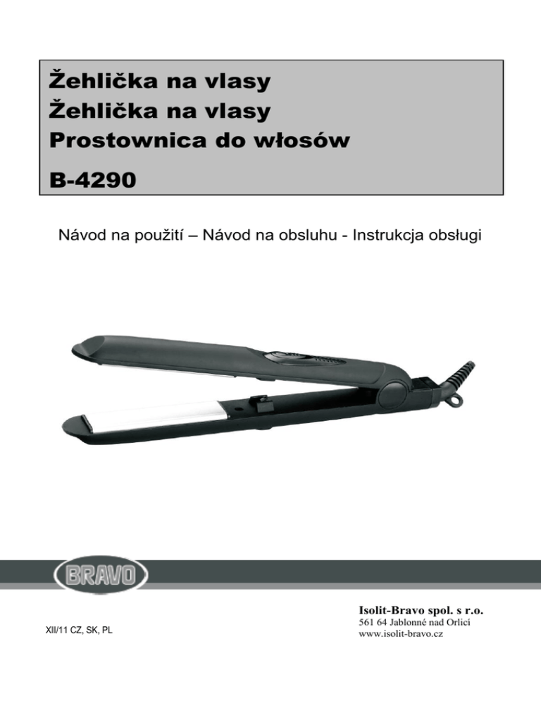 ĈESKY................................................................................. ...SLOVENSKY....... ............. Žehlička na vlasy Žehlička na vlasy Prostownica do włosów B-4290 Návod na použití – Návod na obsluhu - Instrukcja obsługi Isolit-Bravo spol. s r.o. 561 64 Jablonné nad Orlicí www.isolit-bravo.cz XII/11 CZ, SK, PL -1- ĈESKY................................................................................. ...SLOVENSKY....... ĈESKY ..........................................................3 - 10 SLOVENSKY .................................................3 - 10 POLSKI ......................................................11 - 15 KARTA GWARANCYJNA..................................17 ZÁRUĈNÍ LIST/ ZÁRUĈNÝ LIST......................18 -2- ............. ĈESKY................................................................................. ...SLOVENSKY....... ............. Předpokládané použití: Ţehliĉka na vlasy (dále jen přístroj) je urĉena pouze pro pouţití v domácnosti, k úpravě vlasů. Váţíme si, ţe jste si pořídili tento výrobek a věříme, ţe Vám bude dlouhá léta dobrým pomocníkem. Predpokladané použitie: Ţehliĉka na vlasy (ďalej len prístroj) je urĉená iba pre pouţitie v domácnosti, k úprave vlasov. Váţime si, ţe ste si zaobstarali tento výrobok a veríme, ţe Vám bude dlhé roky dobrým pomocníkom. Bezpeĉnostní upozornění: • Přeĉtěte si prosím všechny instrukce před pouţitím. • Přístroj není urĉen pro pouţívání osobami (vĉetně dětí), jimţ fyzická, smyslová, nebo mentální neschopnost ĉi nedostatek zkušeností a znalostí zabraňuje v bezpeĉném pouţívání přístroje, pokud na ně nebude dohlíţeno, nebo pokud nebyly instruovány ohledně pouţití přístroje osobou zodpovědnou za jejich bezpeĉnost. • Přívodní kabel veďte mimo prostory, kudy se chodí nebo jezdí! • Pokud přístroj nepouţíváte, odpojte ho od el. sítě vyjmutím ze zásuvky! • Přívodní kabel chraňte před ostrými hranami. • Ujistěte se, ţe napětí na typovém štítku souhlasí s napětím v síti u vás doma. • Přístroj pouţívejte jen k úĉelům, ke kterým je urĉen. • Přístroj by měl být vypnut před zapojením a vypojením ze sítě. Nikdy neškubejte se šňůrou při vytahování ze zásuvky. • Nepouţívejte přístroj, pokud je poškozená šňůra nebo zástrĉka. • Nikdy nepouţívejte, pokud je přístroj poškozen jakýmkoli způsobem. • Neriskujte úraz elektrickým proudem a neopravujte přístroj. • Pokud na chvíli opouštíte přístroj, vţdy jej vypněte a vytáhněte ze zásuvky. • Nepouţívejte přístroj bez dozoru. • Dejte pozor, aby se děti nedotýkali přístroje, pokud je horký a ujistěte se, ţe nemohou tahat za šňůru. • Nedávejte přístroj, šňůru nebo zástrĉku do vody nebo jiné kapaliny. • Nedovolte, aby se šňůra dotýkala horkého povrchu. • Přístroj nechte vţdy zcela vychladnout, neodkládejte jej na povrchy, které jsou citlivé na horko. • Jestliţe je síťový přívod tohoto přístroje poškozen, svěřte jeho výměnu odbornému servisu. • Elektrický rozvod, na který je přístroj připojen musí odpovídat příslušným elektrotechnickým normám! • Opravy smí provádět pouze odborné opravny! • Nedotýkejte se horkých povrchů. Při veškeré manipulaci se zapnutým přístrojem dbejte na maximální opatrnost, přístroj dosahuje vysokých teplot, hrozí popálení! • Je-li přístroj zapnutý dbejte, aby se přívodní kabel přístroje nedostal mezi kleště. • Neobtáĉejte přívodní kabel kolem přístroje. • Přístroj se nesmí pouţívat, kdyţ jsou vlasy mokré nebo vlhké anebo na umělých vlasech. Bezpeĉnostné upozornenie: • Preĉítajte si prosím všetky inštrukcie pred pouţitím. • Prístroj nie je urĉený pre pouţívanie osobami (vrátane detí), ktorým fyzická, zmyslová, alebo mentálna neschopnosť ĉi nedostatok skúseností a znalostí zabraňuje v bezpeĉnom pouţívaní prístroja, pokiaľ na ne nebude dohliadané, alebo pokiaľ neboli inštruované ohľadne pouţitia prístroja osobou zodpovednou za ich bezpeĉnosť. • Prívodný kábel veďte mimo priestory, kadiaľ sa chodí alebo jazdí! • Pokiaľ prístroj nepouţívate, odpojte ho od el. siete vytiahnutím zo zásuvky! • Prívodný kábel chráňte pred ostrými hranami. • Uistite sa, ţe napätie na typovom štítku súhlasí s napätím v sieti u vás doma. • Prístroj pouţívajte len na úĉely, ku ktorým je urĉený. • Prístroj by mal byť vypnutý pred zapojením a vypojením zo siete. Nikdy neťahajte so šnúrou pri vyťahovaní zo zásuvky. • Nepouţívajte prístroj, pokiaľ je poškodená šnúra alebo zástrĉka. • Nikdy nepouţívajte, pokiaľ je prístroj poškodený akýmkoľvek spôsobom. • Neriskujte úraz elektrickým prúdom a neopravujte prístroj. • Pokiaľ na chvíľu opúšťate prístroj, vţdy ho vypnite a vytiahnite zo zásuvky. • Nepouţívajte prístroj bez dozoru. • Dajte pozor, aby sa deti nedotýkali prístroja, pokiaľ je horúci a uistite sa, ţe nemôţu ťahať za šnúru. • Nedávajte prístroj, šnúru alebo zástrĉku do vody alebo inej kvapaliny. • Nedovoľte, aby sa šnúra dotýkala horúceho povrchu. • Prístroj nechajte vţdy úplne vychladnúť, neodkladajte ho na povrchy, ktoré sú citlivé na teplo. • Ak je sieťový prívod tohto prístroja poškodený, zverte jeho výmenu odbornému servisu. • Elektrický rozvod, na ktorý je prístroj pripojený musí zodpovedať príslušným elektrotechnickým normám! • Opravy smú vykonávať iba odborné opravovne! • Nedotýkajte sa horúcich povrchov. Pri kaţdej manipulácii so zapnutým prístrojom dbajte na maximálnu opatrnosť, prístroj dosahuje vysokých teplôt, hrozí popálenie! • Ak je prístroj zapnutý dbajte, aby sa prívod