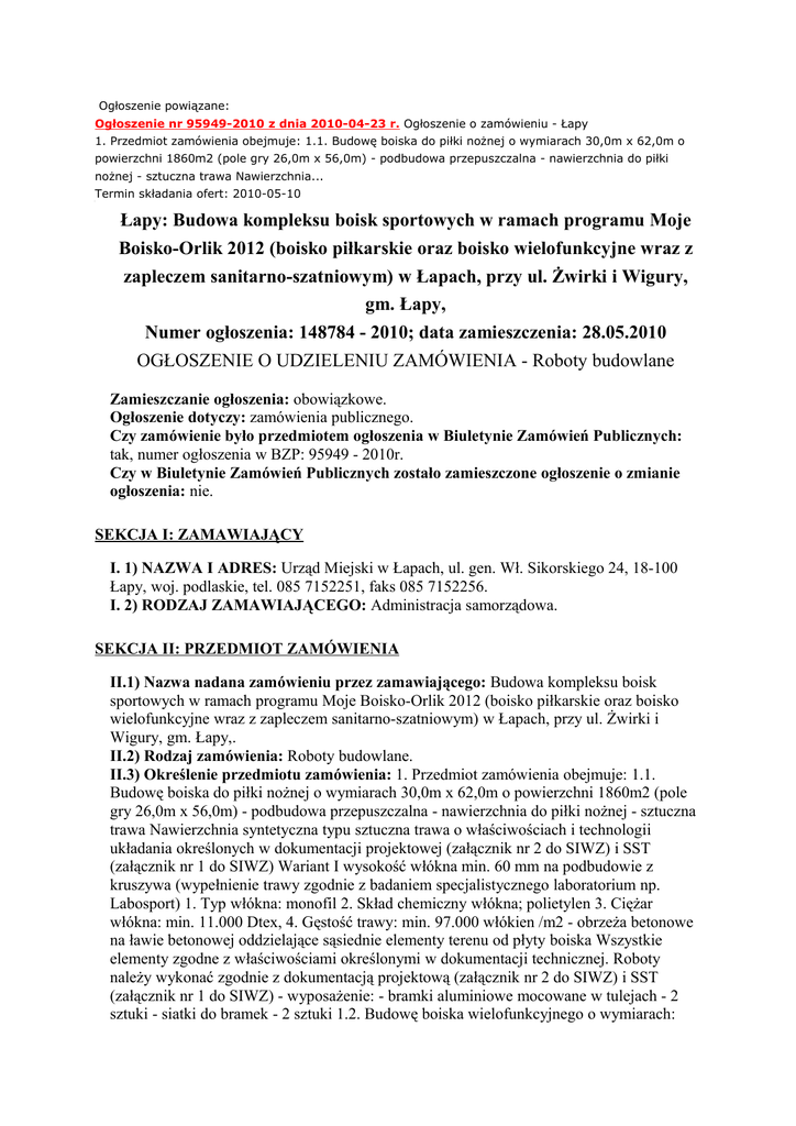 Ogłoszenie powiązane: Ogłoszenie nr 95949-2010 z dnia 2010-04-23 r. Ogłoszenie o zamówieniu - Łapy 1. Przedmiot zamówienia obejmuje: 1.1. Budowę boiska do piłki nożnej o wymiarach 30,0m x 62,0m o powierzchni 1860m2 (pole gry 26,0m x 56,0m) - podbudowa przepuszczalna - nawierzchnia do piłki nożnej - sztuczna trawa Nawierzchnia... Termin składania ofert: 2010-05-10 Łapy: Budowa kompleksu boisk sportowych w ramach programu Moje Boisko-Orlik 2012 (boisko piłkarskie oraz boisko wielofunkcyjne wraz z zapleczem sanitarno-szatniowym) w Łapach, przy ul. Żwirki i Wigury, gm. Łapy, Numer ogłoszenia: 148784 - 2010; data zamieszczenia: 28.05.2010 OGŁOSZENIE O UDZIELENIU ZAMÓWIENIA - Roboty budowlane Zamieszczanie ogłoszenia: obowiązkowe. Ogłoszenie dotyczy: zamówienia publicznego. Czy zamówienie było przedmiotem ogłoszenia w Biuletynie Zamówień Publicznych: tak, numer ogłoszenia w BZP: 95949 - 2010r. Czy w Biuletynie Zamówień Publicznych zostało zamieszczone ogłoszenie o zmianie ogłoszenia: nie. SEKCJA I: ZAMAWIAJĄCY I. 1) NAZWA I ADRES: Urząd Miejski w Łapach, ul. gen. Wł. Sikorskiego 24, 18-100 Łapy, woj. podlaskie, tel. 085 7152251, faks 085 7152256. I. 2) RODZAJ ZAMAWIAJĄCEGO: Administracja samorządowa. SEKCJA II: PRZEDMIOT ZAMÓWIENIA II.1) Nazwa nadana zamówieniu przez zamawiającego: Budowa kompleksu boisk sportowych w ramach programu Moje Boisko-Orlik 2012 (boisko piłkarskie oraz boisko wielofunkcyjne wraz z zapleczem sanitarno-szatniowym) w Łapach, przy ul. Żwirki i Wigury, gm. Łapy,. II.2) Rodzaj zamówienia: Roboty budowlane. II.3) Określenie przedmiotu zamówienia: 1. Przedmiot zamówienia obejmuje: 1.1. Budowę boiska do piłki nożnej o wymiarach 30,0m x 62,0m o powierzchni 1860m2 (pole gry 26,0m x 56,0m) - podbudowa przepuszczalna - nawierzchnia do piłki nożnej - sztuczna trawa Nawierzchnia syntetyczna typu sztuczna trawa o właściwościach i technologii układania określonych w dokumentacji projektowej (załącznik nr 2 do SIWZ) i SST (załącznik nr 1 do SIWZ) Wariant I wysokość włókna min. 60 mm na podbudowie z kruszywa (wypełnienie trawy zgodnie z badaniem specjalistycznego laboratorium np. Labosport) 1. Typ włókna: monofil 2. Skład chemiczny włókna; polietylen 3. Ciężar włókna: min. 11.000 Dtex, 4. Gęstość trawy: min. 97.000 włókien /m2 - obrzeża betonowe na ławie betonowej oddzielające sąsiednie elementy terenu od płyty boiska Wszystkie elementy zgodne z właściwościami określonymi w dokumentacji technicznej. Roboty należy wykonać zgodnie z dokumentacją projektową (załącznik nr 2 do SIWZ) i SST (załącznik nr 1 do SIWZ) - wyposażenie: - bramki aluminiowe mocowane w tulejach - 2 sztuki - siatki do bramek - 2 sztuki 1.2. Budowę boiska wielofunkcyjnego o wymiarach: 30,0m x 50,0m o powierzchni 1500m2 (pole gry 20,0m x 40,0m), - podbudowa I sposób podbudowa przepuszczalna określonymi w dokumentacji projektowej (załącznik nr 2 do SIWZ). Roboty należy wykonać zgodnie z dokumentacją projektową (załącznik nr 2 do SIWZ) i SST (załącznik nr 1 do SIWZ). - nawierzchnia boiska wielofunkcyjnego Nawierzchnia poliuretanowa o właściwościach i technologii układania określonych w dokumentacji projektowej (załącznik nr 2 do SIWZ) i SST (załącznik nr 1 do SIWZ) technologia układania nawierzchni: I sposób: Technologia typu EPDM - nawierzchnia gładka, przepuszczalna dla wody, wykonana dwuwarstwowo. W przypadku zastosowania podbudowy przepuszczalnej nawierzchnie tego typu należy wykonać na podbudowie elastycznej typu ET o grubości min. 30 mm. W przypadku nieprzepuszczalnej podbudowy betonowej, asfaltowej lub asfaltowo-betonowej warstwa ET nie jest wymagana. Dolna warstwa z granulatu SBR min 7 mm, górna warstwa wykonana z kolorowego granulatu EPDM min. 7 mm. - wyposażenie do piłki koszykowej: - obręcz do koszykówki standard i siatka do obręczy - 4 sztuki - tablica do koszykówki epoksydowa o wym. 105 x 180cm - 4 sztuki - mechanizm regulacji wysokości - 4 sztuki - konstrukcja do koszykówki dwusłupowa, montowana w tulejach - 4 sztuki - wyposażenie do piłki siatkowej: - słupki do siatkówki, aluminiowe, wielofunkcyjne (badminton, tenis, siatkówka) - 2 sztuki - siatka do siatkówki - 1 sztuka - wyposażenie do piłki ręcznej: - bramki aluminiowe mocowane w tulejach - 2 sztuki - siatki do bramek - 2 sztuki 1.3. Ogrodzenie terenu Szczegółowe rozwiązania wg dokumentacji projektowej (załącznik nr 2 do SIWZ) oraz SST (załącznik nr 1 do SIWZ). 1.4. Oświetlenie terenu Oświetlenie obiektu będą stanowiły projektory zamocowane na 10 masztach o wysokości min. 9 m. Szczegółowe rozwiązania wg dokumentacji projektowej (załącznik nr 2 do SIWT) oraz SST ( załącznik nr 1 do SIWZ). 1.5. Chodniki Ciągi komunikacyjne i powierzchnia przeznaczona pod kontener (na odpadki stałe) - kostka brukowa gr. min 6 cm, na podbudowie z piasku i kruszywa, zamknięta obrzeżem betonowym. Szczegółowe rozwiązania wg dokumentacji projektowej (załącznik nr 3 do SIWZ) oraz SST ( zał. Nr 2 do SIWZ). 1.6. Fundamenty pod budynek zaplecza socjalnego Fundamenty i roboty związane z ich wykonaniem należy wykonać zgodnie z dokumentacją projektową (załącznik nr 3 do SIWZ) i SST (załącznik nr 2 do SIWZ) Szczegółowy opis elementów przedmiotu zamówienia wymienionych w punktach od 1.1 do 1.6 stanowią załączniki: Załącznik Nr 1 do SIWZ Szczegółowe Specyfikacje Techniczne wykonania i odbioru robót budowlanych Załącznik Nr 2 do SIWZ Dokumentacja projektowa Załącznik Nr 3 do SIWZ Przedmiar robót Wymagany okres gwarancji dla elementów przedmiotu zamówienia wymienionych w punktach 2.1 do 2.6: - na wykonane roboty ( materiały i robociznę) wynosi 36 miesięcy od dnia odebrania przez Zamawiającego robót budowlanych i podpisania (bez uwag) protokołu końcowego. - na nawierzchnie syntetyczne oraz granulat użyty do wypełnienia nawierzchni ze sztucznej trawy - 60 miesięcy 1.7. Budowa 