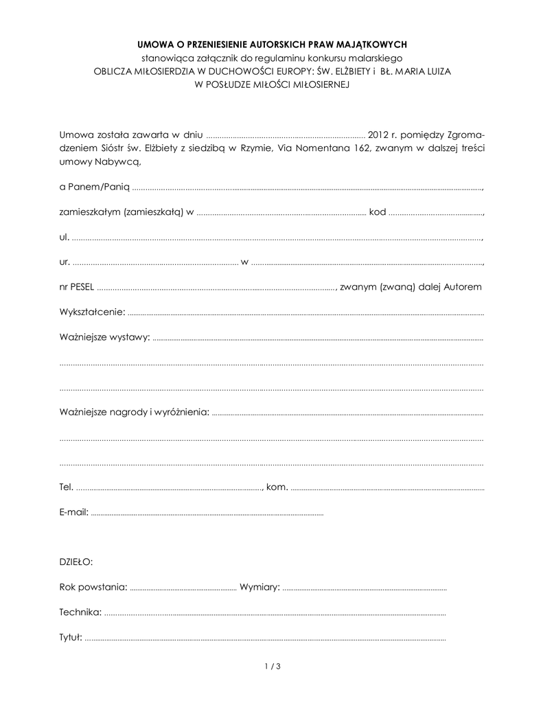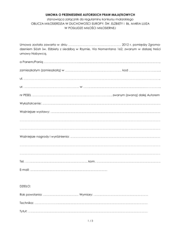 UMOWA O PRZENIESIENIE AUTORSKICH PRAW MAJĄTKOWYCH stanowiąca załącznik do regulaminu konkursu malarskiego OBLICZA MIŁOSIERDZIA W DUCHOWOŚCI EUROPY: ŚW. ELŻBIETY i BŁ. MARIA LUIZA W POSŁUDZE MIŁOŚCI MIŁOSIERNEJ Umowa została zawarta w dniu ………….……………………….…………………………. 2012 r. pomiędzy Zgromadzeniem Sióstr św. Elżbiety z siedzibą w Rzymie, Via Nomentana 162, zwanym w dalszej treści umowy Nabywcą, a Panem/Panią ………………………………………......................................................................................................................................., zamieszkałym (zamieszkałą) w ………….………………………………..…………………...... kod ……………………………..........., ul. ………………………………………………………………………………………………………………………….………………………………………, ur. …………………………………..……………………………. w ……..............................................................................................……………….., nr PESEL ……………………………………………….……………...…………………………..… , zwanym (zwaną) dalej Autorem Wykształcenie: ................................................................................................................................................................................................. Ważniejsze wystawy: ................................................................................................................................................................................... ……………………………………………………………………………….………………………………………………………………………………………. ……………………………………………………………………………….………………………………………………………………………………………. Ważniejsze nagrody i wyróżnienia: ................................................................................................................................................... …………………………………………………………………………………………………………………….…………………………………………………. ……………………………………………………………………………….………………………………………………………………………………………. Tel. ……............................................................................................., kom. ......................................................................................................... E-mail: .............................................................................................................................. DZIEŁO: Rok powstania: .......................................................... Wymiary: ......................................................................................... Technika: ……………………….….................................................................................................................................................... Tytuł: …................................................................................................................................................................................................ 1/3 §1 1. Autor oświadcza, że jest autorem dzieła plastycznego zgłoszonego do Konkursu Malarskiego OBLICZA MIŁOSIERDZIA W DUCHOWOŚCI EUROPY: ŚW. ELŻBIETY I BŁ. MARIA LUIZA W POSŁUDZE MIŁOŚCI MIŁOSIERNEJ, opisanego wyżej, zwanego dalej Dziełem. 2. Autor oświadcza, że Dzieło, o którym mowa w ust. 1, zostało wykonane przez niego osobiście. 3. Autor oświadcza, że posiada do Dzieła określonego w ust. 1 nieograniczone prawo autorskie, zarówno osobiste jak i majątkowe. Oświadcza ponadto, że Dzieło, które jest przedmiotem niniejszej umowy, nie jest obciążone żadnymi roszczeniami oraz innymi prawami osób trzecich, ani nie narusza jakichkolwiek praw osób trzecich. §2 Z chwilą zawarcia niniejszej umowy, Autor przenosi na Nabywcę autorskie prawa majątkowe wraz z prawami zależnymi do Dzieła, o którym mowa w §1 ust. 1 oraz do reprodukcji Dzieła także w wersji elektronicznej (na płycie CD – w postaci JPEG). Przeniesienie praw, o którym mowa w ust. 1 powyżej, obejmuje w szczególności następujące pola eksploatacji: a) w zakresie utrwalania i zwielokrotniania – wytwarzanie określoną techniką egzemplarzy Dzieła, w tym techniką drukarską, reprograficzną, techniką cyfrową; b) w zakresie obrotu oryginałem albo egzemplarzami, na których Dzieło utrwalono – wprowadzanie do obrotu, użyczenie lub najem oryginału albo egzemplarzy; c) w zakresie rozpowszechniania pracy plastycznej w sposób inny niż określony w pkt. b – publiczne wykonanie, wystawienie, wyświetlenie, odtworzenie oraz nadawanie i reemitowanie, a także publiczne udostępnianie pracy plastycznej w taki sposób, aby każdy mógł mieć do niego dostęp w miejscu i w czasie przez siebie wybranym. §3. Przeniesienie autorskich praw majątkowych na podstawie niniejszej umowy, do dzieła określonego w §1 ust. 1 Umowy; do reprodukcji także w wersji elektronicznej (na płycie CD – w postaci JPEG), o których mowa w §2 ust. 1 Umowy (opisanych również w pkt. 7 Regulaminu), następuje nieodpłatnie. §4. Przeniesienie praw autorskich do Dzieła oraz jego reprodukcji odbywa się bez ograniczeń czasowych i terytorialnych. 2/3 §5. Wszystkie zmiany w umowie muszą być dokonane w formie pisemnej pod rygorem nieważności. §6. W sprawach nieuregulowanych w niniejszej umowie mają zastosowanie