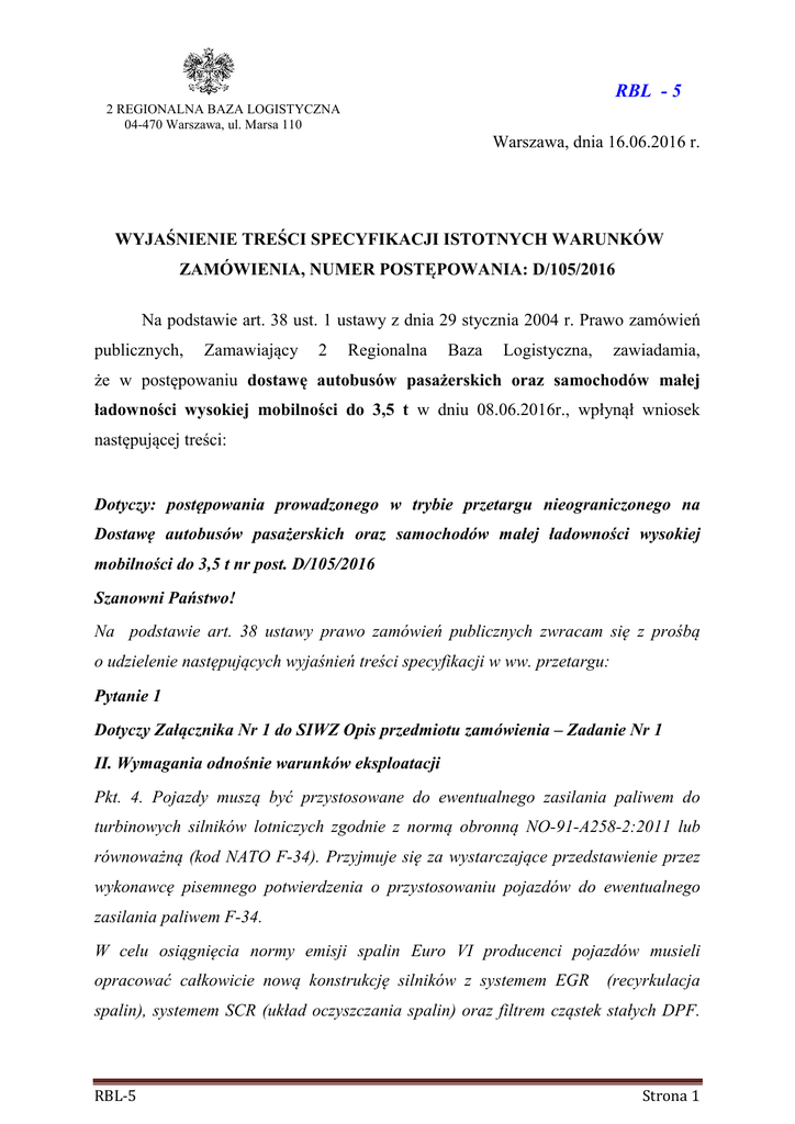 RBL - 5 2 REGIONALNA BAZA LOGISTYCZNA 04-470 470 Warszawa, ul. Marsa 110 Warszawa, dnia 16.06.2016 r. WYJAŚNIENIE TREŚCI ŚCI CI SPECYFIKACJI ISTOTNYCH WARUNKÓW ZAMÓWIENIA, IENIA, NUMER POSTĘPOWANIA: POST POWANIA: D/105/2016 D/105 Na podstawie art. 38 ust. 1 ustawy z dnia 29 stycznia 2004 r. Prawo zamówień zamówie publicznych, Zamawiający ący cy 2 Regionalna Baza Logistyczna, zawiadamia zawiadamia, że w postępowaniu dostawę dostaw autobusów pasażerskich erskich oraz samochodów małej ładowności ci wysokiej mobilno mobilności do 3,5 t w dniu 08.06.2016r., .2016r., wpłynął wpłyn wniosek następującej treści: Dotyczy: postępowania powania prowadzonego w trybie przetargu nieograniczonego na Dostawę autobusów pasaż pasażerskich erskich oraz samochodów małej ładowności ładowno wysokiej mobilności do 3,5 t nr post. D/105/2016 Szanowni Państwo! Na podstawie art. 38 ustawy prawo zamówień zamówie publicznych zwracam się si z prośbą o udzielenie następujących cych wyjaśnień wyja treści ci specyfikacji w ww. przetargu: Pytanie 1 Dotyczy Załącznika cznika Nr 1 do SIWZ Opis przedmiotu zamówienia – Zadanie Nr 1 II. Wymagania odnośnie nie warunków eksploatacji Pkt. 4. Pojazdy muszą być przystosowane do ewentualnego zasilania paliwem do turbinowych silników lotniczych zgodnie z normą norm obronną NO-91--A258-2:2011 lub równoważną (kod NATO F-34). FPrzyjmuje się za wystarczające ce przedstawienie przez wykonawcę pisemnego potwierdzenia o przystosowaniu pojazdów do ewentualnego zasilania paliwem F-34. W celu osiągnięcia cia normy emisji spalin Euro VI producenci pojazdów musieli opracować całkowicie cie nową konstrukcję silników z systemem EGR (recyrkulacja spalin), systemem SCR (układ oczyszczania spalin) oraz filtrem cząstek cz stałych DPF. RBL-5 Strona 1 Zastosowanie powyższych rozwiązań pozwala osiągnąć wymaganą przez Unię Europejską normę emisji spalin Euro VI. Zmiany te spowodowały, że użycie paliw turbinowych silników lotniczych NATO F-34 w silnikach wysokoprężnych spełniających normę emisji spalin Euro VI nie jest możliwe i wyklucza się jego stosowanie. Producent silników w naszych pojazdach określa normę dla paliw, jakie mogą być stosowane. Jest to Europejska norma EN 590. Użycie paliwa wymaganego przez Zamawiającego, określonego jako NATO F-34, może doprowadzić do uszkodzenia w układzie wtryskowym: listwy Common Rail oraz samych wtryskiwaczy, występuje tu ciśnienie powyżej 2000 bar. Dodatkowo układ oczyszczania spalin z zastosowaniem systemu DPF (dopalanie sadzy w filtrze cząstek stałych), z systemem czujników i wtryskiwaczem SCR z zastosowaniem AdBlue może również ulec zniszczeniu przy zastosowaniu paliwa NATO F-34. Użycie paliwa NATO F-34 wiąże się również z utratą gwarancji na silnik oraz kompletny układ wydechowy ze względu na nie stosowanie paliwa zalecanego przez producenta silnika. Nadmienić należy również, że zastosowanie paliwa NATO F-34 nie gwarantuje uzyskania parametrów wymaganych przez Normę Euro VI. Ponadto chcemy poinformować Zamawiającego, że w niektórych krajach znajdujących się w strukturach NATO w przypadku zamawiania dla wojska nowych pojazdów, spełniających warunek ewentualnego stosowania paliwa NATO F-35, zamawiane są pojazdy z silnikami spełniającymi normę emisji spalin EURO V, które są nadal produkowane dla takich zamówień. Czy Zamawiający, uwzględniając powyższą argumentację, może zrezygnować z wymogu przystosowania pojazdów do ewentualnego zasilania paliwem lotniczym zgodnie z normą obronną NO-91-A258-2:2011 lub równoważną (kod NATO F-34)? Na podstawie art. 38 ust.2 ustawy PZP, zamawiający informuje, iż udzielił wyjaśnienia: RBL-5 Strona 2 Zamawiający podtrzymuje wymagania określone w części II pkt. 4 – Wymagania Eksploatacyjno – Techniczne (WET) na dostawę samochodów ogólnego przeznaczenia – autobusów (SOP-A ) – zadanie nr 1. Zamawiający informuje, iż w wyniku złożonych wyjaśnień treści SIWZ, nie przedłuża terminu składania ofert. KIEROWNIK ZAMAWIAJĄCEGO /-/ z up. mgr Elżbieta KALWASIŃSKA RBL-5 Strona 3