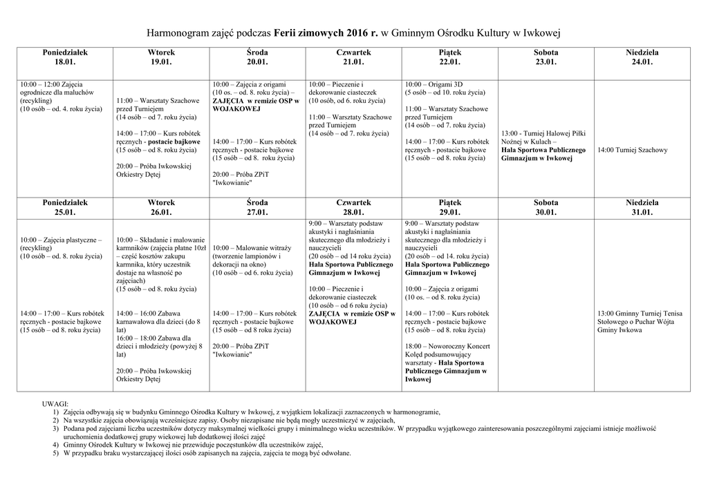 Harmonogram zajęć podczas Ferii zimowych 2016 r. w Gminnym Ośrodku Kultury w Iwkowej Poniedziałek 18.01. 10:00 – 12:00 Zajęcia ogrodnicze dla maluchów (recykling) (10 osób – od. 4. roku życia) Wtorek 19.01. 11:00 – Warsztaty Szachowe przed Turniejem (14 osób – od 7. roku życia) 14:00 – 17:00 – Kurs robótek ręcznych - postacie bajkowe (15 osób – od 8. roku życia) 20:00 – Próba Iwkowskiej Orkiestry Dętej Poniedziałek 25.01. 10:00 – Zajęcia plastyczne – (recykling) (10 osób – od. 8. roku życia) 14:00 – 17:00 – Kurs robótek ręcznych - postacie bajkowe (15 osób – od 8. roku życia) Wtorek 26.01. 10:00 – Składanie i malowanie karmników (zajęcia płatne 10zł – część kosztów zakupu karmnika, który uczestnik dostaje na własność po zajęciach) (15 osób – od 8. roku życia) 14:00 – 16:00 Zabawa karnawałowa dla dzieci (do 8 lat) 16:00 – 18:00 Zabawa dla dzieci i młodzieży (powyżej 8 lat) 20:00 – Próba Iwkowskiej Orkiestry Dętej Środa 20.01. 10:00 – Zajęcia z origami (10 os. – od. 8. roku życia) – ZAJĘCIA w remizie OSP w WOJAKOWEJ Czwartek 21.01. 10:00 – Pieczenie i dekorowanie ciasteczek (10 osób, od 6. roku życia) 11:00 – Warsztaty Szachowe przed Turniejem (14 osób – od 7. roku życia) Piątek 22.01. Niedziela 24.01. 10:00 – Origami 3D (5 osób – od 10. roku życia) 11:00 – Warsztaty Szachowe przed Turniejem (14 osób – od 7. roku życia) 14:00 – 17:00 – Kurs robótek ręcznych - postacie bajkowe (15 osób – od 8. roku życia) 14:00 – 17:00 – Kurs robótek ręcznych - postacie bajkowe (15 osób – od 8. roku życia) Sobota 23.01. 13:00 - Turniej Halowej Piłki Nożnej w Kulach – Hala Sportowa Publicznego Gimnazjum w Iwkowej 14:00 Turniej Szachowy 20:00 – Próba ZPiT "Iwkowianie" Środa 27.01. 10:00 – Malowanie witraży (tworzenie lampionów i dekoracji na okno) (10 osób – od 6. roku życia) 14:00 – 17:00 – Kurs robótek ręcznych - postacie bajkowe (15 osób – od 8 roku życia) 20:00 – Próba ZPiT "Iwkowianie" Czwartek 28.01. Piątek 29.01. 9:00 – Warsztaty podstaw akustyki i nagłaśniania skutecznego dla młodzieży i nauczycieli (20 osób – od 14 roku życia) Hala Sportowa Publicznego Gimnazjum w Iwkowej 9:00 – Warsztaty podstaw akustyki i nagłaśniania skutecznego dla młodzieży i nauczycieli (20 osób – od 14. roku życia) Hala Sportowa Publicznego Gimnazjum w Iwkowej 10:00 – Pieczenie i dekorowanie ciasteczek (10 osób – od 6 roku życia) ZAJĘCIA w remizie OSP w WOJAKOWEJ 10:00 – Zajęcia z origami (10 os. – od 8. roku życia) 14:00 – 17:00 – Kurs robótek ręcznych - postacie bajkowe (15 osób – od 8. roku życia) Sobota 30.01. Niedziela 31.01. 13:00 Gminny Turniej Tenisa Stołowego o Puchar Wójta Gminy Iwkowa 18:00 – Noworoczny Koncert Kolęd podsumowujący warsztaty - Hala Sportowa Publicznego Gimnazjum w Iwkowej UWAGI: 1) Zajęcia odbywają się w budynku Gminnego Ośrodka Kultury w Iwkowej, z wyjątkiem lokalizacji zaznaczonych w harmonogramie, 2) Na wszystkie zajęcia obowiązują wcześniejsze zapisy. Osoby niezapisane nie będą mogły uczestniczyć w zajęciach, 3) Podana pod zajęciami liczba uczestników dotyczy maksymalnej wielkości grupy i minimalnego wieku uczestników. W przypadku wyjątkowego zainteresowania poszczególnymi zajęciami istnieje możliwość uruchomienia dodatkowej grupy wiekowej lub dodatkowej ilości zajęć 4) Gminny Ośrodek Kultury w Iwkowej nie przewiduje poczęstunków dla uczestników zajęć, 5) W przypadku braku wystarczającej ilości osób zapisanych na zajęcia, zajęcia te mogą być odwołane.