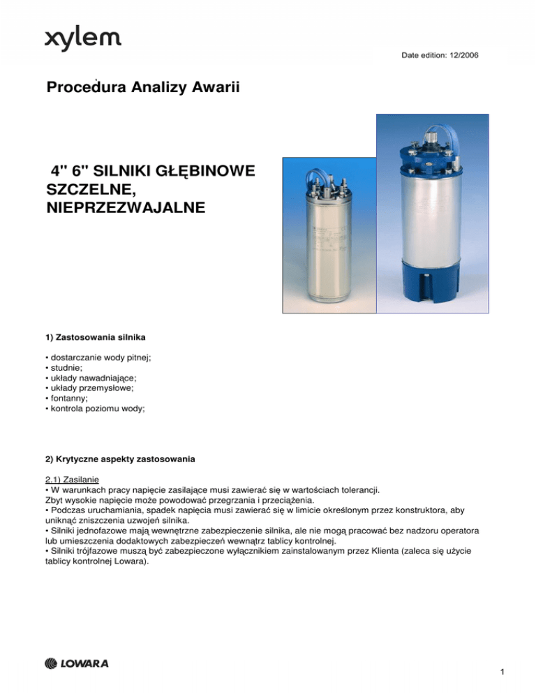 Lowara Date edition: 12/2006 .. Procedura Analizy Awarii 4" 6" SILNIKI GŁĘBINOWE SZCZELNE, NIEPRZEZWAJALNE 1) Zastosowania silnika • dostarczanie wody pitnej; • studnie; • układy nawadniające; • układy przemysłowe; • fontanny; • kontrola poziomu wody; 2) Krytyczne aspekty zastosowania 2.1) Zasilanie • W warunkach pracy napięcie zasilające musi zawierać się w wartościach tolerancji. Zbyt wysokie napięcie może powodować przegrzania i przeciążenia. • Podczas uruchamiania, spadek napięcia musi zawierać się w limicie określonym przez konstruktora, aby uniknąć zniszczenia uzwojeń silnika. • Silniki jednofazowe mają wewnętrzne zabezpieczenie silnika, ale nie mogą pracować bez nadzoru operatora lub umieszczenia dodaktowych zabezpieczeń wewnątrz tablicy kontrolnej. • Silniki trójfazowe muszą być zabezpieczone wyłącznikiem zainstalowanym przez Klienta (zaleca się użycie tablicy kontrolnej Lowara). 1 1 Date edition: 12/2006 Lowara Date edition: 12/2006 .. 2.2) Ciecz • Maksymalna temperatura cieczy i odpowiadająca minimalna prędkość cieczy dookoła zewnętrznego płaszcza silnika, musi spełniać wymagania wskazane w książce montażu. - Jeśli temperatura jest zbyt wysoka lub prędkość jest zbyt niska, może to powodować przegrzanie. Aby zagwarantować poprawną prędkość cieczy, w razie konieczności należy zamontować zewnętrzny płaszcz. - Jeśli temperatura cieczy jest większa niż wartość krytyczna, silnik musi być przemiarowany zgodnie ze współczynnikami dostarczonymi przez konstruktora. • Konieczne jest zagwarantowanie minimum 1 m odległości pomiędzy pompą a dnem studni, aby zagwarantować poprawne chłodzenie silnika i uniknąć możliwości zassania przez pompę osadzonych ciał stałych, które zatykają filtr i niszczą część hydrauliczną. • Ciecz nie może być wodą słoną, wodą morską ani cieczą korozyjną (dla wody zawierającej chlorki patrz załączony diagram): - korozja powodowana jest nieodpowiednimi zastosowaniami (nieodpowiedni układ uziemienia, przebicia prądu, prądy błądzące, nieodpowiednia pompowana ciecz...) i nie mogą być przypisane produktowi ani materiałom konstrukcyjnym. 2.3) Chłodzenie pompy Połączenie pomiędzy silnikiem a pompą przeprowadzone przez Lowarę gwarantuje ich poprawną pracę. Chcąc połączyć zakupiony osobno silnik i pompę, należy przestrzegać następujących przepisów: • Nominalna moc silnika musi być większa lub równa mocy nominalnej silnika pompy; w innym przypadku może to spowodować przegrzanie lub przeciążenie. • Wartość nacisku osiowego musi zawierać się w granicach tolerancji zarówno w stanie pionowym jak i poziomym: - zbyt wysoki nacisk osiowy może spowodować tarcia, które mogą zniszczyć łożysko oporowe; - zbyt niski nacisk osiowy może zniszczyć górną podkładkę oporową. • Przed połączeniem silnika i pompy, należy sprawdzić czy występ wału silnika mieści się w granicach tolerancji; granice tolerancji występu wału silnika zgodnie z normą NEMA są następujące: silniki 4": 38.05 ÷ 38.30 [mm]; silniki 6": 72.65 ÷ 73.02 [mm]; - nadmierny występ wału powoduje zniszczenie łożyska oporowego silnika i zużycie wirników które ślizgają się na dyfuzorach. 2.4) Sterowanie silnika za pomocą przetwornicy • Minimalna częstotliwość napięcia zasilającego: 30 Hz • Czas rampy szybkiej uruchamiającej: 3 - 5 s • Czas rampy szybkiej zatrzymującej: 3 - 5 s Zbyt niska prędkość obrotowa lub uruchamiania powoduje zniszczenie łożyska oporowego Mitchella spowodowane przez jego brak smarowania. • W warunkach uruchamiania, przetwornica musi zagwarantować funkcję przyspieszania, to znaczy, musi dać puls napięcia przed przejściem do kontroli prądu aby ułatwić rozdzielenie płytek łożyska oporowego. • Maksymalna długość kabla: 20 m. Jeśli długość jest większa od maksymalnej, należy zamontować cewkę impedancyjną; w innym wypadku kabel i przetwornica mogą spowodować przepięcie które może przejść do silnika i uszkodzić uzwojenia. 2 2 Date edition: 12/2006 Lowara Date edition: 12/2006 .. 3) Wymagane wyposażenie i narzędzia • Megaomomierz o napięciu pracy wynoszącym 500 - 1000 V. 4) Kontrola uszkodzonego produktu 4.1) Informacja wstępna 4.1.1) Wymagania od klienta przy odbiorze uszkodzonego produktu: • data zakupu (jeśli to możliwe, potwierdzona rachunkiem lub fakturą); • data montażu; • warunki montażu. 4.1.2) Informacje o dostępnych wersjach • Silniki z płaszczem stojana wypełnionym powietrzem: - L4C: od 0.37 kW do 2.2 kW jednofazowe; - L4C: od 0.37 kW do 2.2 kW trójfazowe; - L6C: 4 kW. • Silniki z kołnierzem stojana wypełnionym olejem silikonowym: - L4C: 0.37 kW jednofazowe; - L4C: od 3 kW do 7.5 kW trójfazowe; - L6C: od 5.5 do 37 kW. 4.2) Zewnętrzna kontrola wizualna • Zewnętrzne aspekty produktu Korozja na powierzchni metalu lub na spawach (z małymi otworkami) lub nadmierna temperatura (osłona izolująca silnika o brązowym/niebieskim kolorze) wskazują na niepoprawne lub nieodpowiednie użycie (patrz 2.1 ÷ 2.4) i wykluczają uznanie gwarancji technicznej. Zatrzymanie, analiza i naprawa (jeśli wymagana) produktu dokonywana jest za opłatą. Jeśli nie ma powyższych przeciwskazań, przejść do kontroli w 4.3. 4.3) Kontrola wstępna • Dane na tabliczce: - typ i kod produktu; - numer serii; - numer stojana (tylko dla silnika F4-F6); - data produkcji; • Spawy i wgniecenia w kołnierzu. • Obecność i stan: - całego kabla zasilającego; • Stan wtyczki i jej oprawy • Położenie membrany względem jej warunków normalnych • Sprawdzić ręką, czy rotor obraca się, czy jest zablokowany (zniszczone łożyska) • Zmierzyć występ wału i sprawdzić przestrzeganie tolerancji (patrz 2.3) 4.4) Opór elektryczny uzwojeń • Zmierzyć opór elektryczny uzwojeń i dopasować wartości do zapewnianych przez Lowara. Jeśli w