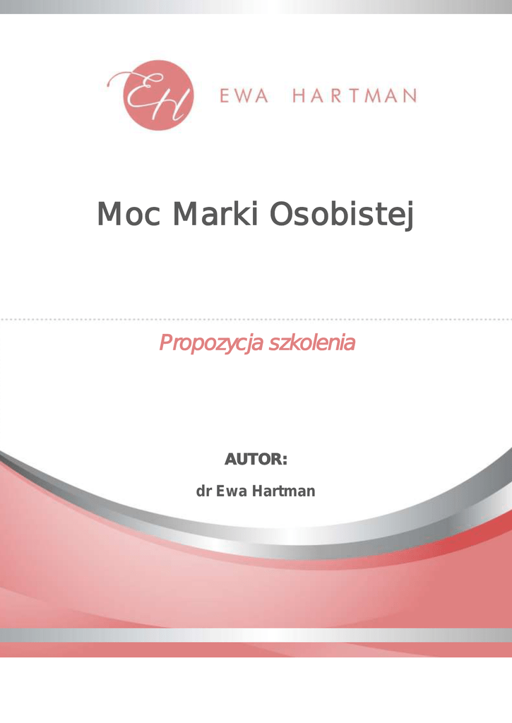 Moc Marki Osobistej Propozycja szkolenia AUTOR: dr Ewa Hartman Moc Marki Osobistej Jedynym klientem jak budowania relacji z zaufanie umocowane w profesjonalisty godnego zaufania jest marka osobista. A marka osobista, z kolei, i kontrahentem , oraz nauk jest zdobycie iewerbalnej. Szkolenie ma na celu dostarczenie uczestnikom silnej motywacji kariery zawodowemu. W relacji, w efekcie U budowania swojej pozycji eksperta W Wzmocnienie pozytywnego wizerunku firmy poprzez 1 2. PLAN SZKOLENIA: I. Wprowadzenie. Czym jest marka osobista i dlaczego jej budowanie jest W pasje II. Zaplanuj siebie. III. na swoim stanowisku, w swojej strukturze Misja, wizja, cele Twoja droga do mistrzostwa, czyli budowanie pozycji eksperta osobistej - czyli operacjonalizacja. Komunikowanie Dbanie o relacje i ich profesjonalizacja Wizerunek jako kategoria poznawcza IV. Zawodowo vs prywatnie. Podstawowe techniki relaksacji i wizualizacji V. Profesjonalista a wykonawca. Zbiór dobrych praktyk 2 3. : I. Uczestnicy n koncepcji marki w odniesieniu do profesjonalisty marki osobistej marki osobistej II. Uczestnicy n tworzenia raportu z klientem rozpoznawania t do wpisanymi takimi jak poszanowanie dobra pracodawcy, kontrahentów 3 Ewa Hartman trenerka z zakresu budowania marki osobistej publicznych oraz oktor Bournemouth University (Wielka Brytania). zarze czym Jestem mentorem w Szkole Trenerów Rozwoju zakresu marki: Moc Marki Osobistej i Po prostu mów indywidulane szkolenia z , budowania . Moje oceniane. Ostanie szkolenie prowadzone dla grupy 50 kobiet z firmy Procter & -cio stopniowej skali. Law Business Quality i Les N jest: u czyli osób, które poza w ludziach woli do wydobywania wodowym. 4 Cena warsztatu: - wersja weekendowa - wersja spotkania 3 godziny przez 5 tygodni Dane do przelewu: 82 1140 2004 0000 3502 7409 7653 KONTAKT: Ewa Hartman Tel: 600 811 360 Email: [email protected] 5