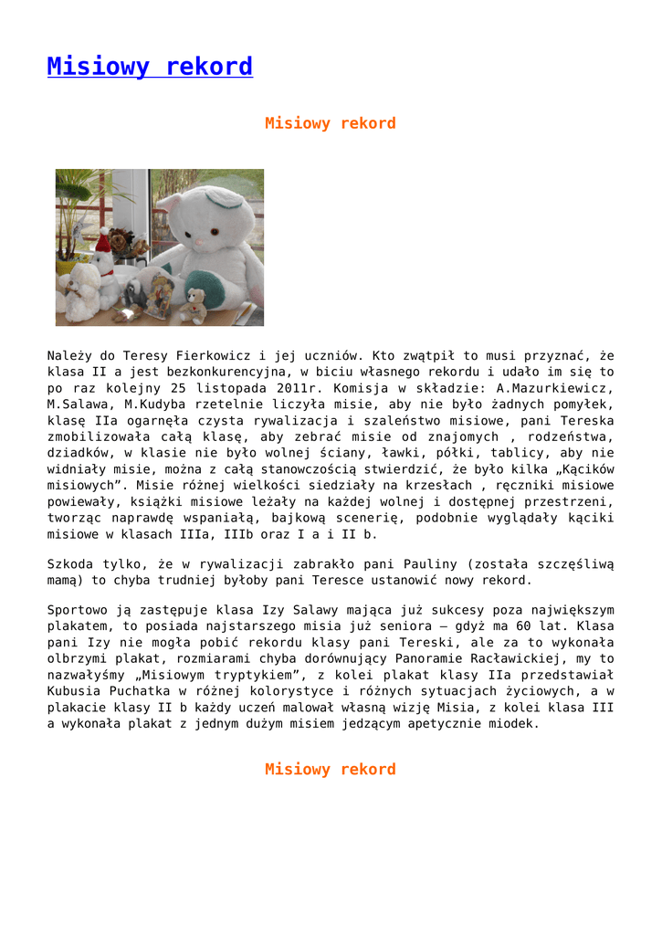 Misiowy rekord Misiowy rekord Należy do Teresy Fierkowicz i jej uczniów. Kto zwątpił to musi przyznać, że klasa II a jest bezkonkurencyjna, w biciu własnego rekordu i udało im się to po raz kolejny 25 listopada 2011r. Komisja w składzie: A.Mazurkiewicz, M.Salawa, M.Kudyba rzetelnie liczyła misie, aby nie było żadnych pomyłek, klasę IIa ogarnęła czysta rywalizacja i szaleństwo misiowe, pani Tereska zmobilizowała całą klasę, aby zebrać misie od znajomych , rodzeństwa, dziadków, w klasie nie było wolnej ściany, ławki, półki, tablicy, aby nie widniały misie, można z całą stanowczością stwierdzić, że było kilka „Kącików misiowych”. Misie różnej wielkości siedziały na krzesłach , ręczniki misiowe powiewały, książki misiowe leżały na każdej wolnej i dostępnej przestrzeni, tworząc naprawdę wspaniałą, bajkową scenerię, podobnie wyglądały kąciki misiowe w klasach IIIa, IIIb oraz I a i II b. Szkoda tylko, że w rywalizacji zabrakło pani Pauliny (została szczęśliwą mamą) to chyba trudniej byłoby pani Teresce ustanowić nowy rekord. Sportowo ją zastępuje klasa Izy Salawy mająca już sukcesy poza największym plakatem, to posiada najstarszego misia już seniora – gdyż ma 60 lat. Klasa pani Izy nie mogła pobić rekordu klasy pani Tereski, ale za to wykonała olbrzymi plakat, rozmiarami chyba dorównujący Panoramie Racławickiej, my to nazwałyśmy „Misiowym tryptykiem”, z kolei plakat klasy IIa przedstawiał Kubusia Puchatka w różnej kolorystyce i różnych sytuacjach życiowych, a w plakacie klasy II b każdy uczeń malował własną wizję Misia, z kolei klasa III a wykonała plakat z jednym dużym misiem jedzącym apetycznie miodek. Misiowy rekord Należy do Teresy Fierkowicz i jej uczniów. Kto zwątpił to musi przyznać, że klasa II a jest bezkonkurencyjna, w biciu własnego rekordu i udało im się to po raz kolejny 25 listopada 2011r. Komisja w składzie: A.Mazurkiewicz, M.Salawa, M.Kudyba rzetelnie liczyła misie, aby nie było żadnych pomyłek, klasę IIa ogarnęła czysta rywalizacja i szaleństwo misiowe, pani Tereska zmobilizowała całą klasę, aby zebrać misie od znajomych , rodzeństwa, dziadków, w klasie nie było wolnej ściany, ławki, półki, tablicy, aby nie widniały misie, można z całą stanowczością stwierdzić, że było kilka „Kącików misiowych”. Misie różnej wielkości siedziały na krzesłach , ręczniki misiowe powiewały, książki misiowe leżały na każdej wolnej i dostępnej przestrzeni, tworząc naprawdę wspaniałą, bajkową scenerię, podobnie wyglądały kąciki misiowe w klasach IIIa, IIIb oraz I a i II b. Szkoda tylko, że w rywalizacji zabrakło pani Pauliny (została szczęśliwą mamą) to chyba trudniej byłoby pani Teresce ustanowić nowy rekord. Sportowo ją zastępuje klasa Izy Salawy mająca już sukcesy poza największym plakatem, to posiada najstarszego misia już seniora – gdyż ma 60 lat. Klasa pani Izy nie mogła pobić rekordu klasy pani Tereski, ale za to wykonała olbrzymi plakat, rozmiarami chyba dorównujący Panoramie Racławickiej, my to nazwałyśmy „Misiowym tryptykiem”, z kolei plakat klasy IIa przedstawiał Kubusia Puchatka w różnej kolorystyce i różnych sytuacjach życiowych, a w plakacie klasy II b każdy uczeń malował własną wizję Misia, z kolei klasa III a wykonała plakat z jednym dużym misiem jedzącym apetycznie miodek. Dzieci i panie z przedszkola po prostu zalały misimi swoje sale. Kąciki, plakaty misiowe komisja utrwaliła na zdjęciach, gdyż trudno byłoby jakikolwiek plakat przenieść do naszej biblioteki, tak doskonale były wkomponowane w każdą przestrzeń. Sama ilość czyli 476 misiów imponuje, czyli została wykorzystana pełna mobilizacja dzieci i ich rodziców, kto miał misia w rodzinie, to musiał on znaleźć się w przedszkolu, niebezpiecznie było w rodzinach, gdzie brat chodzi do przedszkola, a siostra do szkoły i każde chciało miśki zabrać do siebie, na szczęście Dzień Pluszowego Misia minął bezpiecznie, bo przecież Miś – to ukojenie, spokój, przytulenie i można przy nim chociaż na chwilę zapomnieć o kłopotach. Bardzo cieszymy się, że gimnazjaliści poczuli magię pluszowego misia, tu odnotowujemy prawie fakt historyczny – zapisujemy w kronice po raz pierwszy uczestniczyli we współzawodnictwie misiowym i przynieśli do szkoły misie, a w klasie III b było ich aż 30. Wcześniej twierdzili, że to tzw.”‚obciach” , „dziecinada”, „zabawa dla młodszych,, tak jakby wstydzili się misia. Tylko, że później już w szkole średniej bardzo chętnie misiami się obdarowują na osiemnastkę, maturę, walentynki, Mikołaja. Ale tak to bywa z dorastaniem najważniejsze, że misia się kocha w każdym wieku, tylko czasami jest trudno przyznać się do tego w pewnym wieku. Duże brawa dla gimnazjalistów jesteśmy z Was dumni, naprawdę to wspaniała frajda mieć „miśka”, a jeszcze lepiej go dostać od ukochanej osoby. Nie zapomnieliśmy o pani Joli z urzędu, która co roku uczestniczy w Świecie Misiowym, przystępując do rekordu ściąga z szafy Misia – strażnika, a w tym roku dołączyła jeszcze 4 misie od swojej córki Ani po osiemnastce. Całe święto zostało uwidocznione na zdjęciach, do których obejrzenia zapraszamy na nasza stronę www. Dzieci w szkole nr 2 też wesoło i godnie świętowały dzień misia, wykonały piękne plakaty, podobał nam się plakat klasy II, przedstawiający grubiutkiego misia z dzbanem miodu, który po prostu woła „Kocham moich przyjaciół ale najbardziej lubię jeść miodek” To się nazywa szczerość! Nas najbardziej cieszy fakt, że klasy poczuły magię misiową, chętnie uczestniczą w tym święcie w końcu to już były ósme obchody. Wybraliśmy specjalnie formę plakatu, aby każde dziecko mogło w grupie zaistnieć, a nauczyciel miał wyjątkową okazję sprawdzić jak w zespole współpracują