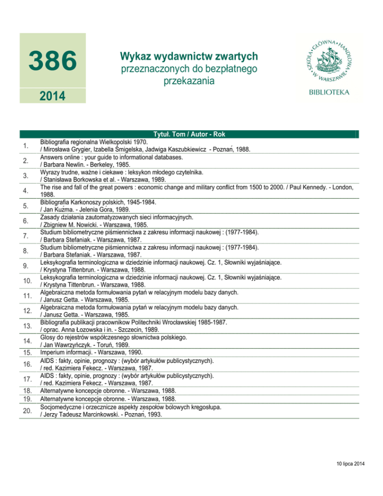 386 Wykaz wydawnictw zwartych przeznaczonych do bezpłatnego przekazania 2014 Tytuł. Tom / Autor - Rok 1. 2. 3. 4. 5. 6. 7. 8. 9. 10. 11. 12. 13. 14. 15. 16. 17. 18. 19. 20. Bibliografia regionalna Wielkopolski 1970. / Mirosława Grygier, Izabella Śmigelska, Jadwiga Kaszubkiewicz - Poznań, 1988. Answers online : your guide to informational databases. / Barbara Newlin. - Berkeley, 1985. Wyrazy trudne, ważne i ciekawe : leksykon młodego czytelnika. / Stanisława Borkowska et al. - Warszawa, 1989. The rise and fall of the great powers : economic change and military conflict from 1500 to 2000. / Paul Kennedy. - London, 1988. Bibliografia Karkonoszy polskich, 1945-1984. / Jan Kuźma. - Jelenia Góra, 1989. Zasady działania zautomatyzowanych sieci informacyjnych. / Zbigniew M. Nowicki. - Warszawa, 1985. Studium bibliometryczne piśmiennictwa z zakresu informacji naukowej : (1977-1984). / Barbara Stefaniak. - Warszawa, 1987. Studium bibliometryczne piśmiennictwa z zakresu informacji naukowej : (1977-1984). / Barbara Stefaniak. - Warszawa, 1987. Leksykografia terminologiczna w dziedzinie informacji naukowej. Cz. 1, Słowniki wyjaśniające. / Krystyna Tittenbrun. - Warszawa, 1988. Leksykografia terminologiczna w dziedzinie informacji naukowej. Cz. 1, Słowniki wyjaśniające. / Krystyna Tittenbrun. - Warszawa, 1988. Algebraiczna metoda formułowania pytań w relacyjnym modelu bazy danych. / Janusz Getta. - Warszawa, 1985. Algebraiczna metoda formułowania pytań w relacyjnym modelu bazy danych. / Janusz Getta. - Warszawa, 1985. Bibliografia publikacji pracownikow Politechniki Wrocławskiej 1985-1987. / oprac. Anna Łozowska i in. - Szczecin, 1989. Glosy do rejestrów współczesnego słownictwa polskiego. / Jan Wawrzyńczyk. - Toruń, 1989. Imperium informacji. - Warszawa, 1990. AIDS : fakty, opinie, prognozy : (wybór artykułów publicystycznych). / red. Kazimiera Fekecz. - Warszawa, 1987. AIDS : fakty, opinie, prognozy : (wybór artykułów publicystycznych). / red. Kazimiera Fekecz. - Warszawa, 1987. Alternatywne koncepcje obronne. - Warszawa, 1988. Alternatywne koncepcje obronne. - Warszawa, 1988. Socjomedyczne i orzecznicze aspekty zespołów bólowych kręgosłupa. / Jerzy Tadeusz Marcinkowski. - Poznań, 1993. 10 lipca 2014