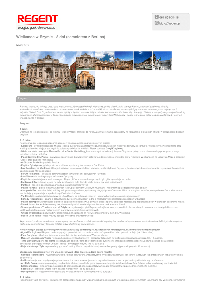 061 851-31-18 [email protected] Wielkanoc w Rzymie - 8 dni (samolotem z Berlina) Włochy Rzym Program Rzym to miasto, do którego przez całe wieki prowadziły wszystkie drogi. Niemal wszystkie ulice i zaułki starego Rzymu przemawiają do nas historią. Architektoniczne dzieła powstawały tu na przestrzeni setek wieków – od republiki, aż do czasów współczesnych były starannie tworzone przez największych artystów historii. Dziś Rzym to nowoczesne, tętniące życiem, niezasypiające miasto. Współczesność miesza się z tradycją i historią w niespotykanych nigdzie indziej proporcjach. Zwiedzanie Rzymu to niezapomniana przygoda, którą proponujemy przeżyć tej Wielkanocy - ponoć jedno życie człowieka nie wystarczy, by poznać włoską stolicę w całości. Program: 1 dzień: Odprawa na lotnisku i przelot do Rzymu – stolicy Włoch. Transfer do hotelu, zakwaterowanie, czas wolny na korzystanie z lokalnych atrakcji w zależności od godzin przylotu. 2 - 3 dzień: Kolejne dwa dni to czas na poznanie atmosfery miasta oraz jego najważniejszych miejsc: - Koloseum – symbol Wiecznego Miasta, jeden z cudów świata starożytnego, miejsce, w którym niegdyś odbywały się igrzyska, występy cyrkowe i teatralne oraz walki gladiatorów, miejsce szczególnie polecamy odwiedzić w Wielki Piątek podczas Drogi Krzyżowej - Wielkosobotnia uroczysta Msza w Bazylice Santa Maria Maggiore – uroczystość adoracji Jezusa Chrystusa, połączona z niesamowitą oprawą muzyczną z udziałem chórów i solistów - Plac i Bazylika Św. Piotra – najważniejsze miejsce dla wszystkich katolików, gdzie proponujemy udać się w Niedzielę Wielkanocną na uroczystą Mszę z orędziem ''Urbi et orbi'' papieża Franciszka - Grób Jana Pawła II – papieża Polaka - Kaplica Sykstyńska, gdzie podczas konklawe wybierany jest następca Św. Piotra - Łuk Konstantyna Wielkiego, który jest ostatnim wzniesionym łukiem triumfalnym starożytnego Rzymu, wybudowanym dla uhonorowania zwycięstwa Konstantyna Wielkiego nad Maksencjuszem - Forum Romanum – antyczne centrum spotkań towarzyskich i politycznych Rzymian - Plac Wenecki z zachwycającym Ołtarzem Ojczyzny - Kapitol – najważniejsze z siedmiu wzgórz Rzymu, które w czasach antycznych było głównym miejscem kultu - Fontanna di Trevi, której słynne na cały świat piękno było tłem do wielu filmów czy sesji zdjęciowych - Panteon - najlepiej zachowana pamiątka po czasach starożytnych - Piazza Navona – plac z fontanną Czterech Rzek, przepełniony ulicznymi muzykami i malarzami sprzedającymi swoje obrazy - Campo de’Fiori to najbardziej urokliwy zakątek starego miasta, opisywany niegdyś przez Czesława Miłosza, z targiem kwiatów, warzyw i owoców, a wieczorem zamieniający się w miejsce spotkań turystów i mieszkańców - Via Condotti – najbardziej ekskluzywna ulica Rzymu ze sklepami znanych i lubianych marek włoskich i zagranicznych - Schody Hiszpańskie – znane z pokazów mody i festiwali kwiatów, jedne z najdłuższych i najszerszych schodów w Europie - Piazza del Popolo wyróżniający się dzięki egipskiemu obeliskowi, a powyżej placu, z parku Borghese roztacza się zapierająca dech w piersiach panorama miasta - Zamek i most św. Anioła nazwany tak, aby upamiętnić ukazanie się cherubina na znak końca epidemii - Spacer po dzielnicy Trastevere, czyli Zatybrzu, najstarszej części Rzymu, pełnej brukowanych, wąskich uliczek, starych domostw porośniętych bluszczem, urokliwych restauracyjek, malowniczych skwerów oraz malutkich sal kinowych - Wyspa Tyberyjska z Bazyliką Św. Bartłomieja, gdzie złożone są relikwie męczenników m.in. Św. Wojciecha - Bocca Della Verita – Usta Prawdy będące wyrocznią prawdomówności W przerwach podczas zwiedzania proponujemy czas wolny na posiłek, podczas którego będzie możliwość spróbowania włoskich potraw, takich jak słynne pizze, makarony, cannelloni czy focaccia (płatne indywidualnie wg zamówienia). Ponadto Rzym oferuje szeroki wybór ciekawych atrakcji dodatkowych, realizowanych fakultatywnie, w zależności od czasu wolnego: - Ogród Zoologiczny Bioparco – działające już ponad sto lat zoo można zwiedzać spacerkiem lub z pokładu kolejki (ok. 15 euro/os.) - Park Borghese - idealne miejsce na spacer lub piknik z widokiem na Wieczne Miasto - Muzeum Leonardo da Vinci z rekonstrukcjami niezwykłych maszyn i pojazdów latających autorstwa renesansowego mistrza (ok. 12 euro/os.) - Time Elevator Experience Roma to ekscytująca podróż, która dzięki technologii cyfrowo-mechanicznej i stereoskopowej, pozwala cofnąć się w czasie i dowiedzieć się więcej o historii, nauce, sztuce i zwyczajach Rzymu (od 12 euro/os.) - Rejs statkiem po Tybrze pozwalający poznać stolicę Włoch z zupełnie innej, równie fascynującej perspektywy (ok. 18 euro/os.) Wieczorami proponujemy słynne włoskie rozrywki, które świetnie oddają ducha miasta: - Centrale Ristotheatre – wyśmienita włoska kolacja serwowana w towarzystwie występów teatralnych, koncertów jazzowych lub przedstawień kabaretowych (ok. 39 euro/os.) - La Rosetta – jedna z najsłynniejszych restauracji w mieście serwująca m.in. wyśmienite owoce morza (płatne indywidualnie wg zamówienia) - Art Cafe Roma – najpopularniejszy i najbardziej ekskluzywny klub, gdzie imprezy rozkręcają światowej sławy DJ-e (płatne indywidualnie wg zamówienia) - Koloseum nocą – niepowtarzalna okazja do spokojnego zbadania zakątków Amfiteatru Flawiuszów z przewodnikiem (ok. 25 euro/os.) - Spektakl w Teatro dell' Opera lub w Teatrze Narodowym (od 40 euro/os.) - Mecz piłkarski – niesamowite wrażenia dla wszystkich fanów ligi włoskiej(od 50 euro/os.) 4 - 7 dzień: Proponujemy jako dni wolne, która można przeznaczyć na zakupy w znanych butikach słynnych włoskich projektantów, takich jak Armani, czy Valentino, korzystanie z lokalnych atrakcji lub udział w wybranej wycieczce fakultaty