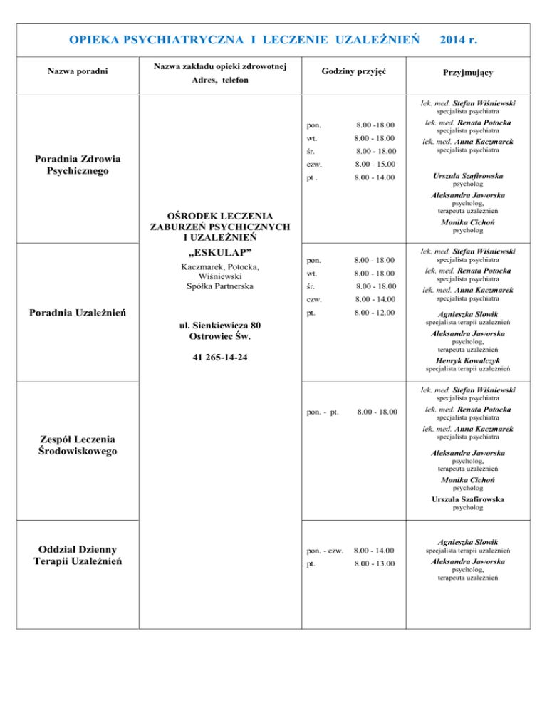 OPIEKA PSYCHIATRYCZNA I LECZENIE UZALEŻNIEŃ Nazwa poradni Nazwa zakładu opieki zdrowotnej Godziny przyjęć 2014 r. Przyjmujący Adres, telefon lek. med. Stefan Wiśniewski specjalista psychiatra Poradnia Zdrowia Psychicznego pon. 8.00 -18.00 lek. med. Renata Potocka wt. 8.00 - 18.00 lek. med. Anna Kaczmarek śr. 8.00 - 18.00 czw. 8.00 - 15.00 pt . 8.00 - 14.00 specjalista psychiatra specjalista psychiatra Urszula Szafirowska psycholog Aleksandra Jaworska psycholog, terapeuta uzależnień OŚRODEK LECZENIA ZABURZEŃ PSYCHICZNYCH I UZALEŻNIEŃ „ESKULAP” Kaczmarek, Potocka, Wiśniewski Spółka Partnerska Poradnia Uzależnień Monika Cichoń psycholog lek. med. Stefan Wiśniewski pon. 8.00 - 18.00 specjalista psychiatra wt. 8.00 - 18.00 lek. med. Renata Potocka śr. 8.00 - 18.00 lek. med. Anna Kaczmarek czw. 8.00 - 14.00 pt. 8.00 - 12.00 specjalista psychiatra specjalista psychiatra Agnieszka Słowik specjalista terapii uzależnień ul. Sienkiewicza 80 Ostrowiec Św. Aleksandra Jaworska psycholog, terapeuta uzależnień 41 265-14-24 Henryk Kowalczyk specjalista terapii uzależnień lek. med. Stefan Wiśniewski specjalista psychiatra pon. - pt. 8.00 - 18.00 lek. med. Renata Potocka specjalista psychiatra lek. med. Anna Kaczmarek specjalista psychiatra Zespół Leczenia Środowiskowego Aleksandra Jaworska psycholog, terapeuta uzależnień Monika Cichoń psycholog Urszula Szafirowska psycholog Oddział Dzienny Terapii Uzależnień Agnieszka Słowik pon. - czw. 8.00 - 14.00 specjalista terapii uzależnień pt. 8.00 - 13.00 Aleksandra Jaworska psycholog, terapeuta uzależnień lek. med. Agnieszka Maj – Lenartowicz specjalista psychiatra Poradnia Zdrowia Psychicznego pon. 10.00 - 20.00 wt. 7.00 - 20.00 śr. 7.00 - 20.00 czw. pt. 11.00 - 20.00 7.00 - 20.00 Renata Zagożdżon Ewa Wieczorek psycholog, psychoterapeuta psycholog , terapeuta uzależnień ul. Denkowska 8 Ostrowiec Św. Poradnia Uzależnień specjalista psychiatra Katarzyna Kutera Świętokrzyski Ośrodek Terapii 41 263-39-36 lek. med. Zbigniew Pastuszka lek. med. Agnieszka Maj – Lenartowicz pon. 10.00 - 20.00 wt. 8.00 - 20.00 śr. 7.00 - 18.30 czw. 7.30 - 15.30 Katarzyna Kutera pt. 7.00 - 13.30 psycholog, terapeuta uzależnień specjalista psychiatra lek. med. Zbigniew Pastuszka specjalista psychiatra Małgorzata Kraus certyfikowany specjalista terapii uzależnień , specjalista od substancji psychoaktywnych, pedagog Poradnia Środowiskowa pon . 7.00 - 20.30 wt. 7.00 - 20.30 śr. 14.00 - 20.30 czw. 9.00 - 20.30 pt. 13.00 - 20.30 sob. 10.00 - 20.00 lek. med. Agnieszka Maj – Lenartowicz specjalista psychiatra Renata Zagożdżon psycholog, psychoterapeuta Katarzyna Kutera psycholog, psychoterapeuta uzależnień Sporządził: Wydział Zdrowia i Spraw Społecznych Starostwa Powiatowego w Ostrowcu Św.