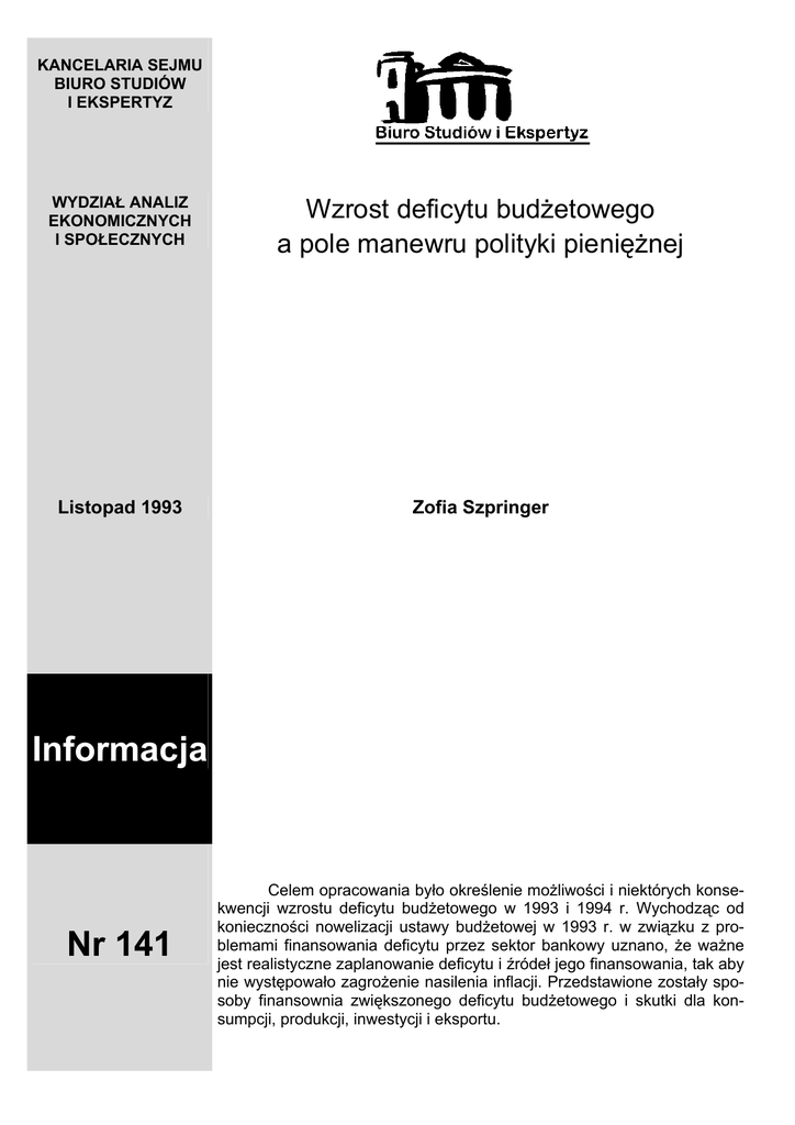 Nr 141. Wzrost deficytu budżetowego a pole manewru polityki