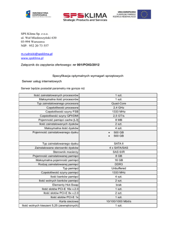 SPS Klima Sp. z o.o. ul. Wał Miedzeszyński 630 03-994 Warszawa NIP: 952 20 73 557 [email protected] www.spsklima.pl Załącznik do zapytania ofertowego: nr 001/POIG/2012 Specyfikacja optymalnych wymagań sprzętowych Serwer usług internetowych Serwer będzie posiadał parametry nie gorsze niż Ilość zainstalowanych procesorów 1 szt. Maksymalna ilość procesorów 1 szt. Typ zainstalowanego procesora Quad-Core Częstotliwość procesora 2,4 GHz Częstotliwość szyny FSB 1333 MHz Częstotliwość szyny QPI/DMI 2,5 GT/s Pojemność pamięci cache [L3] 8 MB Ilość zainstalowanych dysków 2 szt. Maksymalna ilość dysków 4 szt. Pojemność zainstalowanego dysku Typ zainstalowanego dysku Zainstalowane sterowniki dysków Sterownik macierzy 500 GB 500 GB SATA II 4 x SATA/SAS SAS 6/iR Pojemność zainstalowanej pamięci 8 GB Maksymalna pojemność pamięci 16 GB Rodzaj zainstalowanej pamięci DDR3 Typ pamięci Unbuffered Częstotliwość szyny pamięci 1333 MHz Ilość banków pamięci 4 szt. Ilość wolnych banków pamięci 2 szt. Elementy Hot-Swap brak Ilość slotów PCI-E 16x v.2.0 1 szt. Ilość slotów PCI-E 8x v.2.0 2 szt. Ilość slotów PCI-E 1x 1 szt. Karta sieciowa Ilość wolnych kieszeni 5,25 (zewnętrznych) 10/100/1000 Mbit/s 1 szt. Ilość wolnych kieszeni 3,5 (wewnętrznych) 2 szt. Ilość półek na dyski Non Hot Swap 4 szt. Ilość półek na dyski Hot Swap 0 szt. Napędy wbudowane (zainstalowane) DVD±RW Ilość zasilaczy 1 szt. Moc zasilacza (zasilaczy) 305 Wat Dodatkowe informacje Dwa gniazda PCI-E x8 (jedno ze złączem x16) Jedno gniazdo PCI-E x4 (ze złączem x8) SAS 6/iR (RAID 0,1)