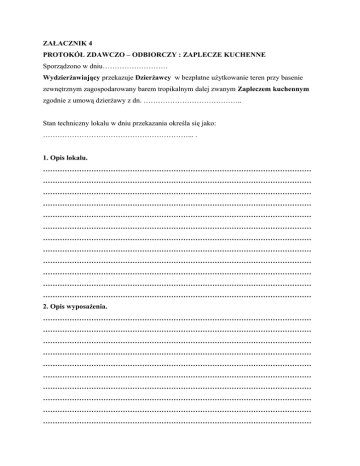 ZAŁACZNIK 4 PROTOKÓŁ ZDAWCZO – ODBIORCZY : ZAPLECZE KUCHENNE Sporządzono w dniu……………………… Wydzierżawiający przekazuje Dzierżawcy w bezpłatne użytkowanie teren przy basenie zewnętrznym zagospodarowany barem tropikalnym dalej zwanym Zapleczem kuchennym zgodnie z umową dzierżawy z dn. ………………………………….. Stan techniczny lokalu w dniu przekazania określa się jako: ……………………………………………………... . 1. Opis lokalu. ………………………………………………………………………………………………… ………………………………………………………………………………………………… ………………………………………………………………………………………………… ………………………………………………………………………………………………… ………………………………………………………………………………………………… ………………………………………………………………………………………………… ………………………………………………………………………………………………… ………………………………………………………………………………………………… ………………………………………………………………………………………………… ………………………………………………………………………………………………… ………………………………………………………………………………………………… ………………………………………………………………………………………………… 2. Opis wyposażenia. ………………………………………………………………………………………………… ………………………………………………………………………………………………… ………………………………………………………………………………………………… ………………………………………………………………………………………………… ………………………………………………………………………………………………… ………………………………………………………………………………………………… ………………………………………………………………………………………………… ………………………………………………………………………………………………… ………………………………………………………………………………………………… ………………………………………………………………………………………………… ………………………………………………………………………………………………… ………………………………………………………………………………………………… 3. Inne ustalenia (media oraz klucze) ………………………………………………………………………………………………… ………………………………………………………………………………………………… ………………………………………………………………………………………………… ………………………………………………………………………………………………… ………………………………………………………………………………………………… ………………………………………………………………………………………………… ………………………………………………………………………………………………… ………………………………………………………………………………………………… ………………………………………………………………………………………………… ………………………………………………………………………………………………… ………………………………………………………………………………………………… ………………………………………………………………………………………………… 4. Inne ustalenia poczynione w dniu przekazania lokalu Najemcy. ………………………………………………………………………………………………… ………………………………………………………………………………………………… ………………………………………………………………………………………………… ………………………………………………………………………………………………… ………………………………………………………………………………………………… ………………………………………………………………………………………………… ………………………………………………………………………………………………… ………………………………………………………………………………………………… ………………………………………………………………………………………………… ………………………………………………………………………………………………… ………………………………………………………………………………………………… ………………………………………………………………………………………………… 