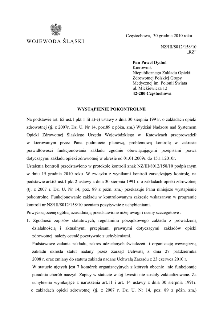 Częstochowa, 30 grudnia 2010 roku WO J E WO D A Ś LĄ S KI NZ/III/8012/158/10 „RZ” Pan Paweł Dydoń Kierownik Niepublicznego Zakładu Opieki Zdrowotnej Polskiej Grupy Medycznej im. Polonii Świata ul. Mickiewicza 12 42-200 Częstochowa WYSTĄPIENIE POKONTROLNE Na podstawie art. 65 ust.1 pkt 1 lit a)-e) ustawy z dnia 30 sierpnia 1991r. o zakładach opieki zdrowotnej (tj. z 2007r. Dz. U. Nr 14, poz.89 z późn. zm.) Wydział Nadzoru nad Systemem Opieki Zdrowotnej Śląskiego Urzędu Wojewódzkiego w Katowicach przeprowadził w kierowanym przez Pana podmiocie planową, problemową kontrolę w zakresie prawidłowości funkcjonowania zakładu zgodnie obowiązującymi przepisami prawa dotyczącymi zakładu opieki zdrowotnej w okresie od 01.01.2009r. do 15.11.2010r. Ustalenia kontroli przedstawiono w protokole kontroli znak NZ/III/8012/158/10 podpisanym w dniu 15 grudnia 2010 roku. W związku z wynikami kontroli zarządzający kontrolę, na podstawie art.65 ust.1 pkt 2 ustawy z dnia 30 sierpnia 1991 r. o zakładach opieki zdrowotnej (tj. z 2007 r. Dz. U. Nr 14, poz. 89 z późn. zm.) przekazuje Panu niniejsze wystąpienie pokontrolne. Funkcjonowanie zakładu w kontrolowanym zakresie wskazanym w programie kontroli nr NZ/III/8012/158/10 oceniam pozytywnie z uchybieniami. PowyŜszą ocenę ogólną uzasadniają przedstawione niŜej uwagi i oceny szczegółowe : 1. Zgodność zapisów statutowych, regulaminu porządkowego zakładu z prowadzoną działalnością i aktualnymi przepisami prawnymi dotyczącymi zakładów opieki zdrowotnej naleŜy ocenić pozytywnie z uchybieniami. Podstawowe zadania zakładu, zakres udzielanych świadczeń i organizację wewnętrzną zakładu określa statut nadany przez Zarząd Uchwałą z dnia 27 października 2008 r. oraz zmiany do statutu zakładu nadane Uchwałą Zarządu z 23 czerwca 2010 r. W statucie ujętych jest 7 komórek organizacyjnych z których obecnie nie funkcjonuje poradnia chorób naczyń. Zapisy w statucie w tej kwestii nie zostały zaktualizowane. Za uchybienia wynikające z naruszenia art.11 i art. 14 ustawy z dnia 30 sierpnia 1991r. o zakładach opieki zdrowotnej (tj. z 2007 r. Dz. U. Nr 14, poz. 89 z późn. zm.) odpowiedzialny jest kierownik Niepublicznego Zakładu Opieki Zdrowotnej Polskiej Grupy Medycznej im. Polonii Świata Pan Paweł Dydoń. Organizację i porządek procesu udzielania świadczeń zdrowotnych Zakładu określa regulamin porządkowy. Zakres tego regulaminu nie wyczerpuje wszystkich postanowień z art.18a ustawy z dnia 30 sierpnia 1991r.o zakładach opieki zdrowotnej (tj. z 2007r. Dz. U. Nr 14, poz. 89 z późn. zm.), a w szczególności sposobu prowadzenia i przechowywania dokumentacji w zakładzie. Część regulaminu dotycząca praw pacjenta nie została zaktualizowana o przywołanie aktualnej ustawy o prawach pacjenta i Rzeczniku Praw Pacjenta z 6 listopada 2008 r. (Dz. U. z 2009r. Nr 52, poz. 417 z późn. zm.). Regulamin porządkowy nie zawiera zapisu czasu obowiązywania ani daty jego podpisania przez kierownika zakładu. Za uchybienia wynikające z naruszenia art.18a ust.1 pkt.1a ppkt.2) ustawy z dnia 30 sierpnia 1991 r. o zakładach opieki zdrowotnej (tj. z 2007r. Dz.U. Nr 14, poz. 89 z późn. zm.) odpowiedzialny jest kierownik zakładu Pan Paweł Dydoń. Oprócz pełnej nazwy zakładu usankcjonowanej decyzją Wojewody tj: Niepubliczny Zakład Opieki Zdrowotnej Polskiej Grupy Medycznej im. Polonii Świata, zakład umieścił równieŜ na zewnątrz budynku i w oddziale szpitalnym uŜywaną nazwę potoczną zakładu tj. Częstochowskie Regionalne Centrum Chorób Serca i Naczyń. Podobne nazwy (Regionalne Centrum...) jak wynika ze statutu i regulaminu porządkowego stosowane są w innych miejscowościach, w których zakład prowadzi działalność medyczną tj: w Sosnowcu i Kluczborku. Nazwy te nie są uwzględnione w aktualnej księdze rejestrowej. W statucie i regulaminie porządkowym zakładu nazwa ta jest wyartykułowana jako nazwa jednostki zakładu, w skład której wchodzą poszczególne komórki organizacyjne. Za stwierdzone uchybienia wynikające z naruszenia art. 43 kodeksu cywilnego (Dz. U. z 1964r. Nr 16, poz. 93 z późn. zm) odpowiedzialny jest kierownik Niepublicznego Zakładu Opieki Zdrowotnej Polskiej Grupy Medycznej im. Polonii Świata Pan Paweł Dydoń. 2. Zgodność prowadzonej działalności i dokumentacji zakładu z zapisami rejestru zakładów opieki zdrowotnej naleŜy ocenić pozytywnie z uchybieniami. Kierownik zakładu, lek. med. Paweł Dydoń, nie zgłosił, stosownie do zapisów z art.14 ustawy z dnia 30 sierpnia 1991r. o zakładach opieki zdrowotnej (tj. z 2007r. Dz.U. Nr 14, poz. 89 z późn. zm.), zaistniałych zmian do rejestru zakładów opieki zdrowotnej w zakresie niewłaściwych zapisów w statucie dotyczących zadań i struktury organizacyjnej zakładu. 2 Kierownik nie złoŜył teŜ do rejestru zakładów opieki zdrowotnej zmian do regulaminu porządkowego ujmujących faktyczny zakres świadczeń zdrowotnych Niepublicznego Zakładu Opieki Zdrowotnej Polskiej Grupy Medycznej im. Polonii Świata co jest naruszeniem § 2 rozporządzenia Ministra Zdrowia z dnia 9 października 2007 r. zmieniającym rozporządzenie w sprawie rejestru zakładów opieki zdrowotnej (Dz. U. z 2007 r. Nr 196, poz.1424). Pouczono kierownika zakładu Pana Pawła Dydonia, Ŝe poradnia chorób naczyń powinna być usunięta z zapisów statutu i regulaminu porządkowego zakładu oraz, Ŝe zobowiązany jest złoŜyć wniosek do rejestru zakładów opieki zdrowotnej o wprowadzenie zmian w księdze rejestrowej zakładu, jednocześnie wprowadzając nazwy regionalnych centrów w Częstochowie, Sosnowcu i Kluczborku i uzyskać na to stosowną decyzję wojewody. Natomiast w dziale III księgi rejestrowej przypisać do poszczególnych centrów funkcjonujące w nich komórki organizacyjne. Mając na uwadze powyŜszą ocenę i uwagi wnoszę o: 1. Przestrzeganie przepisów prawa dotyczących działania zakładu opieki