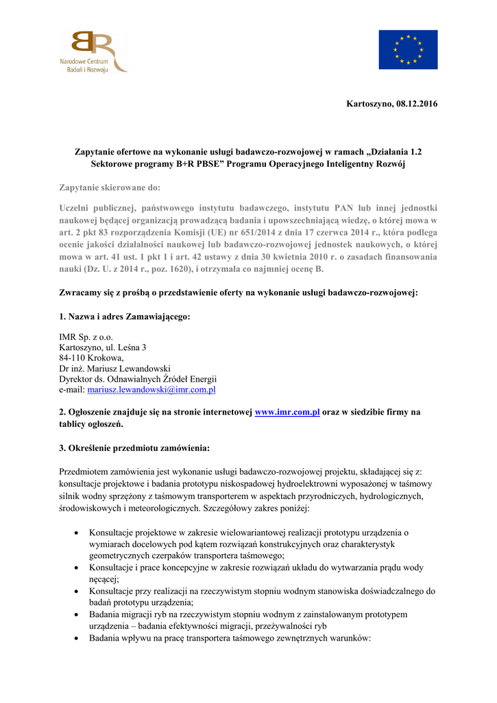 Kartoszyno, 08.12.2016 Zapytanie ofertowe na wykonanie usługi badawczo-rozwojowej w ramach „Działania 1.2 Sektorowe programy B+R PBSE” Programu Operacyjnego Inteligentny Rozwój Zapytanie skierowane do: Uczelni publicznej, państwowego instytutu badawczego, instytutu PAN lub innej jednostki naukowej będącej organizacją prowadzącą badania i upowszechniającą wiedzę, o której mowa w art. 2 pkt 83 rozporządzenia Komisji (UE) nr 651/2014 z dnia 17 czerwca 2014 r., która podlega ocenie jakości działalności naukowej lub badawczo-rozwojowej jednostek naukowych, o której mowa w art. 41 ust. 1 pkt 1 i art. 42 ustawy z dnia 30 kwietnia 2010 r. o zasadach finansowania nauki (Dz. U. z 2014 r., poz. 1620), i otrzymała co najmniej ocenę B. Zwracamy się z prośbą o przedstawienie oferty na wykonanie usługi badawczo-rozwojowej: 1. Nazwa i adres Zamawiającego: IMR Sp. z o.o. Kartoszyno, ul. Leśna 3 84-110 Krokowa, Dr inż. Mariusz Lewandowski Dyrektor ds. Odnawialnych Źródeł Energii e-mail: [email protected] 2. Ogłoszenie znajduje się na stronie internetowej www.imr.com.pl oraz w siedzibie firmy na tablicy ogłoszeń. 3. Określenie przedmiotu zamówienia: Przedmiotem zamówienia jest wykonanie usługi badawczo-rozwojowej projektu, składającej się z: konsultacje projektowe i badania prototypu niskospadowej hydroelektrowni wyposażonej w taśmowy silnik wodny sprzężony z taśmowym transporterem w aspektach przyrodniczych, hydrologicznych, środowiskowych i meteorologicznych. Szczegółowy zakres poniżej: Konsultacje projektowe w zakresie wielowariantowej realizacji prototypu urządzenia o wymiarach docelowych pod kątem rozwiązań konstrukcyjnych oraz charakterystyk geometrycznych czerpaków transportera taśmowego; Konsultacje i prace koncepcyjne w zakresie rozwiązań układu do wytwarzania prądu wody nęcącej; Konsultacje przy realizacji na rzeczywistym stopniu wodnym stanowiska doświadczalnego do badań prototypu urządzenia; Badania migracji ryb na rzeczywistym stopniu wodnym z zainstalowanym prototypem urządzenia – badania efektywności migracji, przeżywalności ryb Badania wpływu na pracę transportera taśmowego zewnętrznych warunków: o o o hydrologicznych; meteorologicznych; środowiskowych; Kod CPV usługi: 73100000-3 Usługi badawcze i eksperymentalno-rozwojowe 4. Termin wykonania zamówienia: Od dnia zawarcia umowy na wykonanie badań przez okres 25 miesięcy 5. Kryteria oraz sposób oceny ofert W postępowaniu przyjęte zostaną następujące kryteria oceny ofert: Cena 90%, Termin wykonania, mierzony jako ilość miesięcy: 10%, Punktacja za spełnienie danego kryterium oceny oferty będzie przyznawana proporcjonalnie do wag procentowych przedstawionych powyżej. Punkty przyznane każdej ofercie w kryterium cena wyliczane będą według wzoru: Cn x 100 Pc =----------------- x kc Cb Pc – otrzymane punkty Cn – cena najniższa spośród złożonych ofert Cb – cena badanej oferty kc – udział kryterium ceny w całości oceny = 0,7 Punkty przyznane w kryterium termin wykonania wyliczane będą według wzoru PTW TW n x 100 =----------------- x ktw TW b PTW – otrzymane punkty w kryterium Termin Wykonania TWn – najkrótszy Termin Wykonania (liczba miesięcy) TW b – Termin Wykonania w badanej ofercie ktw – udział kryterium w całości oceny = 0,3 Całkowita liczba przyznanych punktów będzie równa sumie punktów uzyskanych we wszystkich kryteriach: P=Pc+PS. Zamawiający udzieli zamówienia Wykonawcy, który uzyska największą liczbę punktów tj. sumę punktów P przyznanych w ww. kryteriach. Punkty obliczane będą z dokładnością do dwóch miejsc po przecinku. Wartości będą zaokrąglane zgodnie z matematycznymi zasadami zaokrąglania liczb. Oferta z najwyższą liczbą punktów odpowiadająca wszystkim wymaganiom określonym w niniejszym zapytaniu zostanie wybrana przez Zamawiającego jako najkorzystniejsza. Jeżeli w postępowaniu nie można będzie wybrać oferty najkorzystniejszej z uwagi na to, że dwie lub więcej ofert przedstawia taki sam bilans ceny i innych kryteriów oceny ofert, zamawiający spośród tych ofert wybiera ofertę z niższą ceną. 6. Warunki udziału w postępowaniu: Do współpracy zaproszone zostaną tylko jednostki naukowo-badawcze, których parametryzacja zakończyła się uzyskaniem kategorii A lub B. Jednostka będzie musiała podać min. informacje potwierdzające doświadczenie oraz odpowiednie zasoby techniczno-kadrowe: - informacje o osobach zaangażowanych w usługę wraz z opisem ich doświadczenia naukowego (patenty, publikacje, udział w projektach, realizacja usług w takim samym lub podobnym zakresie), - informacje o posiadanych zasobach technicznych koniecznych do zrealizowania usługi, 7. Miejsce i termin składania ofert: Drogą mailową na adres: [email protected] Osobiście w siedzibie firmy: IMR Sp. z o.o. Kartoszyno, ul. Leśna 3, 84-110 Krokowa Drogą pocztową na adres: IMR Sp. z o.o. Kartoszyno, ul. Leśna 3, 84-110 Krokowa Termin składania ofert: 08.12.2016 – 16.12.2016, do godz. 08.00 (liczy się data wpływu oferty) W przypadku wysłania oferty pocztą, na kopercie musi być adnotacja: „Oferta w postępowaniu na wykonanie usługi badawczo-rozwojowej w ramach „Działania 1.2 Sektorowe programy B+R PBSE” Programu Operacyjnego Inteligentny Rozwój Nie otwierać do dnia 16.12.2016 r. do godz. 08.00.” Na kopercie musi być również czytelna nazwa Wykonawcy i adres Wykonawcy. Zamawiający nie ponosi odpowiedzialności za przypadkowe otwarcie oferty w sytuacji niezgodnego z powyższym sposobem opisania oferty. Oferty złożone po terminie zostaną niezwłocznie zwrócone bez otwierania. 8. Informacje na temat zakresu wykluczenia Oferty nie może złożyć podmiot powiązany osobowo lub kapitałowo z Zamawiającym. Przez powiązania kapitałowe lub osobowe rozumie się wzajemne powiązania między Zamawiającym lub osobami upoważnionymi do zaciągania zobowiązań w i