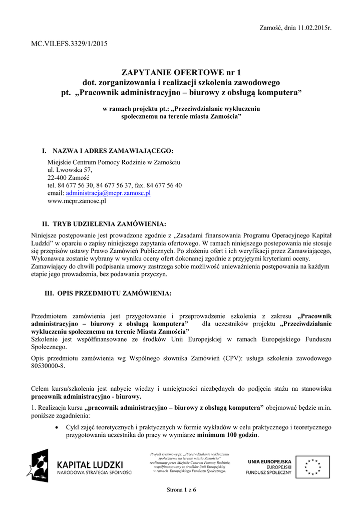 Zamość, dnia 11.02.2015r. MC.VII.EFS.3329/1/2015 ZAPYTANIE OFERTOWE nr 1 dot. zorganizowania i realizacji szkolenia zawodowego pt. „Pracownik administracyjno – biurowy z obsługą komputera” w ramach projektu pt.: „Przeciwdziałanie wykluczeniu społecznemu na terenie miasta Zamościa” I. NAZWA I ADRES ZAMAWIAJĄCEGO: Miejskie Centrum Pomocy Rodzinie w Zamościu ul. Lwowska 57, 22-400 Zamość tel. 84 677 56 30, 84 677 56 37, fax. 84 677 56 40 email: [email protected] www.mcpr.zamosc.pl II. TRYB UDZIELENIA ZAMÓWIENIA: Niniejsze postępowanie jest prowadzone zgodnie z „Zasadami finansowania Programu Operacyjnego Kapitał Ludzki” w oparciu o zapisy niniejszego zapytania ofertowego. W ramach niniejszego postepowania nie stosuje się przepisów ustawy Prawo Zamówień Publicznych. Po złożeniu ofert i ich weryfikacji przez Zamawiającego, Wykonawca zostanie wybrany w wyniku oceny ofert dokonanej zgodnie z przyjętymi kryteriami oceny. Zamawiający do chwili podpisania umowy zastrzega sobie możliwość unieważnienia postępowania na każdym etapie jego prowadzenia, bez podawania przyczyn. III. OPIS PRZEDMIOTU ZAMÓWIENIA: Przedmiotem zamówienia jest przygotowanie i przeprowadzenie szkolenia z zakresu „Pracownik administracyjno – biurowy z obsługą komputera” dla uczestników projektu „Przeciwdziałanie wykluczeniu społecznemu na terenie Miasta Zamościa” Szkolenie jest współfinansowane ze środków Unii Europejskiej w ramach Europejskiego Funduszu Społecznego. Opis przedmiotu zamówienia wg Wspólnego słownika Zamówień (CPV): usługa szkolenia zawodowego 80530000-8. Celem kursu/szkolenia jest nabycie wiedzy i umiejętności niezbędnych do podjęcia stażu na stanowisku pracownik administracyjno - biurowy. 1. Realizacja kursu „pracownik administracyjno – biurowy z obsługą komputera” obejmować będzie m.in. poniższe zagadnienia: Cykl zajęć teoretycznych i praktycznych w formie wykładów w celu praktycznego i teoretycznego przygotowania uczestnika do pracy w wymiarze minimum 100 godzin. Projekt systemowy pt. „Przeciwdziałanie wykluczeniu społecznemu na terenie miasta Zamościa” realizowany przez Miejskie Centrum Pomocy Rodzinie, współfinansowany ze środków Unii Europejskiej w ramach Europejskiego Funduszu Społecznego. Strona 1 z 6 wydanie certyfikatu lub zaświadczenia potwierdzającego uczestnictwo oraz ukończenie kursu, zapewnienie materiałów szkoleniowych dla każdego z uczestników szkolenia, zorganizowanie i przeprowadzenie egzaminu jeżeli jest potrzebny dla potwierdzenia nabytych umiejętności, w przypadku gdy odrębne przepisy dla potwierdzenia nabytych umiejętności wymagają podejścia do egzaminu państwowego, a egzamin ten jest płatny Wykonawca jest zobowiązany pokryć koszty uczestnictwa w egzaminie (w przypadku gdy uczestnik nie zda egzaminu, koszty ewentualnego egzaminu poprawkowego Uczestnik pokrywa we własnym zakresie), zapewnienie i opłacenie potrzebnych badań lekarskich jeśli są wymagane zgodnie ze specyfiką szkolenia zajęcia teoretyczne co do zasady powinny odbywać się w dniach roboczych, tj. od poniedziałku do piątku, w uzasadnionych przypadkach zajęcia te mogą odbywać się również w weekend, natomiast zajęcia praktyczne na bieżąco uzgadniane będą pomiędzy podwykonawcą a uczestnikami kursu. ilość uczestników – 7 osób (Ilość uczestników może ulec zmianie o +/- 2 osoby) uczestnik może być dołączony do grupy szkoleniowej miejscem realizacji kursu jest miasto Zamość w województwie lubelskim. 2. Zamawiający dopuszcza/ nie dopuszcza możliwości składania ofert częściowych 3. Zamawiający dopuszcza/ nie dopuszcza możliwości powierzenia części lub całości zamówienia podwykonawcom. IV. TERMIN WYKONANIA ZAMÓWIENIA: Rozpoczęcie szkoleń: po podpisaniu umowy i przekazaniu listy uczestników (przewidywany termin od lutego 2015r. do maksymalnie 15 marca 2015 roku) Dokładny termin realizacji każdego kierunku szkolenia zostanie ustalony z firmą, której zlecone zostanie zrealizowanie niniejszego zamówienia.. V. OSOBY UPRAWNIONE DO POROZUMIENIA SIĘ Z WYKONAWCAMI: Osobą uprawnioną do kontaktów z Wykonawcami jest: Marcin Stopa, Tel. 84 677 56 39, [email protected] VI. OPIS WARUNKÓW UDZIAŁU W POSTĘPOWANIU ORAZ OPIS SPOSOBU DOKONYWANIA OCENY SPEŁNIENIA TYCH WARUNKÓW: 1. W postępowaniu mogą wziąć udział Wykonawcy, którzy: posiadają uprawnienia do wykonywania określonej działalności lub czynności, jeżeli ustawy nakładają obowiązek posiadania takich uprawnień, Warunek ten zostanie spełniony, jeżeli Wykonawca wykaże, że: Jest instytucją szkoleniową w rozumieniu ustawy z dnia 20 kwietnia 2004r o promocji zatrudnienia i instytucjach rynku pracy (tekst jednolity: Dz. U. z 2008r Nr 69, poz.415 z późn. zm.). – posiada wpis do rejestru instytucji szkoleniowych. Wykonawca powinien dołączyć do oferty kserokopie zaświadczenia o wpisie do RIS. posiadają niezbędną wiedzę i doświadczenie oraz potencjał techniczny, dysponują osobami zdolnymi do wykonania zamówienia, znajdują się w sytuacji ekonomicznej i finansowej zapewniającej wykonanie Zamówienia, nie są objęci postępowaniem upadłościowym i likwidacyjnym, Projekt systemowy pt. „Przeciwdziałanie wykluczeniu społecznemu na terenie miasta Zamościa” realizowany przez Miejskie Centrum Pomocy Rodzinie, współfinansowany ze środków Unii Europejskiej w ramach Europejskiego Funduszu Społecznego. Strona 2 z 6 2. W zapytaniu ofertowym nie mogą brać udziału: Oferenci, którzy nie spełniają warunków udziału w postępowaniu, tj. nie posiadają uprawnień do wykonywania określonej działalności. VII. OPIS SPOSOBU PRZYGOTOWANIA OFERTY: 1. Oferta powinna być sporządzona w języku polskim , na komputerze lub inna trwałą, czytelną techniką 2. Każdy Wykonawca może złożyć tylko jedną ofertę obejmującą przedmiot zamówienia. 3. Oferta winna być sporządzona wedłu