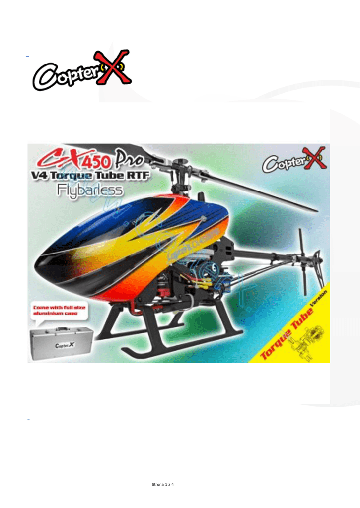 Strona 1 z 4 Strona 2 z 4 CopterX CX 450PRO V4 Flybarless Torque Tube Version 2.4GHz RTF Zestaw dostarczany w 100% złożony i gotowy do lotu, przeznaczony jest dla pilotów poszukujących najlepszych helikopterów klasy 450 na rynku. Helikopter CopterX CX450 PRO został zaprojektowany do wykonywania wymagających lotów przy jednoczesnej łatwej obsłudze serwisowej. Wykonany z najlepszych materiałów dostępnych na rynku CopterX CX450 jest liderem w swojej klasie. Wersja 4 dostępna jest jedynie w wersji bez drążka stabilizacyjnego ( flybarless ) , dzięki czemu lepiej nadaje się do lotów 3D. Wersja z wałkiem napędzającym wirnik ogonowy, zapewnia maksymalną precyzję sterowania. 3-osiowy żyroskop zapewnia maksymalną stabilność lotu. W zestawie efektowna i praktyczna aluminiowa walizka mieszcząca cały zestaw. Właściwości: Wytrzymalsza głowica wirnika ( w porównaniu do v3 ) zapewniająca sztywność, stateczność i zwrotność Zmieniona rama główna ( w porównaniu do v3 ) Łoże łożyska wykonane ze stopu aluminium z jednoczęściowym mocowaniem serwa Jednoczęściowa blokada rotacji tarczy sterującej zintegrowana z mocowaniem żyroskopu Wytrzymałe, jednoczęściowe podwozie Wirnik wykonany ze stopu aluminium zapewniający wysoką zwrotność Pełne ułożyskowanie zapewniające dokładne i precyzyjne sterowanie Kompozytowe mocowanie akumulatorów, umieszczone z przodu dla lepszego rozkładu masy Jednoczęściowa, wytrzymała rama wykonana z włókna węglowego Precyzyjny wirnik ogonowy napędzany wałkiem Metalowe uchwyty łopatek wirnika ogonowego zapewniające dokładne sterowanie Serwo wirnika ogonowego przesunięte do środka zapewnia lepsze położenie środka ciężkości Opływowa i lekka obudowa wykonana z włókna szklanego z przezroczystym okienkiem Jednokierunkowe łożysko systemu auto-rotacji Specyfikacja: Długość: 635mm Wysokość: 230mm Strona 3 z 4 Średnica wirnika głównego: 710mm Średnica wirnika ogonowego 158mm Zębatka silnika: 14T Zębatka główna: 150T Zębatka autorotacji: 106T Zębatka śmigła ogonowego: 25T Przełożenie: 1:11.5:4.24 Waga(bez elektroniki): 470g Waga modelu gotowego do lotu: około. 780g Zestaw zawiera: CopterX CX450PRO V4 Flybarless Torque Tube Version Kit x 1 CopterX 2.4GHz 6-kanałowy Transmitter CX-CT6C & Receiver x 1 CopterX (CX-9G) 9G Servo X 3 Fusonic (MG-D-9257-V2) 9257 25g Metal Gear High Speed Mini Digital Servo X 1 CopterX (CX-3X1000) Flybarless 3 Axis Gyro System X 1 CopterX (CX-ESC-40A) 40A V2 Brushless Electronic Speed Controller X 1 CopterX (CX450-10-04) 430XL Brushless Motor (3550KV) X 1 Aluminiowa walizka x 1 CopterX ładowarka akumulatorów LiPo x 1 CopterX Li-Polymer Battery 11.1V 15C 2200mAh x 1 Zobacz filmy Strona 4 z 4