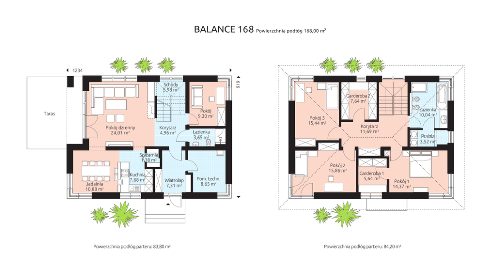 BALANCE 168 Powierzchnia podłóg 168,00 m 2 919 1234 Schody 5,98 m2 Garderoba 2 7,64 m2 Pokój 9,30 m2 Taras Pokój dzienny 24,01 m2 Korytarz 4,96 m2 Jadalnia 10,88 m2 Pokój 3 15,44 m2 Korytarz 11,69 m2 Łazienka 3,65 m2 Spiżarnia 1,38 m2 Kuchnia 7,68 m2 Łazienka 10,04 m2 Pokój 2 15,86 m2 Wiatrołap 7,31 m2 Powierzchnia podłóg parteru: 83,80 m² Pom. techn. 8,65 m2 Garderoba 1 5,64 m2 Pralnia 3,52 m2 Pokój 1 14,37 m2 Powierzchnia podłóg parteru: 84,20 m²