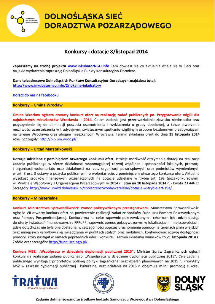 Konkursy i dotacje 8/listopad 2014 Zapraszamy na stronę projektu www.inkubatorNGO.info Tam dowiesz się co aktualnie dzieje się w Sieci oraz na jakie wydarzenia zapraszają Dolnośląskie Punkty Konsultacyjno-Doradcze. Dane teleadresowe Dolnośląskich Punktów Konsultacyjno-Doradczych znajdziesz tutaj: http://www.inkubatorngo.info/2/lokalne-inkubatory Dołącz do nas na facebooku Konkursy – Gmina Wrocław Gmina Wrocław ogłasza otwarty konkurs ofert na realizację zadań publicznych pn. Przygotowanie wigilii dla najuboższych mieszkańców Wrocławia – 2014. Celem zadania jest przeciwdziałanie zjawisku niedostatku oraz przyczynienie się do eliminacji poczucia osamotnienia i wykluczenia u grupy docelowej, a także stworzenie możliwości uczestniczenia w tradycyjnym, świątecznym spotkaniu wigilijnym osobom bezdomnym przebywającym na terenie Wrocławia oraz ubogim mieszkańcom Wrocławia. Termin składania ofert do dnia 25 listopada 2014 roku. Szczegóły: http://bip.um.wroc.pl/. Konkursy – Urząd Marszałkowski Dotacje udzielane z pominięciem otwartego konkursu ofert. Istnieje możliwość otrzymania dotacji na realizację zadania publicznego w sferze działalności wspomagającej rozwój wspólnot i społeczności lokalnych, promocji i organizacji wolontariatu oraz działalności na rzecz organizacji pozarządowych oraz podmiotów wymienionych w art. 3 ust. 3 ustawy o pożytku publicznym i o wolontariacie, z pominięciem otwartego konkursu ofert. Aktualna wysokość środków finansowych przeznaczonych na dotacje udzielane w trybie art. 19a (pozakonkursowym) w Wydziale Współpracy z Organizacjami Pozarządowymi w 2014 r.: Stan na 10 listopada 2014 r. - kwota 23 446 zł. Szczegóły: http://www.umwd.dolnyslask.pl/spoleczenstwoobywatelskie/dotacje-w-trybie-art-19a/. Konkursy – Ministerialne Konkurs Ministerstwa Sprawiedliwości: Pomoc pokrzywdzonym przestępstwem. Ministerstwo Sprawiedliwości ogłosiło VII otwarty konkurs ofert na powierzenie realizacji zadań ze środków Funduszu Pomocy Pokrzywdzonym oraz Pomocy Postpenitencjarnej. Konkurs ma na celu: zapewnić pokrzywdzonym i członkom ich rodzin dostęp do oferty świadczeń finansowanych z FPPoPP, zapewnić pomoc pokrzywdzonym w lokalizacjach i miejscowościach, gdzie dotychczas nie była ona dostępna, w szczególności poprzez uruchomienie pomocy na terenach gmin wiejskich oraz mniejszych ośrodków i jej świadczenie w punktach stałych oraz mobilnych, kontynuować rozwój dostępności pomocy, który nastąpił w ramach poprzednich edycji konkursu. Termin składania wniosków to 21 listopada 2014 r. Źródło oraz szczegóły: http://fundusze.ngo.pl/. Konkurs MSZ: „Współpraca w dziedzinie dyplomacji publicznej 2015”. Minister Spraw Zagranicznych ogłosił konkurs na realizację zadania publicznego: „Współpraca w dziedzinie dyplomacji publicznej 2015”. Cele zadania publicznego wynikają z priorytetów polskiej polityki zagranicznej oraz działań planowanych na 2015 r. Priorytety MSZ w zakresie dyplomacji publicznej i kulturalnej oraz działania na 2015 r. obejmują m.in.: promocję sukcesu Zadanie dofinansowano ze środków budżetu Samorządu Województwa Dolnośląskiego Polski regionalnej i lokalnej, promocję sukcesu transformacji gospodarczej, promocję działań na rzecz demokratyzacji, rozwoju społeczeństw obywatelskich i ochrony praw człowieka na świecie etc. Oferty należy składać do 21 listopada 2014. Źródło oraz szczegóły: http://fundusze.ngo.pl/. Konkurs Ministerstwa Sportu i Turystyki: Realizacja zadań publicznych z zakresu turystyki na rok 2015. Departament Turystyki Ministerstwa Sportu i Turystyki ogłosił otwarty konkurs ofert na realizację zadań publicznych z zakresu turystyki na rok 2015 i zaprasza do składania ofert. Oferty należy składać w Kancelarii Ogólnej Ministerstwa Sportu i Turystyki ul. Senatorska 14 Warszawa lub przesyłać na adres Ministerstwa Sportu i Turystyki Departament Turystyki ul. Senatorska 14, 00-082 Warszawa (liczy się data stempla pocztowego). Termin składania ofert upływa 24 listopada 2014 roku. Źródło oraz szczegóły: http://fundusze.ngo.pl/. Programy Ministerstwa Kultury i Dziedzictwa Narodowego na rok 2015. Minister Kultury i Dziedzictwa Narodowego prof. Małgorzata Omilanowska ogłosiła Programy MKiDN na rok 2015. Wnioski można składać poprzez portal systemu EBOI. Minister Kultury i Dziedzictwa Narodowego ogłasza następujące programy na rok 2015: obserwatorium kultury, wydarzenia artystyczne (muzyka, teatr i taniec, film), dziedzictwo kulturowe (ochrona zabytków archeologicznych, kultura ludowa i tradycyjna, ochrona dziedzictwa kulturowego za granicą, ochrona zabytków), pPromocja literatury i czytelnictwa (literatura, partnerstwo publiczno-społeczne). Nabór wniosków do priorytetu "Ochrona zabytków" trwa do 31 października, pozostałych - do 30 listopada 2014. Źródło oraz szczegóły: http://fundusze.ngo.pl/. Konkurs MSZ: Współpraca z Polonią i Polakami za granicą w 2015 r. Minister Spraw Zagranicznych ogłosił konkurs na realizację zadania publicznego „Współpraca z Polonią i Polakami za granicą w 2015 r.” Celem zadania publicznego jest realizacja projektów w dziedzinie wybranych zadań z obszaru współpracy z Polonią i Polakami za granicą odpowiadających obszarom i zadaniom wskazanym w pkt. 2.1. Regulaminu konkursu. Nieprzekraczalny termin składania wniosków upływa 4 grudnia 2014 r. Źródło oraz szczegóły: http://fundusze.ngo.pl/. Program „Razem bezpieczniej”. Ministerstwo Spraw Wewnętrznych informujemy, że w rezerwie celowej budżetu państwa na rok 2015 na realizację programu „Razem bezpieczniej” wzorem lat poprzednich, zostały zabezpieczone środki w wysokości 3.000.000. Termin przekazania propozycji projektów lokalnych do dofinansowania (maksymalnie 7 z województwa), upływa 15 grudnia 2014 roku. Źródło oraz szczegóły: http://fundusze.ngo.pl/. Fundusz Współp