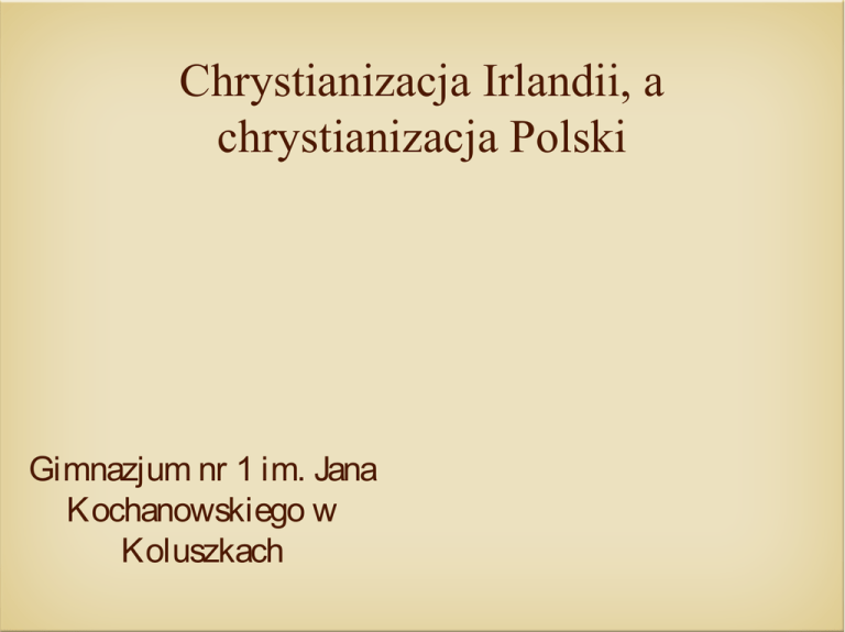 Chrystianizacja Irlandii, a chrystianizacja Polski Gimnazjum nr 1 im. Jana Kochanowskiego w Koluszkach Polska Chrystianizacja Polski-główne informacje ● Chrzest Polski odbył się w 966 roku. ● Za panowania księcia Mieszka I. ● Przyjęty w obrządku rzymsko-katolickim. ● ● ● Otrzymany z ramienia Czech, a nie Niemiec. Polska została uznana za biskupstwo misyjne. W tym okresie papieżem był Jan XIII Wierzenia plemion polskich przed chrztem. ● Na ziemiach polskich przed przyjęciem chrześcijaństwa panował politeizm. Czczono wielu bogów, siły natury oraz duchy przodków. Imiona bóstw powtarzały się u wielu plemion. Zwykle jednak każde plemię miało własnego boga. Podobnie każdy ród, miał swoje duchy przodków. Słowianin wierzył, że bóg obcego plemienia jest realny. W słowiańskiej religii była możliwość porzucenia Przebieg chrystianizacji w Polsce. 1)Pertraktacje z królem Czech. 2)Chrzest Mieszka I i ślub z Dobrawą 3)Niszczenie świętych gajów i innych miejsc kultu pogańskiego oraz budowa kościołów. 4)Misja św. Wojciecha. Skutki i przyczyny chrystianizacji w Polsce. Irlandia Chrystianizacja Irlandii-główne informacje ● ● ● Za początek chrystianizacji uznaje się przybycie św. Patryka na wyspę między 432r.n.e. a 461r.n.e. Św. Patrykowi przypisuje się zachowanie kultury celtyckiej. Przyswajał ją do chrześcijaństwa i wyrzucając te, które kolidowały z nauczaną wiarą. Za panowania papieża Sykstusa Wierzenia ludów Irlandii przed chrystianizacją 1)Wcześni Celtowie nie budowali świątyń ku czci swoich bóstw; uważali pewne gaje za święte. Niektóre drzewa same były uważane za święte. 2)Kult wojowników. 3)Życie pozagrobowe. 4)Druidzi jako kapłani 1)Do swojej śmierci w 461 Patryk zdołał przekonać do swojej religii irlandzką arystokrację, ustanowić opartą na miejscowej ludności hierarchię kościelną i założyć na wyspie klasztory. 2)Główną różnicą, od chrystianizacji w Europie, spowodowaną brakiem w Irlandii ośrodków miejskich, było tworzenie biskupstw w miejscach władzy plemiennej Przyczyny i skutki chrystianizacji w Irlandii Podobieństwa pomiędzy chrystianizacją Irlandii, a Polski 1)Pierwszymi ludźmi przyjmującymi nową religię byli arystokraci. 2)Misjonarze wnosili razem z wiarą kaganek oświaty. 3)W obu regionach poganie mieli już wcześniej pośredni, bądź bezpośredni kontakt z nową religią Różnice w chrystianizacji Polski i Irlandii SERDECZNIE DZIEKUJEMY ZA UWAGE WYKONALI : Jakub Chachuła Mateusz Zalewski KL. 3D