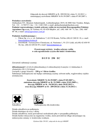 Załącznik do decyzji MRiRW nr R- 289/2012d z dnia 31.10.2012 r. zmieniającej zezwolenie MRiRW Nr R-39/2007 z dnia 07.09.2007 r. Posiadacz zezwolenia: Globachem NV, Brustem Industriepark, Lichtenberglaan 2019, B-3800 Sint Truiden, Belgia, Tel. +32 – 11785717, fax + 32- 1168 1565, e-mail: [email protected] Podmiot wprowadzający środek ochrony roślin na terytorium Rzeczpospolitej Polskiej: Agrosimex Sp.z o.o., ul. Goliany 43, 05-620 Błędów ,tel.: (48) 668 04 71, fax.: (48) 668 04 86, e-mail: [email protected]. Podmioty konfekcjonujące : 1. Pakon Sp. z o. o., ul. Zakładowa 7, 62-510 Konin, Tel/fax (48) 63 240 01 18, e- mail: [email protected] 2. DANMAR Towarzystwo Chemiczne, ul. Nasienna 1, 91-231 Łódź, tel.(48) 42 650 95 50, fax. (48) 42 650 66 95 e-mail: [email protected] Przestrzegaj etykiety środka ochrony roślin w celu ograniczenia ryzyka dla ludzi i środowiska. D I F O 250 EC Zawartość substancji czynnej: difenokonazol/1-(2-[4-(4-chlorofenoksy)-2-chlorofenylo]-4-metylo-1,3-dioksolan-2ylometylo)-1H-1,2,4-triazol (związek z grupy triazoli) – 250 g w 1 litrze środka. Substancje niebezpieczne nie będące substancją czynną: solwent nafta, węglowodory ciężkie aromatyczne. Zezwolenie MRiRW Nr R-39/2007 z dnia 07.09.2007 r., zmienione decyzją MRiRW nr R- 51/2009 z dnia 25.03.2009 r., decyzją MRiRW nr R - 54/2012d z dnia 20.02.2012 r. oraz decyzją MRiRW nr R - 289/2012d z dnia 31.10.2012 r. Szkodliwy Niebezpieczny dla środowiska Działa szkodliwie po połknięciu. Działa drażniąco na oczy i skórę. Działa szkodliwie; może powodować uszkodzenie płuc w przypadku połknięcia. Działa bardzo toksycznie na organizmy wodne, może powodować długo utrzymujące się niekorzystne zmiany w środowisku wodnym. Etykieta Difo 250 EC, załącznik do decyzji MRiRW 2 Uwaga! 1. Zabrania się stosowania środka w strefie bezpośredniej ochrony ujęć wody oraz na terenie uzdrowisk, otulin parków narodowych i rezerwatów. 2. Nie zanieczyszczać wód środkiem ochrony roślin lub jego opakowaniem. I OPIS DZIAŁANIA Difo 250 EC jest środkiem grzybobójczym w formie koncentratu do sporządzania emulsji wodnej o działaniu systemicznym do stosowania zapobiegawczego i interwencyjnego w ochronie jabłoni przed parchem jabłoni i mączniakiem jabłoni oraz grusz przed parchem grusz. W zwalczaniu parcha środek Difo 250 EC wykazuje także działanie wyniszczające. II ZAKRES STOSOWANIA, TERMINY I DAWKI 1.ROŚLINY SADOWNICZE a) JABŁOŃ, GRUSZA parch jabłoni, parch gruszy Zalecana dawka: 0,2 l/ha. Zalecana ilość wody: 500-750 l/ha. Ilość cieczy użytkowej dostosować do wielkości drzew i ich fazy rozwojowej. Środek stosować zapobiegawczo i interwencyjnie do 120 godzin po infekcji oraz wyniszczająco. Do wyniszczania plam parcha zaleca się dwukrotne stosowanie środka Difo 250 EC w odstępach co 5 dni. Zabiegi wykonywać w okresie od fazy różowego pąka kwiatowego nie więcej niż 2-3 razy w sezonie. b) JABŁOŃ mączniak jabłoni Zalecana dawka: 0,2 l/ha. Zalecana ilość wody: 500-750 l/ha. Ilość cieczy użytkowej dostosować do wielkości drzew i ich fazy rozwojowej. Środek stosować od fazy różowego pąka co 7-14 dni, nie więcej niż 2-3 razy w sezonie. UWAGI Etykieta Difo 250 EC, załącznik do decyzji MRiRW 3 1. Środek stosować w temperaturze powietrza powyżej 120 C. 2. Środek stosować przemiennie z fungicydami należącymi do innych grup chemicznych. III OKRES KARENCJI okres od dnia ostatniego zabiegu do dnia zbioru roślin przeznaczonych do konsumpcji NIE DOTYCZY IV OKRES PREWENCJI DLA PSZCZÓŁ, LUDZI I ZWIERZĄT okres zapobiegający zatruciu NIE DOTYCZY IV SPORZĄDZANIE CIECZY UŻYTKOWEJ Przed przystąpieniem do sporządzania cieczy użytkowej dokładnie ustalić potrzebną jej ilość. Zawartością opakowania przed użyciem wstrząsnąć. Odmierzoną ilość środka wlać do zbiornika opryskiwacza napełnionego częściowo wodą (z włączonym mieszadłem) i uzupełnić wodą do potrzebnej ilości. Opryskiwać z włączonym mieszadłem. Po wlaniu środka do zbiornika opryskiwacza nie wyposażonego w mieszadło hydrauliczne ciecz w zbiorniku mechanicznie wymieszać. Opróżnione opakowania przepłukać trzykrotnie wodą, a popłuczyny wlać do zbiornika opryskiwacza z cieczą użytkową. Po pracy aparaturę dokładnie wymyć. V PRZECHOWYWANIE Przechowywać wyłącznie w oryginalnych szczelnie zamkniętych opakowaniach, w dobrze wentylowanych miejscach z dala od źródeł ciepła, w temperaturze nie przekraczającej zakresu (10°C) – (30°C) oraz chronić przed światłem słonecznym. Chronić przed dziećmi. Nie przechowywać razem z żywnością, napojami i paszami dla zwierząt. VI WARUNKI BEZPIECZNEGO STOSOWANIA ŚRODKA − Nie jeść i nie pić oraz nie palić tytoniu podczas stosowania produktu. − Nie wdychać rozpylonej cieczy użytkowej. − Zanieczyszczone oczy przemyć natychmiast dużą ilością wody i zasięgnąć porady lekarza. − Natychmiast zdjąć całą zanieczyszczoną odzież. Etykieta Difo 250 EC, załącznik do decyzji MRiRW 4 − Zanieczyszczoną skórę natychmiast przemyć dużą ilością wody. − Nosić odpowiednią odzież ochronną i odpowiednie rękawice ochronne i okulary lub ochronę twarzy. − W razie połknięcia niezwłocznie zasięgnij porady lekarza - pokaż opakowanie lub etykietę. − Środek i opakowanie usuwać jako odpad niebezpieczny. − Opróżnione opakowania po środku zwrócić do sprzedawcy, u którego środek został zakupiony. − Zabrania się spalania opakowań po środku ochrony roślin we własnym zakresie. − Używać odpowiednich pojemników zapobiegających skażeniu środowiska. − Resztki cieczy użytkowej rozcieńczyć wodą i wypryskać na powierzchni poprzednio opryskiwanej. Wodę użytą do mycia aparatury wypryskać na powierzchni uprzednio opryskiwanej, stosując te same środki ochrony osobistej. UWAGA ZABRANIA SIĘ WYKORZYSTYWANIA OPRÓŻNIONYCH OPAKOWAŃ PO ŚRODKACH