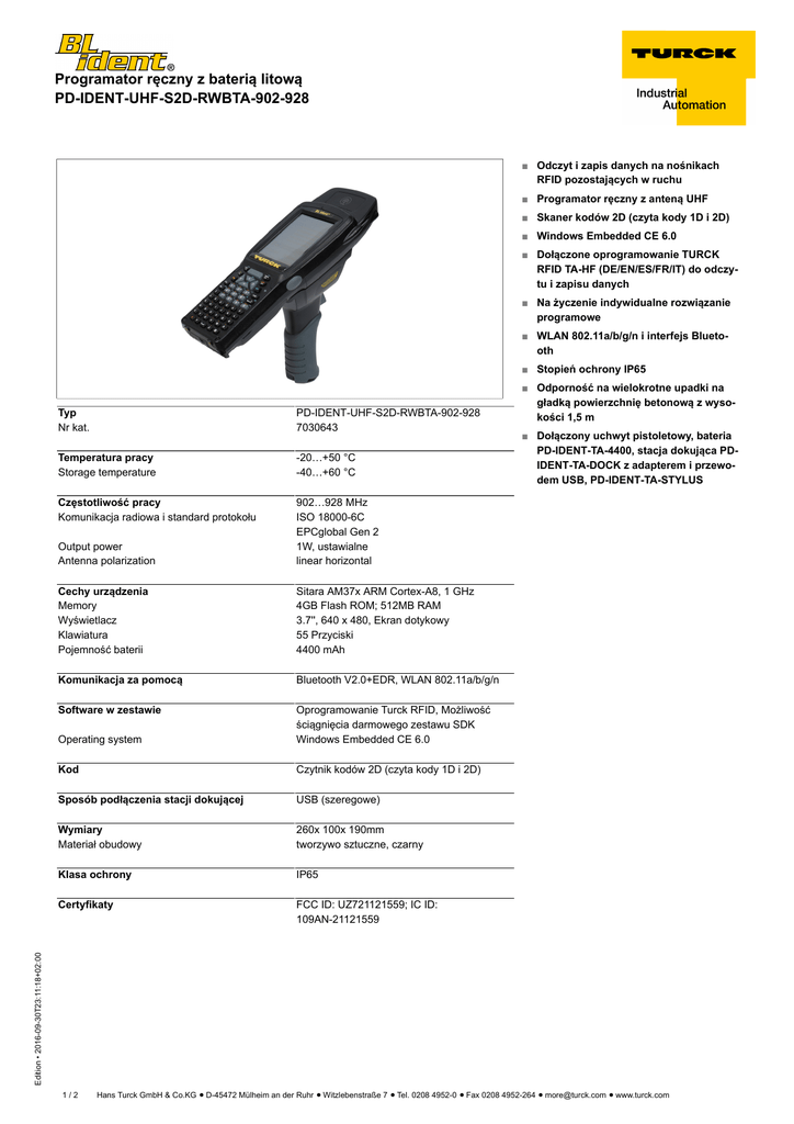 Programator ręczny z baterią litową PD-IDENT-UHF-S2D-RWBTA-902-928 ■ Odczyt i zapis danych na nośnikach RFID pozostających w ruchu ■ Programator ręczny z anteną UHF ■ Skaner kodów 2D (czyta kody 1D i 2D) ■ Windows Embedded CE 6.0 ■ Dołączone oprogramowanie TURCK RFID TA-HF (DE/EN/ES/FR/IT) do odczytu i zapisu danych ■ Na życzenie indywidualne rozwiązanie programowe ■ WLAN 802.11a/b/g/n i interfejs Bluetooth ■ Stopień ochrony IP65 PD-IDENT-UHF-S2D-RWBTA-902-928 7030643 Temperatura pracy Storage temperature -20…+50 °C -40…+60 °C Częstotliwość pracy Komunikacja radiowa i standard protokołu Output power Antenna polarization 902…928 MHz ISO 18000-6C EPCglobal Gen 2 1W, ustawialne linear horizontal Cechy urządzenia Memory Wyświetlacz Klawiatura Pojemność baterii Sitara AM37x ARM Cortex-A8, 1 GHz 4GB Flash ROM; 512MB RAM 3.7'', 640 x 480, Ekran dotykowy 55 Przyciski 4400 mAh Komunikacja za pomocą Bluetooth V2.0+EDR, WLAN 802.11a/b/g/n Software w zestawie Operating system Oprogramowanie Turck RFID, Możliwość ściągnięcia darmowego zestawu SDK Windows Embedded CE 6.0 Kod Czytnik kodów 2D (czyta kody 1D i 2D) Sposób podłączenia stacji dokującej USB (szeregowe) Wymiary Materiał obudowy 260x 100x 190mm tworzywo sztuczne, czarny Klasa ochrony IP65 Certyfikaty FCC ID: UZ721121559; IC ID: 109AN-21121559 ■ Dołączony uchwyt pistoletowy, bateria PD-IDENT-TA-4400, stacja dokująca PDIDENT-TA-DOCK z adapterem i przewodem USB, PD-IDENT-TA-STYLUS Edition • 2016-09-30T23:11:18+02:00 Typ Nr kat. ■ Odporność na wielokrotne upadki na gładką powierzchnię betonową z wysokości 1,5 m 1/2 Hans Turck GmbH & Co.KG ñ D-45472 Mülheim an der Ruhr ñ Witzlebenstraße 7 ñ Tel. 0208 4952-0 ñ Fax 0208 4952-264 ñ [email protected] ñ www.turck.com Programator ręczny z baterią litową PD-IDENT-UHF-S2D-RWBTA-902-928 Akcesoria montażowe Nr kat. PD-IDENT-TA-4400 PD-IDENT-TA-RS232 7030518 7030554 PD-IDENT-TA-STYLUS PD-IDENT-TA-POWERSUPPLY PD-IDENT-TA-DOCK PD-IDENT-TA-DOCK-ETHERNET 7030550 7030597 Zamienna bateria 4400 mAh Przewód adaptera RS232 do bezpośredniego podłączenia programatorów ręcznych TA z urządzeniami z interfejsem RS-232 (np. PLC, PC) zamienne pisaki (25 szt.) Jednostka zasilająca Rysunek wymiarowy 7030596 7030595 Stacja bazowa, zawiera zasilacz Adapter Ethernet dla stacji bazowych Edition • 2016-09-30T23:11:18+02:00 Typ 2/2 Hans Turck GmbH & Co.KG ñ D-45472 Mülheim an der Ruhr ñ Witzlebenstraße 7 ñ Tel. 0208 4952-0 ñ Fax 0208 4952-264 ñ [email protected] ñ www.turck.com