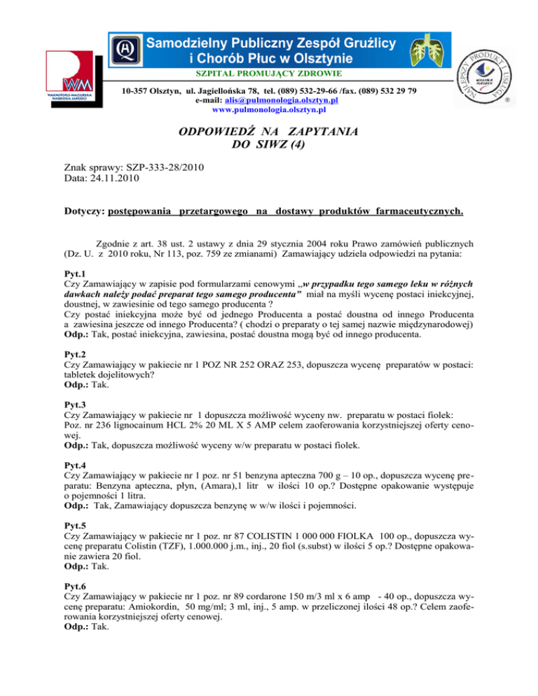 SZPITAL PROMUJĄCY ZDROWIE 10-357 Olsztyn, ul. Jagiellońska 78, tel. (089) 532-29-66 /fax. (089) 532 29 79 e-mail: [email protected] www.pulmonologia.olsztyn.pl ODPOWIEDŹ NA ZAPYTANIA DO SIWZ (4) Znak sprawy: SZP-333-28/2010 Data: 24.11.2010 Dotyczy: postępowania przetargowego na dostawy produktów farmaceutycznych. Zgodnie z art. 38 ust. 2 ustawy z dnia 29 stycznia 2004 roku Prawo zamówień publicznych (Dz. U. z 2010 roku, Nr 113, poz. 759 ze zmianami) Zamawiający udziela odpowiedzi na pytania: Pyt.1 Czy Zamawiający w zapisie pod formularzami cenowymi „w przypadku tego samego leku w różnych dawkach należy podać preparat tego samego producenta” miał na myśli wycenę postaci iniekcyjnej, doustnej, w zawiesinie od tego samego producenta ? Czy postać iniekcyjna może być od jednego Producenta a postać doustna od innego Producenta a zawiesina jeszcze od innego Producenta? ( chodzi o preparaty o tej samej nazwie międzynarodowej) Odp.: Tak, postać iniekcyjna, zawiesina, postać doustna mogą być od innego producenta. Pyt.2 Czy Zamawiający w pakiecie nr 1 POZ NR 252 ORAZ 253, dopuszcza wycenę preparatów w postaci: tabletek dojelitowych? Odp.: Tak. Pyt.3 Czy Zamawiający w pakiecie nr 1 dopuszcza możliwość wyceny nw. preparatu w postaci fiolek: Poz. nr 236 lignocainum HCL 2% 20 ML X 5 AMP celem zaoferowania korzystniejszej oferty cenowej. Odp.: Tak, dopuszcza możliwość wyceny w/w preparatu w postaci fiolek. Pyt.4 Czy Zamawiający w pakiecie nr 1 poz. nr 51 benzyna apteczna 700 g – 10 op., dopuszcza wycenę preparatu: Benzyna apteczna, płyn, (Amara),1 litr w ilości 10 op.? Dostępne opakowanie występuje o pojemności 1 litra. Odp.: Tak, Zamawiający dopuszcza benzynę w w/w ilości i pojemności. Pyt.5 Czy Zamawiający w pakiecie nr 1 poz. nr 87 COLISTIN 1 000 000 FIOLKA 100 op., dopuszcza wycenę preparatu Colistin (TZF), 1.000.000 j.m., inj., 20 fiol (s.subst) w ilości 5 op.? Dostępne opakowanie zawiera 20 fiol. Odp.: Tak. Pyt.6 Czy Zamawiający w pakiecie nr 1 poz. nr 89 cordarone 150 m/3 ml x 6 amp - 40 op., dopuszcza wycenę preparatu: Amiokordin, 50 mg/ml; 3 ml, inj., 5 amp. w przeliczonej ilości 48 op.? Celem zaoferowania korzystniejszej oferty cenowej. Odp.: Tak. PYT.7 Czy Zamawiający wyraża zgodę o wydzielenie z Pakietu nr 1 poz. nr 94 cycloseryna 250 mg caps. x 100 1 szt. oraz utworzenie odrębnego pakietu nr 1 a? Preparat dostępny jest tylko w ramach importu docelowego.( Brak rejestracji). Odp.: Tak, dopuszcza. PYT.8 Czy Zamawiający w pakiecie nr 1 poz. nr 103 curaspon standard – 30 szt., dopuszcza wycenę preparatu: GelitaSpon Stand,gąbka,hemost,80x50x10mm,10szt,GS-010 w ilości 3 op.? Celem zaoferowania korzystniejszej oferty cenowej. Odp.: Tak, dopuszcza. PYT.9 Czy Zamawiający w pakiecie nr 1 poz. nr 125 DOLARGAN 100 MG/2 ML AMP – 10 OP, dopuszcza wycenę preparatu Dolcontral,100 mg/2 ml, inj., 10 amp. w przeliczonej ilości 1 op.? Celem zaoferowania korzystniejszej oferty cenowej. Odp.: Zamawiający wymaga preparat sprzedawany w pojedynczych fiolkach zgodnie z zapisem SIWZ. PYT.10 Czy Zamawiający w pakiecie nr 1 poz. nr 139 enarenal 0,005 x 60 tabl. 60 op., dopuszcza wycenę preparatu x 30 tabl. w opakowaniu w przeliczonej ilości 120 op.? Celem zaoferowania korzystniejszej oferty cenowej. Odp.: Tak. PYT.11 Czy Zamawiający w pakiecie nr 1 poz. nr 140 enarenal 0,01 g x 70 tabl. 60 op., dopuszcza wycenę preparatu x 30 tabl. w opakowaniu w przeliczonej ilości 140 op.? Celem zaoferowania korzystniejszej oferty cenowej. Odp.: Tak. PYT.12 Czy Zamawiający w pakiecie nr 1 poz. nr 154 fastum żel 30 op.?, miał na myśli wycenę preparatu o gramaturze 50 g w ilości 30 op.? ( nie podano gramatury) Odp.: Tak, Zamawiający dopuszcza preparat o w/w gramaturze. PYT.13 Czy Zamawiający w pakiecie nr 1 poz. nr 159 fentanyl 0,1 mg/2 ml (amp. 2 ml) x 1 – 20 op., dopuszcza wycenę preparatu; Fentanyl (WZF), 0,1 mg/2 ml, inj.,(Polfa W),50 amp. w ilości 1 op.? Zarejestrowane opakowanie zawiera 50 amp. Odp.: Zamawiający wymaga preparat sprzedawany w pojedynczych fiolkach zgodnie z zapisem SIWZ. PYT.14 Czy Zamawiający w pakiecie nr 1 poz. nr 167 Formalina cz.d.a 37% 1 l butelka x 1 – 5 op.?-dopuszcza wycenę: Formalina, 40%, płyn, (Amara), 1000 ml w ilości 5 op.?(Brak dostępności podanego przez Państwa preparatu) Odp.: Tak. PYT.15 Czy zamawiający w pakiecie nr 1 poz. nr 202 heparinum 25000j/5ml fiolka 100 op., dopuszcza wycenę preparatu Heparinum (WZF), 25.000 j.m./5 ml, inj., 10 fiol w przeliczonej ilości 10 op.? Zarejestrowane opakowanie zawiera 10 fiol. Odp.: Tak. PYT.16 Czy Zamawiający w pakiecie nr 1 poz. nr 203 HUMALOG (wszystkie rodzaje), dopuszcza wycenę: Humalog Mix 50, 300 j.m./3 ml, inj., 5 wkład. W ilości 5 op.? Proszę o doprecyzowanie. 2 Odp.: W związku z tym, iż Zamawiający nie jest w stanie przewidzieć jaki rodzaj insuliny będzie potrzebował poszczególny pacjent - M3, N, R należy podać uśrednioną cenę w danej grupie cenowej insulin. PYT.17 Czy Zamawiający w pakiecie nr 1 poz. nr 177 Gensulin 300 j.m/3ml wkłady x 5 - 10 op., dopuszcza wycenę preparatu: Gensulin R, 300 j.m./3 ml, inj., 5wkładow w ilości 10 op.? Proszę o doprecyzowanie. Odp.: W związku z tym, iż Zamawiający nie jest w stanie przewidzieć jaki rodzaj insuliny będzie potrzebował poszczególny pacjent - M3, N, R, należy podać uśrednioną cenę w danej grupie cenowej insulin. PYT.18 Czy Zamawiający w pakiecie nr 1 poz. nr 204 humulin wkłady x 5 -5op, dopuszcza wycenę: Gensulin M30 (30/70), 300jm/3ml,inj.,5wkładow w ilości 5 op.? Proszę o doprecyzowanie. Odp.: W związku z tym, iż Zamawiający nie jest w stanie przewidzieć jaki rodzaj insuliny będzie potrzebował poszczególny pacjent - M3, N, R, należy podać uśrednioną cenę w danej grupie cenowej insulin. PYT.19 Czy Zamawiający w pakiecie nr 1 poz. nr 209 Hydrocortisonum acet. Inj. amp x 10 1 op., miał na myśli wycenę preparatu: Hydrocortisonum, 125mg+25mg/5ml,i