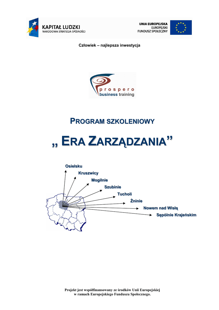 Człowiek – najlepsza inwestycja PROGRAM SZKOLENIOWY „ ERA ZARZĄDZANIA” O Ossiieellsskkuu K Krruusszzw wiiccyy M Mooggiillnniiee SSzzuubbiinniiee TTuucchhoollii śśnniinniiee N Noow weem m nnaadd W Wiissłłąą SSęęppóóllnniiee K Krraajjeeńńsskkiim m Projekt jest współfinansowany ze środków Unii Europejskiej w ramach Europejskiego Funduszu Społecznego. Człowiek – najlepsza inwestycja I. Przedsiębiorczość i strategie rozwoju biznesu 1. Przedsiębiorczość, jako "cecha" Organizacji realia materiałowe, finansowe i osobowe Firmy otoczenie mikro,- i makroekonomiczne dynamizm działaniowy – otwartość na nowe technologie, trendy umiejętność dostosowania się do zmian dostrzeganie szans i ich wykorzystanie – od problemu do okazji innowacyjność 2. Planowanie i zarządzanie strategiczne znaczenie planowania w organizacjach plany strategiczne a plany operacyjne róŜne poziomy strategii wdraŜanie strategii w Organizacji 3. Kultura organizacyjna poziomy kultury organizacyjnej w Firmie kultura Organizacji a jej efektywność 4. Struktura organizacyjna Firmy architektura struktury organizacyjnej a procesy biznesowe optymalizacja wykorzystania zasobów 5. Procesy biznesowe rodzaje procesów w Organizacji uczestnicy procesów biznesowych – osoby odpowiedzialne controlling procesów na tle mapy celów strategicznych firmy usprawnianie procesów biznesowych 6. Komunikacja wewnętrzna i zewnętrzna Organizacji znaczenie skutecznej komunikacji komunikacja interpersonalna (cele, bariery) zasady przepływu informacji w Organizacji sztuka budowania dobrych relacji w biznesie Projekt jest współfinansowany ze środków Unii Europejskiej w ramach Europejskiego Funduszu Społecznego. Człowiek – najlepsza inwestycja II. Komunikacja interpersonalna i negocjacje w biznesie 1. Budowanie i utrzymywanie kontaktu podczas rozmowy biznesowej umiejętności precyzyjnej obserwacji – wyostrzenie zmysłów, czyli jak w pełni wykorzystać to, co moŜemy zobaczyć, usłyszeć i poczuć pierwsze wraŜenie– jego rola w kontakcie - strój i estetyka wyglądu - mowa ciała – gestykulacja, głos, przestrzeń dopasowanie swojego wizerunku i sposobu zachowania do konkretnej osoby przekaz świadomy i nieświadomy w komunikacji – komunikacja werbalna i niewerbalna spójność prezentowanego wizerunku – zgodność tego jak wyglądam z tym, co i jak mówię budowanie kontaktu w oparciu o ideę odzwierciedlenia 2. Umiejętność aktywnego słuchania poziomy aktywnego słuchania uwzględnienie komunikatów niewerbalnych (ton głosu, szybkość mówienia) – umiejętność odczytywania mowy ciała oraz informacji zawartych w głosie stosowanie parafrazy i klaryfikacji koncentracja na komunikacie centralnym 3. Techniki zbierania informacji zbieranie informacji jako klucz do prowadzenia negocjacji odczytywanie sygnałów TAK/NIE sztuka zadawania pytań – umiejętność negocjacyjna rodzaje pytań i ich zastosowanie – załoŜenie „Kto pyta – prowadzi” - pytania otwarte - pytania zamknięte - pytania „w górę” i „w dół” (kryteria i wartości) - pytania pozornego wyboru - pytania sugestywne - pytania wzbudzające potrzeby 4. Typologia Rozmówców oparta o metaprogramy systemy reprezentacji zmysłowej – wzrokowcy, słuchowcy, kinestetycy umiejscowienie autorytetu: ja, inni, dane motywacja: unikanie problemów i orientacja na cel wielkość informacji: szczegóły lub ogóły porównywanie: podobieństwa i róŜnice Projekt jest współfinansowany ze środków Unii Europejskiej w ramach Europejskiego Funduszu Społecznego. Człowiek – najlepsza inwestycja 5. Rozumienie przestrzeni negocjacyjnej określenie celu negocjacji: wspólny cel, cele własne i cele partnera zasada: cel, uwaŜność, elastyczność nazwanie punktu odejścia od negocjacji strategia BATNA – określenie rozwiązań alternatywnych 6. Strategie prowadzenia negocjacji style negocjacyjne (negocjacje miękkie, twarde i oparte na zasadach) wyznaczanie obszaru negocjacji – określanie wspólnych korzyści postawa negocjatora – powadzenie negocjacji typu wygrany - wygrany umiejętność rozwiązywania problemów w patowych i trudnych sytuacjach podczas negocjacji ramy w negocjacjach 7. Reguły wpływu i radzenie sobie z manipulacją budowanie relacji formalnych i nieformalnych podczas rozmowy - więź kulturowa - bezpieczeństwo - więź osobista zasady i techniki wpływu społecznego - zasada wzajemności - dysonans poznawczy - zjednywanie sympatii otoczenia - radzenie sobie z ingracjacją i makiawelizmem rozpoznawanie i przeciwdziałanie grom manipulacyjnym partnerów - gry cenowe - gry w ramach kategorii „Ludzie” – KTO? - gry w ramach kategorii „Czynności” – JAK? - gry w ramach kategorii „Czas” – KIEDY? JAK DŁUGO? - gry w ramach kategorii „Miejsca” – GDZIE? - gry w ramach kategorii „Dane” – CO? ILE? 8. Kontrola własnej postawy i emocji w procesie negocjacji kontrola emocji i utrzymywanie dystansu - zmiana sposobu patrzenia na problem – pozycje percepcyjne - oddzielenie ludzi od problemu - umiejętność przyjmowania krytyki i radzenia sobie z agresją - techniki pozwalające na opanowanie negatywnych emocji w sytuacjach stresowych wpływanie na emocje Partnera negocjacji - technika kotwiczenia stanów Projekt jest współfinansowany ze środków Unii Europejskiej w ramach Europejskiego Funduszu Społecznego. Człowiek – najlepsza inwestycja III. Budowanie zespołu i coaching menadŜerski 1. Zespół – główne fazy rozwoju, tworzenie norm grupowych, role przyjmowane w grupie 2. Formułowanie celów jako element integrujący pracę zespołu identyfikacja i precyzowanie “problemów” umiejętność zmieniania postawy skierowanej „na problem” na perspektywę skierowaną na cel i poszukiwanie rozwiązań cele zespołowe i indywidualne umiejętność zmieniania postawy skierowanej „na problem” na perspektywę skierowaną na cel i poszukiwanie rozwiąz