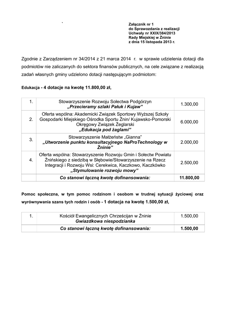 ` Załącznik nr 1 do Sprawozdania z realizacji Uchwały nr XXIX/384/2013 Rady Miejskiej w Żninie z dnia 15 listopada 2013 r. Zgodnie z Zarządzeniem nr 34/2014 z 21 marca 2014 r. w sprawie udzielenia dotacji dla podmiotów nie zaliczanych do sektora finansów publicznych, na cele związane z realizacją zadań własnych gminy udzielono dotacji następującym podmiotom: Edukacja - 4 dotacje na kwotę 11.800,00 zł, 1. 2. 3. 4. Stowarzyszenie Rozwoju Sołectwa Podgórzyn „Przecieramy szlaki Pałuk i Kujaw” 1.300,00 Oferta wspólna: Akademicki Związek Sportowy Wyższej Szkoły Gospodarki Miejskiego Ośrodka Sportu Żnin/ Kujawsko-Pomorski Okręgowy Związek Żeglarski „Edukacja pod żaglami” 6.000,00 Stowarzyszenie Małżeństw „Gianna” „Utworzenie punktu konsultacyjnego NaProTechnology w Żninie” 2.000,00 Oferta wspólna: Stowarzyszenie Rozwoju Gmin i Sołectw Powiatu Żnińskiego z siedzibą w Słębowie/Stowarzyszenie na Rzecz Integracji i Rozwoju Wsi: Cerekwica, Kaczkowo, Kaczkówko „Stymulowanie rozwoju mowy” 2.500,00 Co stanowi łączną kwotę dofinansowania: 11.800,00 Pomoc społeczna, w tym pomoc rodzinom i osobom w trudnej sytuacji życiowej oraz wyrównywania szans tych rodzin i osób - 1 dotacja na kwotę 1.500,00 zł, 1. Kościół Ewangelicznych Chrześcijan w Żninie Gwiazdkowa niespodzianka 1.500,00 Co stanowi łączną kwotę dofinansowania: 1.500,00 Działalności na rzecz osób niepełnosprawnych - 4 dotacje na kwotę 18.500,00 zł 1. Stowarzyszenie Sympatyków Harcerstwa Żnińskiego „Do zobaczenia na szlaku – w Polskę ruszamy” 4.000,00 2. Liga Kobiet Polskich Kujawsko-Pomorski Oddział Wojewódzki dla Warsztatu Terapii Zajęciowej „Promyk” w Żninie „Bądźmy aktywni - program rehabilitacji społecznej Uczestników WTZ „Promyk”/”LKP” 10.000,00 3. Towarzystwo Przyjaciół Dzieci Kujawsko-Pomorski Oddział Regionalny – Towarzystwo Przyjaciół Dzieci Koło Pomocy Dzieciom Niepełnosprawnym w Żninie „Integracja osób niepełnosprawnych zrzeszonych w TPD” 1.500,00 4. Pałuckie Stowarzyszenie Osób ze Stwardnieniem Rozsianym „Walczymy o siebie” 3.000,00 Co stanowi łączną kwotę dofinansowania: 18.500,00 Ochrona i promocja zdrowia - 4 dotacje na kwotę 7.500,00 zł 1. Kujawsko-Pomorski Oddział Okręgowy Polskiego Czerwonego Krzyża w Bydgoszczy dla Klubu Honorowych Dawców Krwi przy Oddziale Rejonowym PCK w Żninie „Działalność na rzecz rozwoju Honorowego Krwiodawstwa oraz pozyskiwania Honorowych Dawców krwi na terenie gm. Żnin” 3.000,00 2. Polski Związek Niewidomych Okręg Kujawsko-Pomorski – Koło Powiatowe Polskiego Związku Niewidomych w Żninie „Laska moim przewodnikiem” 1.000,00 3. Żniński Klub Morsa „Mikołaj trzyma formę” 2.500,00 4. „Stowarzyszenie Smacznie, Zdrowo, Kolorowo” „Ruch to zdrowie” 1.000,00 Co stanowi łączną kwotę dofinansowania: 7.500,00 Kultura - 4 dotacje na kwotę 25.500,00 zł, 1. 2. 3. 4. „Stowarzyszenie Trochę Kultury!” „Nagranie i wydanie płyty zespołu Methadone” 2.000,00 Parafia Rzymsko-Katolicka pw. Najświętszej Marii Panny Królowej Polski „Cykliczne wydarzenia kulturalne” 7.000,00 Stowarzyszenie Śpiewacze Chór Męski im. St. Moniuszki w Żninie „Promocja i upowszechnianie twórczości kulturalnej oraz inauguracja obchód jubileuszowych 105-lecia istnienia chóru Moniuszko” 15.000,00 Stowarzyszenie na Rzecz Integracji i Rozwoju Wsi: Cerekwica, Kaczkowo, Kaczkówko „Dożynki Parafialne w Cerekwicy” 1.500,00 Co stanowi łączną kwotę dofinansowania: 25.500,00 Wspieranie i upowszechniania kultury fizycznej - 14 dotacji na kwotę 42.600,00 zł Uczniowski Klub Sportowy Ekonom Żnin „Aktywność ruchowa dziadków i rodziców przykładem dla młodych pokoleń” 2.600,00 Klub Sportowy „Jeziorak” Żnin „Obozy sportowo-rekreacyjne w Słębowie, turnieje, zawody i rozgrywki piłkarskie” 3.000,00 Liga Obrony Kraju Kujawsko-Pomorski Zarząd Wojewódzki „Organizacja zawodów w sportach strzeleckich i politechnicznych wraz ze szkoleniem dzieci i młodzieży” 7.500,00 Oferta wspólna: Stowarzyszenie Sympatyków Harcerstwa Żnińskiego/Stowarzyszenie Miłośników Bożejewic „Ruch jest życiem” 2.000,00 Klub Piłkarski „Brzysko-Rol” w Brzyskorzystewku „Obóz piłkarski dla dzieci i młodzieży z terenów wiejskich” 2.000,00 Akademicki Związek Sportowy Wyższej Szkoły Gospodarki Miejskiego Ośrodka Sportu Żnin „Żegluj przez życie” 2.000,00 Stowarzyszenie na rzecz rozwoju wsi Januszkowo „Sportowy Piknik Rodzinny” 500,00 Oferta wspólna: Stowarzyszenie Edukacyjne „Nasza szkoła” w Gorzycach/Uczniowski Klub Sportowy Gorzyce „Sportowa zabawa – to zdrowa sprawa” 1.500,00 9. Związek Wędkarski „Pałuczanin” w Żninie „Cykl zawodów wędkarskich w roku 2014” 4.000,00 10. Stowarzyszenie „Miłośników Wenecji” 500,00 1. 2. 3. 4. 5. 6. 7. 8. „Integracja dzieci i młodzieży poprzez sport i krzewienie kultury fizycznej” 11. Stowarzyszenie Windsurfing Team Żnin „Puchar Żnina-2014” 8.000,00 12. Żniński Klub Biegacza „1992” „Bieg po zdrowie” 4.000,00 Miejsko-Gminne Zrzeszenie Ludowe Zespoły Sportowe w Żninie „Uprawianie sportu szansą dla uczestników na poprawienie kondycji fizycznej i psychicznej oraz osiąganie wyników sportowych na wszelkich poziomach” 3.000,00 Stowarzyszenie Rozwoju Gmin i Sołectw Powiatu Żnińskiego z siedzibą w Słębowie „Majówka, Festyn sportowo-rekreacyjny” 2.000,00 Co stanowi łączną kwotę dofinansowania: 42.600,00 13. 14. Krajoznawstwo i turystyka - 3 dotacje na kwotę 6.000,00 zł 1. Oferta wspólna: Pałuckie Wodne Ochotnicze Pogotowie Ratunkowe/Żniński Klub Morsa „Odkrywamy nowe szlaki kajakowe” 2.000,00 2. Pałucki Oddział Polskiego Towarzystwa TurystycznoKrajoznawczego w Żninie „Ogólnopolski Młodzieżowy Konkurs Krajoznawczy „Poznajemy Ojcowiznę” 2.000,00 3. Oferta wspólna: Liga Kobiet Polskich Kujawsko-