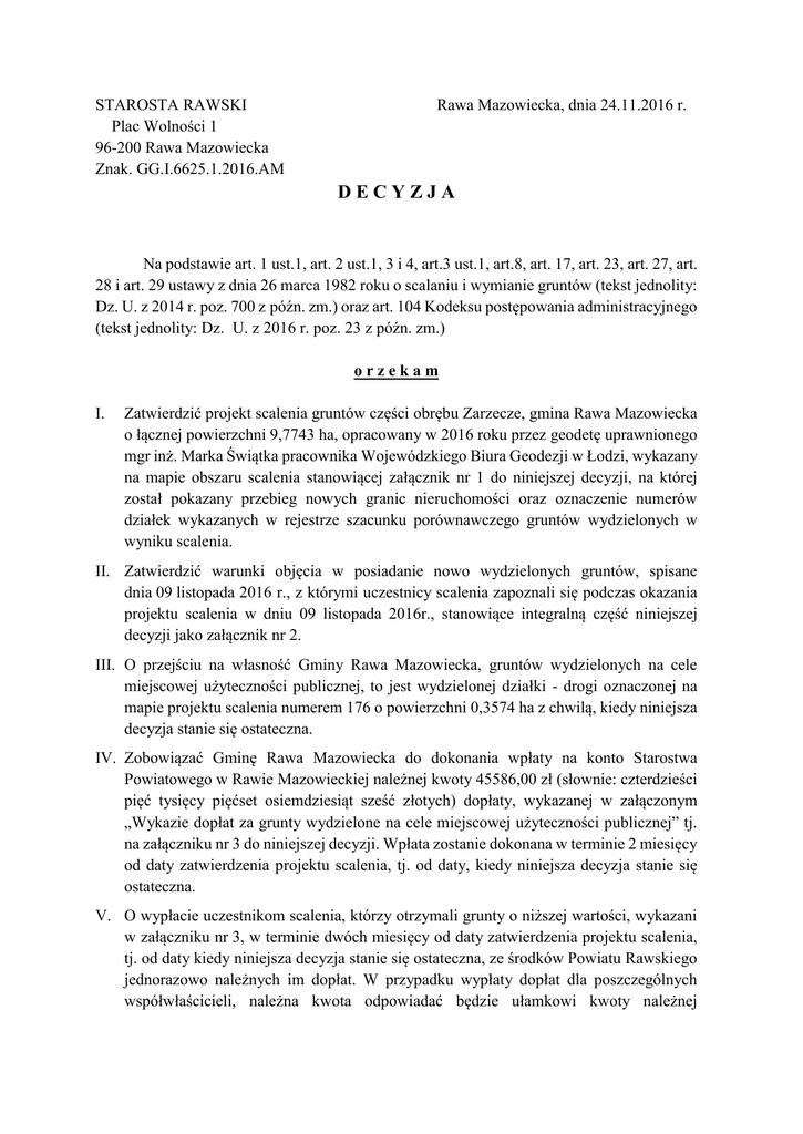 STAROSTA RAWSKI Plac Wolności 1 96-200 Rawa Mazowiecka Znak. GG.I.6625.1.2016.AM Rawa Mazowiecka, dnia 24.11.2016 r. DECYZJA Na podstawie art. 1 ust.1, art. 2 ust.1, 3 i 4, art.3 ust.1, art.8, art. 17, art. 23, art. 27, art. 28 i art. 29 ustawy z dnia 26 marca 1982 roku o scalaniu i wymianie gruntów (tekst jednolity: Dz. U. z 2014 r. poz. 700 z późn. zm.) oraz art. 104 Kodeksu postępowania administracyjnego (tekst jednolity: Dz. U. z 2016 r. poz. 23 z późn. zm.) orzekam I. Zatwierdzić projekt scalenia gruntów części obrębu Zarzecze, gmina Rawa Mazowiecka o łącznej powierzchni 9,7743 ha, opracowany w 2016 roku przez geodetę uprawnionego mgr inż. Marka Świątka pracownika Wojewódzkiego Biura Geodezji w Łodzi, wykazany na mapie obszaru scalenia stanowiącej załącznik nr 1 do niniejszej decyzji, na której został pokazany przebieg nowych granic nieruchomości oraz oznaczenie numerów działek wykazanych w rejestrze szacunku porównawczego gruntów wydzielonych w wyniku scalenia. II. Zatwierdzić warunki objęcia w posiadanie nowo wydzielonych gruntów, spisane dnia 09 listopada 2016 r., z którymi uczestnicy scalenia zapoznali się podczas okazania projektu scalenia w dniu 09 listopada 2016r., stanowiące integralną część niniejszej decyzji jako załącznik nr 2. III. O przejściu na własność Gminy Rawa Mazowiecka, gruntów wydzielonych na cele miejscowej użyteczności publicznej, to jest wydzielonej działki - drogi oznaczonej na mapie projektu scalenia numerem 176 o powierzchni 0,3574 ha z chwilą, kiedy niniejsza decyzja stanie się ostateczna. IV. Zobowiązać Gminę Rawa Mazowiecka do dokonania wpłaty na konto Starostwa Powiatowego w Rawie Mazowieckiej należnej kwoty 45586,00 zł (słownie: czterdzieści pięć tysięcy pięćset osiemdziesiąt sześć złotych) dopłaty, wykazanej w załączonym „Wykazie dopłat za grunty wydzielone na cele miejscowej użyteczności publicznej” tj. na załączniku nr 3 do niniejszej decyzji. Wpłata zostanie dokonana w terminie 2 miesięcy od daty zatwierdzenia projektu scalenia, tj. od daty, kiedy niniejsza decyzja stanie się ostateczna. V. O wypłacie uczestnikom scalenia, którzy otrzymali grunty o niższej wartości, wykazani w załączniku nr 3, w terminie dwóch miesięcy od daty zatwierdzenia projektu scalenia, tj. od daty kiedy niniejsza decyzja stanie się ostateczna, ze środków Powiatu Rawskiego jednorazowo należnych im dopłat. W przypadku wypłaty dopłat dla poszczególnych współwłaścicieli, należna kwota odpowiadać będzie ułamkowi kwoty należnej wyliczonej wg. ujawnionych w rejestrze ewidencji gruntów i budynków udziałów we współwłasności. VI. Znieść współwłasność na wniosek współwłaścicieli gruntów z pozycji rejestrowej nr 48, dla działek objętych postępowaniem scaleniowym (dotychczasowe nr 135/2, 135/3, 135/4, 137/2, 137/3, 137/4, 140/2, 140/3 i 140/4), a wydzielone nowe ekwiwalentne działki przypisać dla: 1) Starczewskiego Czesława działka nr 171 2) Starczewskiego Waldemara działka 172 3) Romanowskiej Wiesławy działki 173 i 180 VII. Zatwierdzić podział działki drogi gminnej na część objętą scaleniem o nowym numerze działki176 (odpowiadającą w części działkom sprzed scalenia o numerach 129/3, 132/3, 135/3, 137/3, 140/3, 142/3, 144/3, 146/3) i część tejże drogi położoną poza obszarem scalenia o numerze 151/2 o powierzchni 0,3726 (powstałej poprzez przecięcie granicą obszaru scalenia dawnej działki 151/1 - fragment nie objęty postępowaniem scaleniowym). Decyzja niniejsza stanowi podstawę do ujawnienia nowego stanu w ewidencji gruntów i budynków oraz w księgach wieczystych. Decyzja niniejsza nie narusza praw osób trzecich do gruntów objętych scaleniem. Obciążenia i służebności ciążące na gruntach objętych scaleniem przechodzą z gruntów objętych scaleniem na grunty wydzielone w wyniku scalenia. Uzasadnienie Scalenie gruntów w obrębie Zarzecze gmina Rawa Mazowiecka, na wniosek większości właścicieli gospodarstw rolnych, położonych na projektowanym obszarze scalenia zostało wszczęte postanowieniem Starosty Rawskiego nr GG.I.6625.1.2016.AM z dnia 19.07.2016 r. , odczytanym uczestnikom postępowania na zebraniu w dniu 19.07.2016 r. i ogłoszonym na tablicach ogłoszeń w Urzędzie Gminy w Rawie Mazowieckiej, Sołectwie Dziurdzioły i Zarzecze oraz w Starostwie Powiatowym w Rawie Mazowieckiej. Scalenie gruntów jest realizowane w trybie przepisów ustawy z dnia 26 marca 1982 r. o scalaniu i wymianie gruntów (tekst jedn. Dz. U. z 2014 r. poz. 700 z późn. zm.). W myśl przepisów ustawy projekt scalenia jest realizowany przez upoważnionego geodetę przy udziale powołanej przez Starostę komisji pełniącej funkcje doradcze. Stosownie do art.10 w/w ustawy, do wykonywania czynności objętych w/w postępowaniem, przewidzianych niniejszą ustawą upoważniony został geodeta – projektant Marek Świątek ( upr. geodezyjne nr 8452) – Kierownik Pracowni Rozwoju Obszarów Wiejskich WBG w Łodzi. Na zebraniu uczestników scalenia w dniu 29 września 2016 r. został wybrany Przewodniczący komisji doradczej geodety - projektanta i podjęta została uchwała w sprawie ustalenia zasad szacunku gruntów, objętych postępowaniem scaleniowym. W dniu 12 października 2016 r. odbyło się zebranie w celu ogłoszenia wyników szacunku gruntów, na którym ogłoszono wyniki oszacowania gruntów i zapoznano z nimi uczestników scalenia obecnych na zebraniu. Ponadto wyniki oszacowania zostały udostępnione do publicznego wglądu na okres 7 dni w Starostwie Powiatowym w Rawie Mazowieckiej. W okresie wyłożenia zastrzeżeń nie złożono. Następnie uczestnicy scalenia na zebraniu w dniu 26 października 2016 r. zgodnie z art.13 ust.2 w/w ustawy wymaganą większością głosów wyrazili zgodę na dokonany szacunek gruntów podejmując stosowną uchwałę. Załącznikiem do uchwały jest mapa szacunku porównawczego gruntów