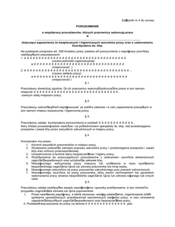 Załącznik nr 4 do umowy POROZUMIENIE o współpracy pracodawców, których pracownicy wykonują prace w ……………………………………………………………………………………………… dotyczące zapewnienia im bezpiecznych i higienicznych warunków pracy oraz o ustanowieniu koordynatora ds. bhp Na podstawie przepisów art. 208 Kodeksu pracy zawiera się porozumienie o współpracy pomiędzy następującymi pracodawcami: 1. …………………………………………………………………………………………… (nazwa jednostki organizacyjnej) w ………………………………………………………………………………… (miejscowość ) 2. ……………………………………………………………………………………………….. (nazwa zakładu pracy) w …………………………………………………………………………………… (miejscowość ) § 1. Pracodawcy stwierdzaj zgodnie, że ich pracownicy wykonują jednocześnie prace w tym samym miejscu………………………………………………………………………………. -zwanym dalej miejscem pracy. § 2. Pracodawcy zobowiązują się współpracować ze sobą w zakresie i w celu zapewnienia pracującym w tym samym miejscu bezpiecznej i higienicznej pracy. § 3. Pracodawcy ustalaj koordynatora porozumienia w osobie…………………………………, który będzie prowadził nadzór osobiście i za pośrednictwem specjalisty ds. bhp, nad przestrzeganie przepisów i zasad bhp przez wszystkich zatrudnionych w miejscu pracy. § 4. Koordynator ma prawo: 1. Kontroli wszystkich pracowników w miejscu pracy, 2. Wydawania poleceń w zakresie poprawy warunków pracy i przestrzegania przepisów i zasad bhp oraz ochrony przeciwpożarowej, 3. Uczestniczenia w kontroli stanu bezpieczeństwa i higieny pracy, 4. Występowania do poszczególnych pracodawców z zaleceniem usunięcia stwierdzonych zagrożeń wypadkowych oraz uchybień w zakresie bhp, 5. Niezwłocznego wstrzymania pracy maszyny lub urządzenia w razie wystąpienia bezpośredniego zagrożenia życia lub zdrowia pracownika lub innej osoby, 6. Niezwłocznego odsunięcia od pracy pracownika zatrudnionego przy pracach wzbronionych, 7. Niezwłocznego osunięcia od pracy pracownika, który swoim zachowaniem lub sposobem wykonywania pracy stwarza bezpośrednie zagrożenie życia lub zdrowia własnego lub innych osób. § 5. Pracodawcy ustalaj następujące zasady współdziałania i sposoby postępowania, w tym również w przypadku zagrożeń dla zdrowia lub życia pracowników: I. Przed nawiązanie współpracy, a także okresowo, według ustaleń stron, organizowane będą spotkania upoważnionych przedstawicieli wymienionych zakładów pracy, w celu omówienia zagadnień dotyczących zagrożeń wypadkowych oraz bezpieczeństwa pracy. II. Podstawą dopuszczenia do pracy na terenie …………………………………….jest: 1. Posiadania obowiązujących profilaktycznych bada lekarskich, 2. Uprzednie odbycie z pracownikami wymaganych szkoleń w zakresie bhp, 3. Posiadanie przez pracowników środków indywidualnych ochrony, odzieży i obuwia roboczego, 4. Zapoznanie z instrukcjami bhp i p.poż ., obowiązującymi w ………………………… 5. Zapoznanie pracowników o zakresie występujących zagrożeń wypadkowych, 6. Posiadanie stosowanych kwalifikacji zawodowych na wykonywanie określonych prac: …………………………………………………………………………………………………………… ……………………………………………………………………… III. ………………………………………………………………………………………… (nazwa firmy zewnętrznej pracodawcy) będzie przekazywała do pracy na terenie …………………………………….wyłącznie takich pracowników, którzy spełniaj wymagania określone w pkt. II. 1-6. Każdorazowo przed delegowaniem pracownika współpracująca firma będzie dostarczała pisemną informację potwierdzającą spełnienie formalnych wymaga przez pracowników, w zakresie bezpieczeństwa i higieny pracy oraz kwalifikacji zawodowych niezbędnych do wykonywania zleconych prac. IV. ………………………………………………………………………………………………… (firma zlecaj ca prac ) Zobowiązuje się do: 1. Przeprowadzenia przez osoby kierujące pracownikami instruktażu stanowiskowego oraz przekazywania informacji o zakresie występujących zagrożeń wypadkowych, 2. Organizacji pomieszczeń i stanowisk pracy w sposób zapewniający bezpieczne i higieniczne warunki pracy oraz ochronę przeciwpożarową , 3. Zapoznania pracowników z instrukcją bezpieczeństwa pożarowego i procedur ewakuacji, 4. Udostępnienia pracownikom posiadanych pomieszczeń higieniczno-sanitarnych i środków higieny osobistej, 5. Udzielanie pierwszej pomocy przedlekarskiej na zasadach przyjętych w: …………………………………………………………………………………………………………….. V. W razie zaistnienia wypadku przy pracy pracownika ………………………… ustalenia okoliczności i przyczyn wypadku dokonuje zespól powypadkowy powołany przez zakład pracy poszkodowanego pracownika. Ustalenie przyczyn i okoliczności wypadku odbywa się w obecności przedstawiciela ………………………………………. VI. Pracownicy ………………………………………………………………... w miejscu pracy zobowiązani się do przestrzegania obowiązujących przepisów i zasad bhp. § 6. Wszystkie zmiany lub uzupełnienia do treści porozumienia mogą być określane w załączniku do niniejszego Porozumienia i podpisane przez przedstawicieli obu stron. § 7. Porozumienie sporządzono w dwóch jednobrzmiących egzemplarzach po jednym dla każdej ze strony. Porozumienie