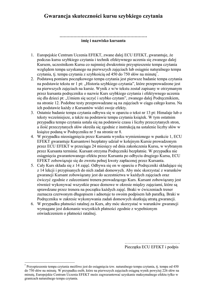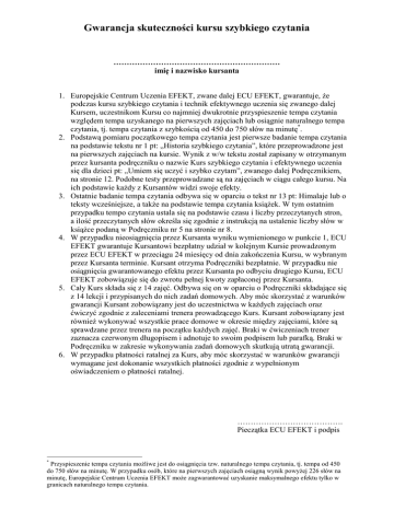 Gwarancja skuteczności kursu szybkiego czytania ……………………………………………………… imię i nazwisko kursanta 1. Europejskie Centrum Uczenia EFEKT, zwane dalej ECU EFEKT, gwarantuje, Ŝe podczas kursu szybkiego czytania i technik efektywnego uczenia się zwanego dalej Kursem, uczestnikom Kursu co najmniej dwukrotnie przyspieszenie tempa czytania względem tempa uzyskanego na pierwszych zajęciach lub osiągnie naturalnego tempa czytania, tj. tempa czytania z szybkością od 450 do 750 słów na minutę*. 2. Podstawą pomiaru początkowego tempa czytania jest pierwsze badanie tempa czytania na podstawie tekstu nr 1 pt: „Historia szybkiego czytania”, które przeprowadzone jest na pierwszych zajęciach na kursie. Wynik z w/w tekstu został zapisany w otrzymanym przez kursanta podręczniku o nazwie Kurs szybkiego czytania i efektywnego uczenia się dla dzieci pt: „Umiem się uczyć i szybko czytam”, zwanego dalej Podręcznikiem, na stronie 12. Podobne testy przeprowadzane są na zajęciach w ciągu całego kursu. Na ich podstawie kaŜdy z Kursantów widzi swoje efekty. 3. Ostatnie badanie tempa czytania odbywa się w oparciu o tekst nr 13 pt: Himalaje lub o teksty wcześniejsze, a takŜe na podstawie tempa czytania ksiąŜek. W tym ostatnim przypadku tempo czytania ustala się na podstawie czasu i liczby przeczytanych stron, a ilość przeczytanych słów określa się zgodnie z instrukcją na ustalenie liczby słów w ksiąŜce podaną w Podręczniku nr 5 na stronie nr 8. 4. W przypadku nieosiągnięcia przez Kursanta wyniku wymienionego w punkcie 1, ECU EFEKT gwarantuje Kursantowi bezpłatny udział w kolejnym Kursie prowadzonym przez ECU EFEKT w przeciągu 24 miesięcy od dnia zakończenia Kursu, w wybranym przez Kursanta terminie. Kursant otrzyma Podręczniki bezpłatnie. W przypadku nie osiągnięcia gwarantowanego efektu przez Kursanta po odbyciu drugiego Kursu, ECU EFEKT zobowiązuje się do zwrotu pełnej kwoty zapłaconej przez Kursanta. 5. Cały Kurs składa się z 14 zajęć. Odbywa się on w oparciu o Podręczniki składające się z 14 lekcji i przypisanych do nich zadań domowych. Aby móc skorzystać z warunków gwarancji Kursant zobowiązany jest do uczestnictwa w kaŜdych zajęciach oraz ćwiczyć zgodnie z zaleceniami trenera prowadzącego Kurs. Kursant zobowiązany jest równieŜ wykonywać wszystkie prace domowe w okresie między zajęciami, które są sprawdzane przez trenera na początku kaŜdych zajęć. Braki w ćwiczeniach trener zaznacza czerwonym długopisem i adnotuje to swoim podpisem lub parafką. Braki w Podręczniku w zakresie wykonywania zadań domowych skutkują utratą gwarancji. 6. W przypadku płatności ratalnej za Kurs, aby móc skorzystać w warunków gwarancji wymagane jest dokonanie wszystkich płatności zgodnie z wypełnionym oświadczeniem o płatności ratalnej. …………………………………. Pieczątka ECU EFEKT i podpis * Przyspieszenie tempa czytania moŜliwe jest do osiągnięcia tzw. naturalnego tempa czytania, tj. tempa od 450 do 750 słów na minutę. W przypadku osób, które na pierwszych zajęciach osiągną wynik powyŜej 226 słów na minutę, Europejskie Centrum Uczenia EFEKT moŜe zagwarantować uzyskanie maksymalnego efektu tylko w granicach naturalnego tempa czytania.