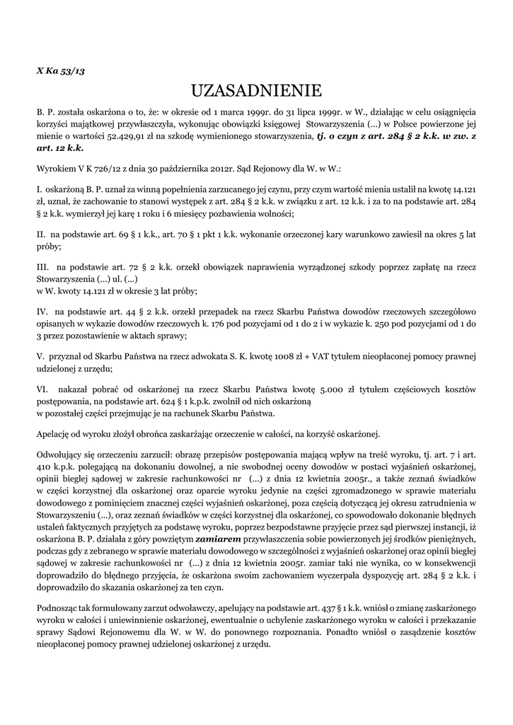 X Ka 53/13 UZASADNIENIE B. P. została oskarżona o to, że: w okresie od 1 marca 1999r. do 31 lipca 1999r. w W., działając w celu osiągnięcia korzyści majątkowej przywłaszczyła, wykonując obowiązki księgowej Stowarzyszenia (...) w Polsce powierzone jej mienie o wartości 52.429,91 zł na szkodę wymienionego stowarzyszenia, tj. o czyn z art. 284 § 2 k.k. w zw. z art. 12 k.k. Wyrokiem V K 726/12 z dnia 30 października 2012r. Sąd Rejonowy dla W. w W.: I. oskarżoną B. P. uznał za winną popełnienia zarzucanego jej czynu, przy czym wartość mienia ustalił na kwotę 14.121 zł, uznał, że zachowanie to stanowi występek z art. 284 § 2 k.k. w związku z art. 12 k.k. i za to na podstawie art. 284 § 2 k.k. wymierzył jej karę 1 roku i 6 miesięcy pozbawienia wolności; II. na podstawie art. 69 § 1 k.k., art. 70 § 1 pkt 1 k.k. wykonanie orzeczonej kary warunkowo zawiesił na okres 5 lat próby; III. na podstawie art. 72 § 2 k.k. orzekł obowiązek naprawienia wyrządzonej szkody poprzez zapłatę na rzecz Stowarzyszenia (...) ul. (...) w W. kwoty 14.121 zł w okresie 3 lat próby; IV. na podstawie art. 44 § 2 k.k. orzekł przepadek na rzecz Skarbu Państwa dowodów rzeczowych szczegółowo opisanych w wykazie dowodów rzeczowych k. 176 pod pozycjami od 1 do 2 i w wykazie k. 250 pod pozycjami od 1 do 3 przez pozostawienie w aktach sprawy; V. przyznał od Skarbu Państwa na rzecz adwokata S. K. kwotę 1008 zł + VAT tytułem nieopłaconej pomocy prawnej udzielonej z urzędu; VI. nakazał pobrać od oskarżonej na rzecz Skarbu Państwa kwotę 5.000 zł tytułem częściowych kosztów postępowania, na podstawie art. 624 § 1 k.p.k. zwolnił od nich oskarżoną w pozostałej części przejmując je na rachunek Skarbu Państwa. Apelację od wyroku złożył obrońca zaskarżając orzeczenie w całości, na korzyść oskarżonej. Odwołujący się orzeczeniu zarzucił: obrazę przepisów postępowania mającą wpływ na treść wyroku, tj. art. 7 i art. 410 k.p.k. polegającą na dokonaniu dowolnej, a nie swobodnej oceny dowodów w postaci wyjaśnień oskarżonej, opinii biegłej sądowej w zakresie rachunkowości nr (...) z dnia 12 kwietnia 2005r., a także zeznań świadków w części korzystnej dla oskarżonej oraz oparcie wyroku jedynie na części zgromadzonego w sprawie materiału dowodowego z pominięciem znacznej części wyjaśnień oskarżonej, poza częścią dotyczącą jej okresu zatrudnienia w Stowarzyszeniu (...), oraz zeznań świadków w części korzystnej dla oskarżonej, co spowodowało dokonanie błędnych ustaleń faktycznych przyjętych za podstawę wyroku, poprzez bezpodstawne przyjęcie przez sąd pierwszej instancji, iż oskarżona B. P. działała z góry powziętym zamiarem przywłaszczenia sobie powierzonych jej środków pieniężnych, podczas gdy z zebranego w sprawie materiału dowodowego w szczególności z wyjaśnień oskarżonej oraz opinii biegłej sądowej w zakresie rachunkowości nr (...) z dnia 12 kwietnia 2005r. zamiar taki nie wynika, co w konsekwencji doprowadziło do błędnego przyjęcia, że oskarżona swoim zachowaniem wyczerpała dyspozycję art. 284 § 2 k.k. i doprowadziło do skazania oskarżonej za ten czyn. Podnosząc tak formułowany zarzut odwoławczy, apelujący na podstawie art. 437 § 1 k.k. wniósł o zmianę zaskarżonego wyroku w całości i uniewinnienie oskarżonej, ewentualnie o uchylenie zaskarżonego wyroku w całości i przekazanie sprawy Sądowi Rejonowemu dla W. w W. do ponownego rozpoznania. Ponadto wniósł o zasądzenie kosztów nieopłaconej pomocy prawnej udzielonej oskarżonej z urzędu. Sąd okręgowy zważył, co następuje: Apelację wywiedziono jedynie na korzyść oskarżonej, co uniemożliwia wydania jakiegokolwiek rozstrzygnięcia mniej korzystnego dla niej niż kontrolowane (chociażby w zakresie ustalenia rzeczywistego okresu zajmowania się przez oskarżoną księgowością pokrzywdzonego podmiotu). Wniesienie środka odwoławczego skutkowało dokonaniem kontroli instancyjnej orzeczenia i zmianą zaskarżonego wyroku w części dotyczącej procesowo możliwej do przypisania oskarżonej wartości przyłaszonego przez nią mienia. Sygnalizowana zmiana skutkowała również korektą wysokości zobowiązania oskarżonej do naprawienia szkody wyrządzonej pokrzywdzonemu. W pozostałym zakresie orzeczenie sądu rejonowego nie mogło zostać skutecznie podważone, a zarzuty zgłoszone przez obrońcę oraz wnioski apelacji o uniewinnienie lub o uchylenia zaskarżonego orzeczenia i przekazanie sprawy do ponownego rozpoznania nie zasługiwały na uwzględnienie. Na wstępie od razu należy wskazać na niedostatki kontrolowanego rozstrzygnięcia i jego uzasadnienia, które – wobec wniesienia środka odwoławczego jedynie na korzyść oskarżonej i wobec statuowanej w art. 443 zasadzie zakazu reformationis in peius – obligowały sąd odwoławczy do dokonania korekty wyroku w kierunku oczekiwanym przez podsądną. Po pierwsze: sąd rejonowy przypisał oskarżonej przestępne działanie w okresie od 1 marca 1999r. do 31 lipca 1999r. polegające na przywłaszczeniu łącznie 14.121 zł. Jak wynika z pisemnych motywów sądu rejonowego na kwotę tę składała się m.in. suma 3.500 zł, która zgodnie z ustaleniami sądu I. instancji miała zostać przywłaszczona w styczniu 1999r. (k. 707, s. 1 uzasadnienia). Skoro oskarżonej przypisano przestępne działanie jedynie w okresie od 1 marca 1999r. do 31 lipca 1999r., z wartości przywłaszczonego przez nią mienia należało wyeliminować to, które miała przywłaszczyć w styczniu 1999r. Po wtóre: słusznie podnosi apelujący, że penalizowane w art. 284 k.k. przywłaszczenie jest działaniem intencjonalnym, umyślnym z zamiarem kierunkowym. Tym samym niedopuszczalne było przypisanie oskarżonej przywłaszczenia także kwoty 3.921 zł, która jak ustalił to sąd rejonowy była „wynikiem błędnego wprowadzenia przez B. P. do raportów kasowych k