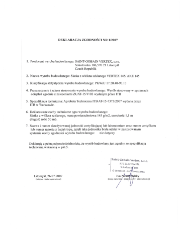 DEKLARACJA 1. Producent wyrobu budowlanego: 2. Nazwa wyrobu budowlanego: ZGODNOŚCI NR 1/2007 SAINT-GOBAIN VERTEX, s.r.o. Sokolovska 106,570 21 Litomyśl Czech Republik Siatka z włókna szklanego VERTEX 145/ AKE 145 3. Klasyfikacja statystyczna wyrobu budowlanego: PKWiU 17.20.40-90.13 4. Przeznaczenie i zakres stosowania wyrobu budowlanego: Wyrób stosowany w systemach ociepleń zgodnie z zaleceniami ZUAT-15/V/03 wydanym przez ITB 5. Specyfikacja techniczna: Aprobata Techniczna ITB AT-l 5-73 73/2007 wydana przez ITB w Warszawie. 6. Deklarowane cechy techniczne typu wyrobu budowlanego: Siatka z włókna szklanego, masa powierzchniowa 145 g/mż, szerokość 1,1 m długość rolki 50 mb. 7. Nazwa i numer akredytowanej jednostki certyfikującej lub laboratorium oraz numer certyfikatu lub numer raportu z badań typu, jeżeli taka jednostka brała udział w zastosowanym systemie oceny zgodności wyrobu budowlanego: nie dotyczy Deklaruję z pełną odpowiedzialnością, techniczną wskazaną w pkt.5. że wyrób budowlany jest zgodny ze specyfikacją saint-GObain \I) / I_ Sokoiovsk I le DOGU/Hi} Litomyśl, 26.07.2007 (miejsce i data wystawienia) (;m;ę'"7 Vertex, s. r. o. 57021lłTOMYSL 106 '~i~ _i!gt;>QUt.;~a ;::~;o ; podP~ sky sdby upoważnionej)
