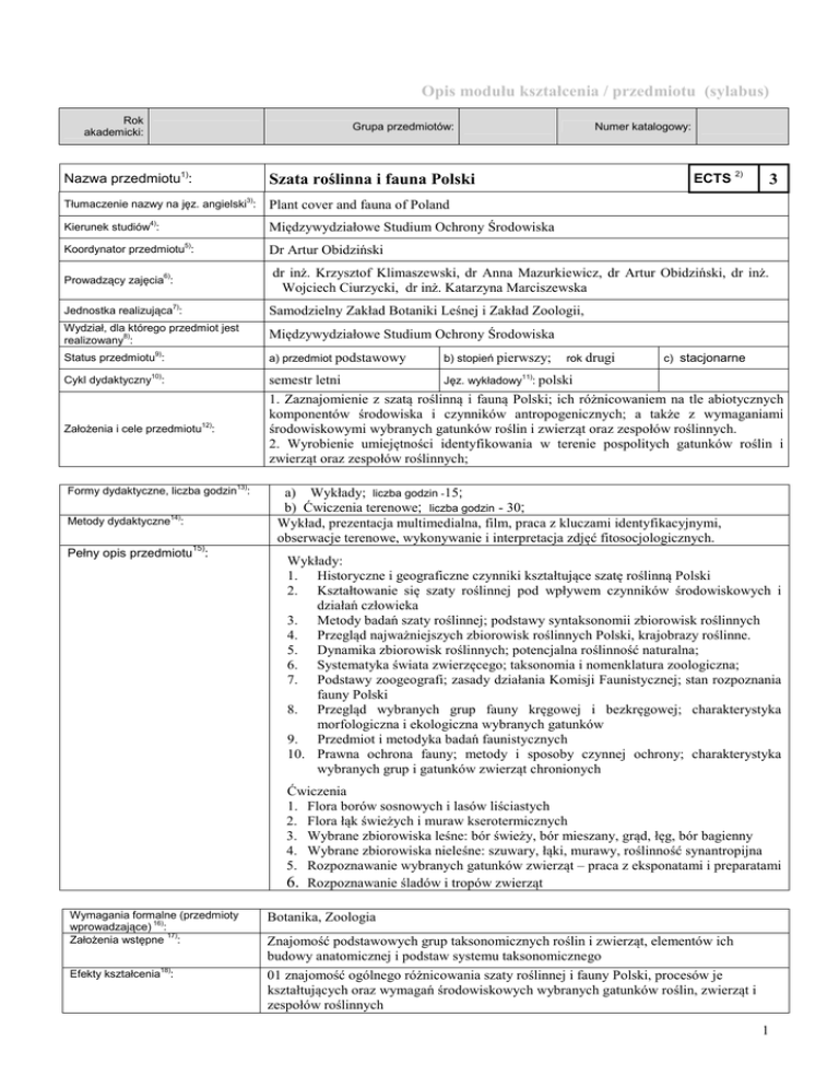 Opis modułu kształcenia / przedmiotu (sylabus) Rok akademicki: Grupa przedmiotów: Nazwa przedmiotu1): Szata roślinna i fauna Polski Tłumaczenie nazwy na jęz. angielski3): Plant cover and fauna of Poland 4) Numer katalogowy: ECTS 2) Kierunek studiów : Międzywydziałowe Studium Ochrony Środowiska Koordynator przedmiotu5): Dr Artur Obidziński 3 dr inż. Krzysztof Klimaszewski, dr Anna Mazurkiewicz, dr Artur Obidziński, dr inż. Wojciech Ciurzycki, dr inż. Katarzyna Marciszewska Prowadzący zajęcia6): Jednostka realizująca7): Samodzielny Zakład Botaniki Leśnej i Zakład Zoologii, Wydział, dla którego przedmiot jest realizowany8): Międzywydziałowe Studium Ochrony Środowiska Status przedmiotu9): a) przedmiot podstawowy 10) b) stopień pierwszy; rok drugi c) stacjonarne 11) Cykl dydaktyczny : Założenia i cele przedmiotu12): Formy dydaktyczne, liczba godzin13): Metody dydaktyczne14): semestr letni Jęz. wykładowy : polski 1. Zaznajomienie z szatą roślinną i fauną Polski; ich różnicowaniem na tle abiotycznych komponentów środowiska i czynników antropogenicznych; a także z wymaganiami środowiskowymi wybranych gatunków roślin i zwierząt oraz zespołów roślinnych. 2. Wyrobienie umiejętności identyfikowania w terenie pospolitych gatunków roślin i zwierząt oraz zespołów roślinnych; a) Wykłady; liczba godzin -15; b) Ćwiczenia terenowe; liczba godzin - 30; Wykład, prezentacja multimedialna, film, praca z kluczami identyfikacyjnymi, obserwacje terenowe, wykonywanie i interpretacja zdjęć fitosocjologicznych. 15) Pełny opis przedmiotu : Wykłady: 1. Historyczne i geograficzne czynniki kształtujące szatę roślinną Polski 2. Kształtowanie się szaty roślinnej pod wpływem czynników środowiskowych i działań człowieka 3. Metody badań szaty roślinnej; podstawy syntaksonomii zbiorowisk roślinnych 4. Przegląd najważniejszych zbiorowisk roślinnych Polski, krajobrazy roślinne. 5. Dynamika zbiorowisk roślinnych; potencjalna roślinność naturalna; 6. Systematyka świata zwierzęcego; taksonomia i nomenklatura zoologiczna; 7. Podstawy zoogeografi; zasady działania Komisji Faunistycznej; stan rozpoznania fauny Polski 8. Przegląd wybranych grup fauny kręgowej i bezkręgowej; charakterystyka morfologiczna i ekologiczna wybranych gatunków 9. Przedmiot i metodyka badań faunistycznych 10. Prawna ochrona fauny; metody i sposoby czynnej ochrony; charakterystyka wybranych grup i gatunków zwierząt chronionych Ćwiczenia 1. Flora borów sosnowych i lasów liściastych 2. Flora łąk świeżych i muraw kserotermicznych 3. Wybrane zbiorowiska leśne: bór świeży, bór mieszany, grąd, łęg, bór bagienny 4. Wybrane zbiorowiska nieleśne: szuwary, łąki, murawy, roślinność synantropijna 5. Rozpoznawanie wybranych gatunków zwierząt – praca z eksponatami i preparatami 6. Rozpoznawanie śladów i tropów zwierząt Wymagania formalne (przedmioty wprowadzające) 16): Założenia wstępne 17): Efekty kształcenia18): Botanika, Zoologia Znajomość podstawowych grup taksonomicznych roślin i zwierząt, elementów ich budowy anatomicznej i podstaw systemu taksonomicznego 01 znajomość ogólnego różnicowania szaty roślinnej i fauny Polski, procesów je kształtujących oraz wymagań środowiskowych wybranych gatunków roślin, zwierząt i zespołów roślinnych 1 Sposób weryfikacji efektów kształcenia19): Forma dokumentacji osiągniętych efektów kształcenia 20): Elementy i wagi mające wpływ na ocenę końcową21): Miejsce realizacji zajęć 22): 02 umiejętność rozpoznawania pospolitych gatunków roślin i zbiorowisk roślinnych 03 umiejętność rozpoznawania pospolitych zwierząt i śladów ich bytowania 04 umiejętność wykonywania zdjęć fitosocjologicznych egzamin pisemny z wiedzy wykładowej i ćwiczeniowej: 01, 02, 03, 04 ocena sprawozdań z ćwiczeń: 03, 04 prace egzaminacyjne, sprawozdania z ćwiczeń prace egzaminacyjne – 2/3, sprawozdania z ćwiczeń terenowych – 1/3, sala wykładowa, sala ćwiczeniowa, teren, Literatura podstawowa i uzupełniająca 23): a) podstawowa Busse P. (red) 1991. Mały Słownik Zoologiczny Ptaki. Wiedza Powszechna. Warszawa Juszczyk W.1987. Płazy i gady krajowe. PWN Warszawa Kowalski K. 1991. Mały Słownik Zoologiczny - Ssaki. Wiedza Powszechna. Warszawa Matuszkiewicz W., Szata roślinna. [W:] Starkel L. (red.), Geografia Polski-Środowisko przyrodnicze, 1999. PWN. Warszawa. Szafer W., Zarzycki K. (red.), Szata roślinna Polski. 1972. PWN. Warszawa. Wysocki Cz., Sikorski P., Fitosocjologia stosowana. 2002. Wydawnictwo SGGW. Warszawa b) uzupełniająca Andrzejewski R., Weigle A. 2003. Różnorodność biologiczna Polski. NFOŚ. Warszawa. Kornaś J., Medwecka-Kornaś A. Geografia roślin. 2002. PWN. Warszawa. Matuszkiewicz M.J. 2002. Zespoły leśne Polski. Wyd. Nauk.PWN. Warszawa. Nawara Z. 2006. Rośliny łąkowe. Mulico. Warszawa. Tomiałojć L., Stawarczyk T. 2004. Awifauna Polski - Rozmieszczenie, liczebność i zmiany. Bogucki Wydawnictwo Naukowe. Wrocław UWAGI24): 2) Całkowity nakład czasu pracy - przyporządkowania ECTS : Wykłady Ćwiczenia terenowe Udział w konsultacjach (1/3 wszystkich konsultacji) Dokończenie sprawozdań z ćwiczeń terenowych Przygotowanie się do egzaminu Obecność na egzaminie Razem: 15h 30h 5h 10h 20h 2h 82 h 3,3 ECTS W ramach całkowitego nakładu czasu pracy studenta - łączna liczba punktów ECTS, którą student uzyskuje na zajęciach wymagających bezpośredniego udziału nauczycieli akademickich Wykłady 15h Ćwiczenia terenowe 30h Udział w konsultacjach (1/3 wszystkich konsultacji) 5h Obecność na egzaminie 2h Razem: 52h 2,1 ECTS W ramach całkowitego nakładu czasu pracy studenta - łączna liczba punktów ECTS, którą student uzyskuje w ramach zajęć o charakterze praktycznym Ćwiczenia terenowe 30h Dokończenie sprawozdań z ćwiczeń terenowych 10h Udział w konsultacjach (1/3 wszystkich konsultacji) 5h Razem: 48h 1,8 ECTS 25) Wskaźniki 