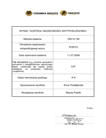 WYNIKI KONTROLI WŁA CIWO CI ANTYPO LIZGOWEJ Metoda badania Okre lenie wła ciwo ci antypo lizgowej wzoru Data wykonania badania DIN 51130 PORTO 11.07.2006 K t akceptacji αges ( rednia wszystkich pomiarów z uwzgl dnieniem obliczonego bł du, ustalonego dla ka dej osoby badaj cej na podstawie kalibracji urz dzenia). 6,6o Klasa hamowania po lizgu R9 Opracowanie wyników Anna Podd bniak Akceptacja wyników Maciej Pawlik Podpis: