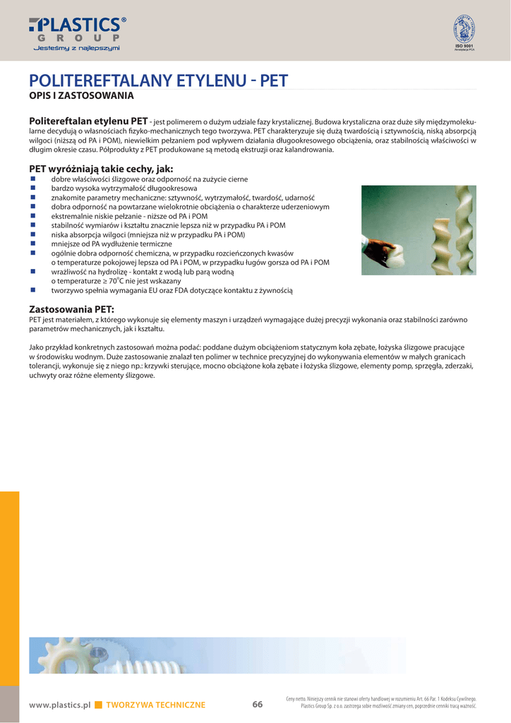 POLITEREFTALANY ETYLENU - PET OPIS I ZASTOSOWANIA Politereftalan etylenu PET - jest polimerem o dużym udziale fazy krystalicznej. Budowa krystaliczna oraz duże siły międzymolekularne decydują o własnościach fizyko-mechanicznych tego tworzywa. PET charakteryzuje się dużą twardością i sztywnością, niską absorpcją wilgoci (niższą od PA i POM), niewielkim pełzaniem pod wpływem działania długookresowego obciążenia, oraz stabilnością właściwości w długim okresie czasu. Półprodukty z PET produkowane są metodą ekstruzji oraz kalandrowania. PET wyróżniają takie cechy, jak: dobre właściwości ślizgowe oraz odporność na zużycie cierne bardzo wysoka wytrzymałość długookresowa znakomite parametry mechaniczne: sztywność, wytrzymałość, twardość, udarność dobra odporność na powtarzane wielokrotnie obciążenia o charakterze uderzeniowym ekstremalnie niskie pełzanie - niższe od PA i POM stabilność wymiarów i kształtu znacznie lepsza niż w przypadku PA i POM niska absorpcja wilgoci (mniejsza niż w przypadku PA i POM) mniejsze od PA wydłużenie termiczne ogólnie dobra odporność chemiczna, w przypadku rozcieńczonych kwasów o temperaturze pokojowej lepsza od PA i POM, w przypadku ługów gorsza od PA i POM wrażliwość na hydrolizę - kontakt z wodą lub parą wodną o o temperaturze ≥ 70 C nie jest wskazany tworzywo spełnia wymagania EU oraz FDA dotyczące kontaktu z żywnością Zastosowania PET: PET jest materiałem, z którego wykonuje się elementy maszyn i urządzeń wymagające dużej precyzji wykonania oraz stabilności zarówno parametrów mechanicznych, jak i kształtu. Jako przykład konkretnych zastosowań można podać: poddane dużym obciążeniom statycznym koła zębate, łożyska ślizgowe pracujące w środowisku wodnym. Duże zastosowanie znalazł ten polimer w technice precyzyjnej do wykonywania elementów w małych granicach tolerancji, wykonuje się z niego np.: krzywki sterujące, mocno obciążone koła zębate i łożyska ślizgowe, elementy pomp, sprzęgła, zderzaki, uchwyty oraz różne elementy ślizgowe. www.plastics.pl TWORZYWA TECHNICZNE 66 Ceny netto. Niniejszy cennik nie stanowi oferty handlowej w rozumieniu Art. 66 Par. 1 Kodeksu Cywilnego. Plastics Group Sp. z o.o. zastrzega sobie możliwość zmiany cen, poprzednie cenniki tracą ważność. POZOSTAŁE RODZAJE PET - NA ZAMÓWIENIE OPIS I ZASTOSOWANIA Politereftalan etylenu PET TF – jest modyfikacją formy podstawowej dodatkiem PTFE. Modyfikator pełniący rolę smaru wpływa bardzo korzystnie na właściwości ślizgowe polimeru podnosząc jego odporność na zużycie cierne i obniżając współczynnik tarcia. PET TF podobnie jak postać podstawowa jest tworzywem wrażliwym na hydrolizę, co eliminuje ten materiał w przypadkach wymagających kontaktu z wodą lub parą wodną o temperaturze przekraczającej 70oC. Tworzywo spełnia wytyczne FDA oraz EU dotyczące kontaktu z żywnością. Zastosowania PET TF: Tworzywo jest bardzo dobrym materiałem na elementy ślizgowe poddane dużym obciążeniom, jak np: łożyska poprzeczne, tuleje łożyskowe, listwy prowadzące, różne elementy stabilne wymiarowo w technice precyzyjnej, takich jak: elementy izolacyjne w elektrotechnice, koła zębate, rolki, tulejki, listwy ślizgowe, elementy pomp, tłoki rozdzielaczy. Szczegółowe informacje dotyczące modyfikacji niestandardowych dostępne są u specjalisty Plastics Group. SKŁADOWANIE najlepiej w skrzyniach lub na paletach zwracając uwagę na płaskość powierzchni magazynowej - nierówne powierzchnie mogą doprowadzić do trwałego odkształcenia (wygięcia) składowanych półproduktów. ze względu na wrażliwość tworzywa na wpływ promieniowania UV (jedynie modyfikacje w kolorze czarnym wykazują podwyższona odporność na UV) oraz absorpcję wilgoci, która wpływa na parametry fizyko-mechaniczne, konieczne jest przechowywanie tworzywa w pomieszczeniu zadaszonym, izolującym od wpływu czynników atmosferycznych. o ze względu na przeważający rodzaj obróbki (skrawanie) optymalna temperatura otoczenia winna wynosić ok. 20 C OBRÓBKA - szczegółowe wytyczne zawarte są w katalogu oraz dostępne u specjalisty. wszelkie metody obróbki wiórowej (cięcie, wiercenie, toczenie, frezowanie, szlifowanie, heblowanie) z uwzględnieniem wytycznych dla tworzyw sztucznych spawanie oraz klejenie zadruk galwanizowanie Ceny netto. Niniejszy cennik nie stanowi oferty handlowej w rozumieniu Art. 66 Par. 1 Kodeksu Cywilnego. Plastics Group Sp. z o.o. zastrzega sobie możliwość zmiany cen, poprzednie cenniki tracą ważność. 67 TWORZYWA TECHNICZNE www.plastics.pl WAŁKI PET CENNIK PŁYTY PET CENNIK Ceny netto PLN/m2, VAT 23% Średnica / Długość PET natur PET czarny Średnica / Długość PET natur PET natur PET czarny PET czarny mm 3 000 3 000 mm 1000x2000 8-60x620x3000 70-100x620x2000 1000x2000 8-60x620x3000 70-100x620x2000 8 3,00 3,00 1 61,80 - 62,90 - 10 4,50 4,50 2 122,70 - 125,00 - 12 6,30 6,40 3 185,30 - 188,80 - 15 9,60 9,70 4 247,10 - 251,70 - 16 10,60 10,80 5 308,90 - 314,70 - 18 13,50 13,70 6 370,60 - 377,60 - 20 16,60 17,00 8 528,20 100,00 538,20 445,00 25 25,80 26,40 10 - 538,40 - 548,90 30 36,80 37,50 12 - 658,10 - 671,10 35 50,30 51,30 15 - 765,20 - 780,30 40 65,50 66,80 16 - 862,60 - 879,50 45 82,80 84,50 20 - 1 066,40 - 1 087,30 50 102,30 104,30 25 - 1 321,50 - 1 347,40 55 123,50 126,00 30 - 1 607,10 - 1 638,60 60 146,90 149,80 35 - 1 786,20 - 1 821,20 65 171,70 175,10 40 - 2 117,80 - 2 159,30 70 199,70 203,60 45 - 2 296,30 - 2 341,30 75 229,40 233,90 50 - 2 628,00 - 2 679,50 80 260,90 266,10 60 - 3 163,50 - 3 225,50 85 294,50 300,40 70 - 4 164,50 - 4 237,40 90 331,30 337,90 80 - 4 573,50 - 4 653,60 100 407,80 415,90 100 - 5 717,40 110 486,00 495,70 120 579,10 590,60 125 627,60 640,10 130 679,70 693,10 140 787,30 802,90 150 904,80 922,70 160 1 122,50 1 142,80 180 1 419,30 1 445,10 200 1 752,80 1 784,60 5 817,50 Odbiorcom hurtowym ofe