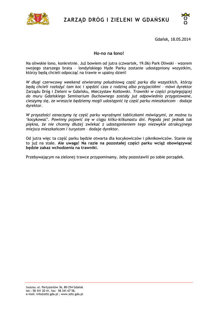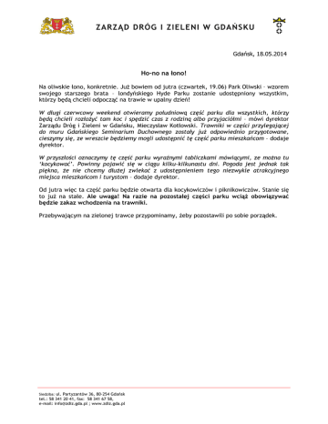 ZARZĄD DRÓG I ZIELENI W GDAŃSKU Gdańsk, 18.05.2014 Ho-no na łono! Na oliwskie łono, konkretnie. Już bowiem od jutra (czwartek, 19.06) Park Oliwski – wzorem swojego starszego brata – londyńskiego Hyde Parku zostanie udostępniony wszystkim, którzy będą chcieli odpocząć na trawie w upalny dzień! W długi czerwcowy weekend otwieramy południową część parku dla wszystkich, którzy będą chcieli rozłożyć tam koc i spędzić czas z rodziną albo przyjaciółmi – mówi dyrektor Zarządu Dróg i Zieleni w Gdańsku, Mieczysław Kotłowski. Trawniki w części przylegającej do muru Gdańskiego Seminarium Duchownego zostały już odpowiednio przygotowane, cieszymy się, ze wreszcie będziemy mogli udostępnić tę część parku mieszkańcom – dodaje dyrektor. W przyszłości oznaczymy tę część parku wyraźnymi tabliczkami mówiącymi, ze można tu ‘kocykować’. Powinny pojawić się w ciągu kilku-kilkunastu dni. Pogoda jest jednak tak piękna, że nie chcemy dłużej zwlekać z udostępnieniem tego niezwykle atrakcyjnego miejsca mieszkańcom i turystom – dodaje dyrektor. Od jutra więc ta część parku będzie otwarta dla kocykowiczów i piknikowiczów. Stanie się to już na stałe. Ale uwaga! Na razie na pozostałej części parku wciąż obowiązywać będzie zakaz wchodzenia na trawniki. Przebywającym na zielonej trawce przypominamy, żeby pozostawili po sobie porządek. Siedziba: ul. Partyzantów 36, 80-254 Gdańsk tel.: 58 341 20 41, fax: 58 341 67 58, e-mail: [email protected] ; www.zdiz.gda.pl