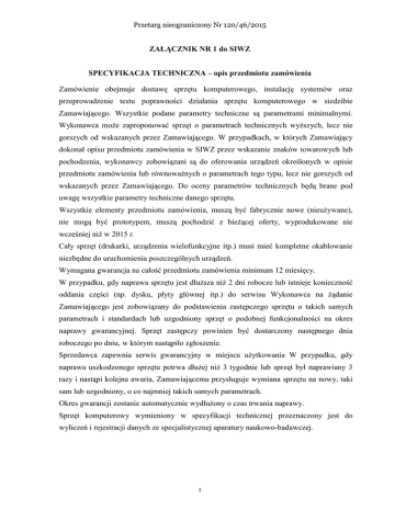 Przetarg nieograniczony Nr 120/46/2015 ZAŁĄCZNIK NR 1 do SIWZ SPECYFIKACJA TECHNICZNA – opis przedmiotu zamówienia Zamówienie obejmuje dostawę sprzętu komputerowego, instalację systemów oraz przeprowadzenie testu poprawności działania sprzętu komputerowego w siedzibie Zamawiającego. Wszystkie podane parametry techniczne są parametrami minimalnymi. Wykonawca może zaproponować sprzęt o parametrach technicznych wyższych, lecz nie gorszych od wskazanych przez Zamawiającego. W przypadkach, w których Zamawiający dokonał opisu przedmiotu zamówienia w SIWZ przez wskazanie znaków towarowych lub pochodzenia, wykonawcy zobowiązani są do oferowania urządzeń określonych w opisie przedmiotu zamówienia lub równoważnych o parametrach tego typu, lecz nie gorszych od wskazanych przez Zamawiającego. Do oceny parametrów technicznych będą brane pod uwagę wszystkie parametry techniczne danego sprzętu. Wszystkie elementy przedmiotu zamówienia, muszą być fabrycznie nowe (nieużywane), nie mogą być prototypem, muszą pochodzić z bieżącej oferty, wyprodukowane nie wcześniej niż w 2015 r. Cały sprzęt (drukarki, urządzenia wielofunkcyjne itp.) musi mieć kompletne okablowanie niezbędne do uruchomienia poszczególnych urządzeń. Wymagana gwarancja na całość przedmiotu zamówienia minimum 12 miesięcy. W przypadku, gdy naprawa sprzętu jest dłuższa niż 2 dni robocze lub istnieje konieczność oddania części (np. dysku, płyty głównej itp.) do serwisu Wykonawca na żądanie Zamawiającego jest zobowiązany do podstawienia zastępczego sprzętu o takich samych parametrach i standardach lub uzgodniony sprzęt o podobnej funkcjonalności na okres naprawy gwarancyjnej. Sprzęt zastępczy powinien być dostarczony następnego dnia roboczego po dniu, w którym nastąpiło zgłoszenie. Sprzedawca zapewnia serwis gwarancyjny w miejscu użytkowania W przypadku, gdy naprawa uszkodzonego sprzętu potrwa dłużej niż 3 tygodnie lub sprzęt był naprawiany 3 razy i nastąpi kolejna awaria, Zamawiającemu przysługuje wymiana sprzętu na nowy, taki sam lub uzgodniony, o co najmniej takich samych parametrach. Okres gwarancji zostanie automatycznie wydłużony o czas trwania naprawy. Sprzęt komputerowy wymieniony w specyfikacji technicznej przeznaczony jest do wyliczeń i rejestracji danych ze specjalistycznej aparatury naukowo-badawczej. 1 Przetarg nieograniczony Nr 120/46/2015 CZĘŚĆ A Zestaw Nazwa Zastosowanie Wymagane parametry techniczne Komputer przenośny będzie wykorzystywany dla potrzeb aplikacji biurowych, aplikacji edukacyjnych, aplikacji obliczeniowych, dostępu do Internetu oraz poczty elektronicznej, jako lokalna baza danych, stacja programistyczna Przekątna ekranu Komputer przenośny typu notebook z ekranem 13,3” o rozdzielczości min. 2560 x 1600 Procesor Procesor powinien osiągać w teście wydajności Geekbench 3 co najmniej wynik 3200 punktów w 64-bit Single Core. Płyta główna Wyposażona przez producenta w dedykowany chipset dla oferowanego procesora. Zaprojektowana na zlecenie producenta i oznaczona trwale na etapie produkcji nazwą lub logiem producenta oferowanego komputera. Pamięć RAM Min. 8GB DDR3L Pamięć masowa Min. 128 GB SSD Karta graficzna Zintegrowana w procesorze z możliwością dynamicznego przydzielenia pamięci systemowej Klawiatura Klawiatura z wbudowanym podświetleniem z czujnikiem oświetlenia zewnętrznego (układ US -QWERTY) Multimedia Karta dźwiękowa zintegrowana z płytą główną, zgodna z High Definition, wbudowane głośniki stereo Dwa kierunkowe, cyfrowe mikrofony z funkcja redukcji szumów i poprawy mowy wbudowane w obudowę komputera. Kamera internetowa o rozdzielczości min. 1280x720 pixels trwale zainstalowana w obudowie matrycy. Bateria i zasilanie Bateria litowo-polimerowa o pojemności min. 74Wh Zasilacz o mocy min. 60W z systemem prowadzenia kabla Waga i wymiary Waga max 1,6 kg Szerokość: max 315 mm Wysokość: max 19 mm Głębokość: max 220 mm Obudowa Certyfikaty Obudowa notebooka wykonana z aluminium Certyfikat ISO9001:2000 dla producenta sprzętu (należy załączyć do oferty) Certyfikat ISO 14001 dla producenta sprzętu (należy załączyć do oferty) Deklaracja zgodności CE (załączyć do oferty) Certyfikat EnergyStar min. 6.0 (załączyć do oferty ) System operacyjny Zainstalowany system operacyjny Porty i złącza Wbudowane porty i złącza : - 2x Thunderbolt 2 (do 20 Gb/s) 2x USB 3.0 1x HDMI Czytnik kart SDXC współdzielone złącze słuchawkowe stereo i złącze mikrofonowe tzw. 2 Przetarg nieograniczony Nr 120/46/2015 combo port zasilania Zintegrowana w postaci wewnętrznego modułu mini-PCI Express karta sieci WLAN obsługująca łącznie standardy IEEE 802.11 ac/a/b/g/n wraz z Bluetooth 4.0 Min. roczna gwarancja producenta - Warunki gwarancji Firma serwisująca musi posiadać ISO 9001:2000 na świadczenie usług serwisowych oraz posiadać autoryzacje producenta komputera – dokumenty potwierdzające załączyć do oferty. Serwis urządzeń musi być realizowany przez Producenta lub Autoryzowanego Partnera Serwisowego Producenta – wymagane dołączenie do oferty oświadczenia Producenta potwierdzonego, że serwis będzie realizowany przez Autoryzowanego Partnera Serwisowego Producenta lub bezpośrednio przez Producenta CZĘŚĆ B Komputer przenośny – 2 szt. Nazwa komponentu Typ Wymagane minimalne parametry techniczne komputerów Komputer przenośny typu notebook z ekranem 15,6" o rozdzielczości: HD (1366x768) w technologii LED, jasność min. 200 nitów, 16:9 Zastosowanie Komputer będzie wykorzystywany dla potrzeb aplikacji biurowych, aplikacji edukacyjnych, aplikacji obliczeniowych, dostępu do Internetu oraz poczty elektronicznej, jako lokalna baza danych, stacja programistyczna Procesor Procesor powinien osiągać w teście wydajności Geekbench 3 co najmniej średni wynik 1680 punktów w 32 Bit Multi-Core Score. Pamięć operacyjna 4GB możliwość rozbudowy do min 