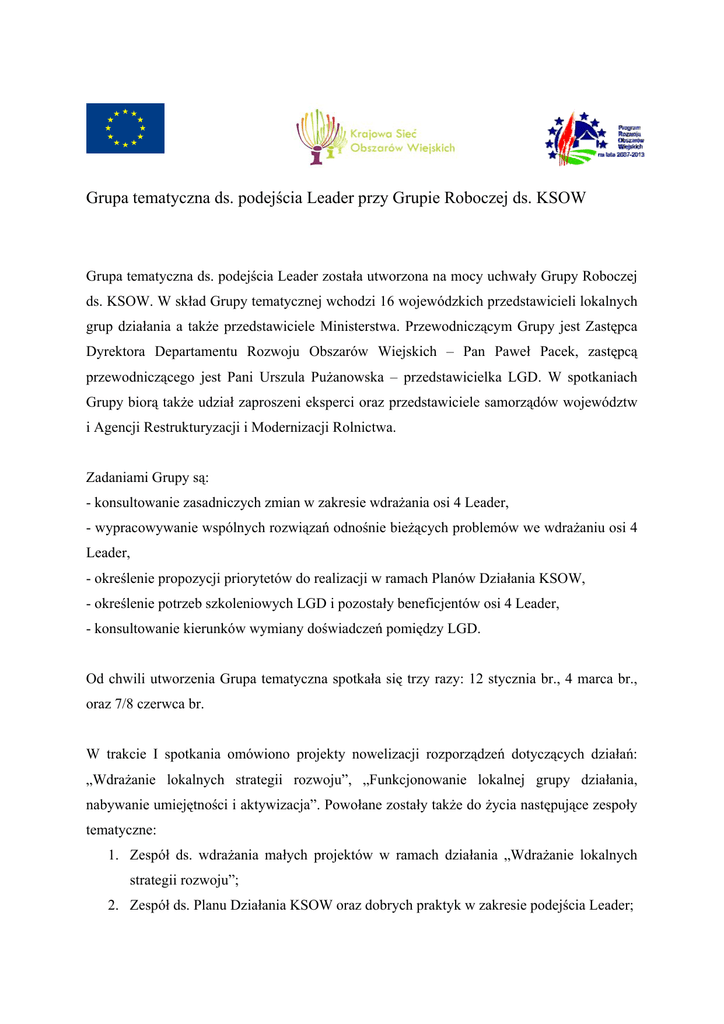 Grupa tematyczna ds. podejścia Leader przy Grupie Roboczej ds. KSOW Grupa tematyczna ds. podejścia Leader została utworzona na mocy uchwały Grupy Roboczej ds. KSOW. W skład Grupy tematycznej wchodzi 16 wojewódzkich przedstawicieli lokalnych grup działania a także przedstawiciele Ministerstwa. Przewodniczącym Grupy jest Zastępca Dyrektora Departamentu Rozwoju Obszarów Wiejskich – Pan Paweł Pacek, zastępcą przewodniczącego jest Pani Urszula Pużanowska – przedstawicielka LGD. W spotkaniach Grupy biorą także udział zaproszeni eksperci oraz przedstawiciele samorządów województw i Agencji Restrukturyzacji i Modernizacji Rolnictwa. Zadaniami Grupy są: - konsultowanie zasadniczych zmian w zakresie wdrażania osi 4 Leader, - wypracowywanie wspólnych rozwiązań odnośnie bieżących problemów we wdrażaniu osi 4 Leader, - określenie propozycji priorytetów do realizacji w ramach Planów Działania KSOW, - określenie potrzeb szkoleniowych LGD i pozostały beneficjentów osi 4 Leader, - konsultowanie kierunków wymiany doświadczeń pomiędzy LGD. Od chwili utworzenia Grupa tematyczna spotkała się trzy razy: 12 stycznia br., 4 marca br., oraz 7/8 czerwca br. W trakcie I spotkania omówiono projekty nowelizacji rozporządzeń dotyczących działań: „Wdrażanie lokalnych strategii rozwoju”, „Funkcjonowanie lokalnej grupy działania, nabywanie umiejętności i aktywizacja”. Powołane zostały także do życia następujące zespoły tematyczne: 1. Zespół ds. wdrażania małych projektów w ramach działania „Wdrażanie lokalnych strategii rozwoju”; 2. Zespół ds. Planu Działania KSOW oraz dobrych praktyk w zakresie podejścia Leader; 3. Zespół ds. wdrażania działania „Funkcjonowanie lokalnej grupy działania, nabywanie umiejętności i aktywizacja; 4. Zespół ds. zmiany zasad wdrażania podejścia Leader w ramach PROW 2007-2013. W trakcie II spotkania członkowie Grupy tematycznej poruszyli tematy zagrożeń wdrażania lokalnych strategii rozwoju w kontekście procedury oceny wniosków oraz zmian rozporządzenia dot. działania „Wdrażanie lokalnych strategii rozwoju”. Omówione zostały także uwagi lokalnych grup działania zgłoszone do nowelizacji rozporządzeń dot. „Wdrażanie lokalnych strategii rozwoju” oraz „Funkcjonowanie lokalnej grupy działania, nabywanie umiejętności i aktywizacja”. Grupa tematyczna zapoznała się także z wynikami wstępnego raportu z kontroli ETO oraz omówiła propozycje dotyczące tematów szkoleń związanych z wdrażaniem osi 4 Leader. Trzecie, dwudniowe spotkanie Grupy tematycznej dotyczyło m.in. omówienia aneksu do umowy o warunkach i sposobie realizacji lokalnej strategii rozwoju. Odbyła się także dyskusja nt. bieżących kwestii związanych z wdrażaniem lokalnych strategii rozwoju. W trakcie dyskusji członkowie grupy poruszyli nurtujący ich temat zaliczek. Kwestie zaliczek wyjaśniały przedstawicielki ARiMR, członkowi Grupy zgłosili uwagę by zaliczkami objąć także nieinwestycyjne małe projekty. Szczegółowo omówione zostały kryteria oceny efektywności LGD oraz realizacji LSR stanowiące załącznik nr 1 do projektu nowelizacji rozp. dot. wyboru LGD. Obecny kształt projektu ww. rozporządzenia w zakresie kryteriów stanowi więc efekt pracy Grupy tematycznej. Członkowie grupy pochylili się także nad kwestią limitów przyznania dodatkowych środków na realizację LSR – stwierdzono, ze kwota środków dodatkowych może stanowić procent środków obecnie przyznanych z zastrzeżeniem 2 gwarantowanych LGD na poziomie województwo, które muszą osiągnąć minimalną punktację. Omawiając nowelizację rozporządzenia dot. „Wdrażanie lokalnych strategii rozwoju” zdecydowano się wydłużyć okres przejściowy, na dostosowanie do nowych przepisów, do 5 miesięcy. Trzecie spotkanie Grupy zakończyło się omówieniem prac Grup roboczych przy Podkomitecie ds. podejścia Leader.
