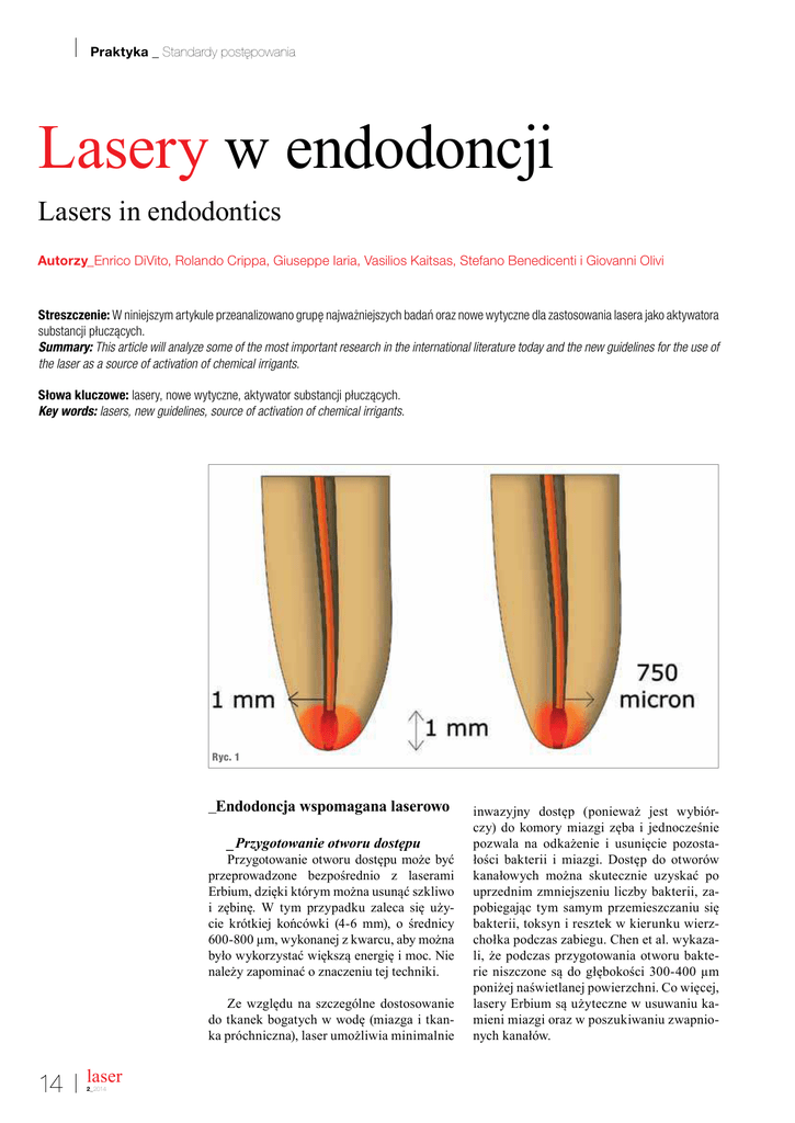 Praktyka _ Standardy postępowania Lasery w endodoncji Lasers in endodontics Autorzy_Enrico DiVito, Rolando Crippa, Giuseppe Iaria, Vasilios Kaitsas, Stefano Benedicenti i Giovanni Olivi Streszczenie: W niniejszym artykule przeanalizowano grupę najważniejszych badań oraz nowe wytyczne dla zastosowania lasera jako aktywatora substancji płuczących. Summary: This article will analyze some of the most important research in the international literature today and the new guidelines for the use of the laser as a source of activation of chemical irrigants. Słowa kluczowe: lasery, nowe wytyczne, aktywator substancji płuczących. Key words: lasers, new guidelines, source of activation of chemical irrigants. Ryc. 1 _Endodoncja wspomagana laserowo _Przygotowanie otworu dostępu Przygotowanie otworu dostępu może być przeprowadzone bezpośrednio z laserami Erbium, dzięki którym można usunąć szkliwo i zębinę. W tym przypadku zaleca się użycie krótkiej końcówki (4-6 mm), o średnicy 600-800 µm, wykonanej z kwarcu, aby można było wykorzystać większą energię i moc. Nie należy zapominać o znaczeniu tej techniki. Ze względu na szczególne dostosowanie do tkanek bogatych w wodę (miazga i tkanka próchniczna), laser umożliwia minimalnie 14 laser 2_2014 inwazyjny dostęp (ponieważ jest wybiórczy) do komory miazgi zęba i jednocześnie pozwala na odkażenie i usunięcie pozostałości bakterii i miazgi. Dostęp do otworów kanałowych można skutecznie uzyskać po uprzednim zmniejszeniu liczby bakterii, zapobiegając tym samym przemieszczaniu się bakterii, toksyn i resztek w kierunku wierzchołka podczas zabiegu. Chen et al. wykazali, że podczas przygotowania otworu bakterie niszczone są do głębokości 300-400 µm poniżej naświetlanej powierzchni. Co więcej, lasery Erbium są użyteczne w usuwaniu kamieni miazgi oraz w poszukiwaniu zwapnionych kanałów. Praktyka _ Standardy postępowania Ryc. 2 _Przygotowanie i kształtowanie kanałów Przygotowanie kanałów przy pomocy narzędzi NiTi wciąż jest kluczowym standardem w dzisiejszej endodoncji. Pomimo stwierdzonego działania ablacyjnego laserów Erbium (2,780 i 2,940 nm) na twardych tkankach, ich skuteczność w przygotowaniu kanałów w korzeniu wydaje się być obecnie ograniczona i nie odpowiada standardom endodontycznym osiąganym w technologii NiTi21-23. Niemniej jednak, lasery Erbium, Chromium: YSGG (Er, Cr: YSGG) oraz Erbium: YAG (Er: YAG) otrzymały zgodę FDA (Agencji Żywności i Leków) dla stosowania w czyszczeniu, kształtowaniu i powiększaniu kanałów. W kilku badaniach potwierdzono skuteczność tych systemów w kształtowaniu i powiększaniu kanałów korzeniowych. Shoji et al. zastosowali system laserowy Er: YAG ze stożkową końcówką, emisją boczną wynoszącą 80% oraz emisją przy końcówce wynoszącą 20% w celu powiększenia i oczyszczenia kanałów, przy wykorzystaniu 10-40 mJ dla 10 Hz. Otrzymali czystsze powierzchnie zębiny w porównaniu do technik obrotowych.24 Ryc. 3 patent FDA dla całej procedury endodontycznej (powiększanie, czyszczenie oraz odkażanie), z końcówkami 400, 320 i 200 μm, po kolei i od korony ku dołowi, przy 1.5 W oraz 20 Hz (z powietrzem/wodą w sprayu 35/25%).26,27 Stabholz et al. przedstawili pozytywne wyniki leczenia przeprowadzonego całościowo z wykorzystaniem lasera Er: YAG oraz endodontycznych mikrosond do emisji bocznej.28,29 Ali et al., Matsouka et al. oraz Jahan et al. wykorzystali laser Er, Cr: YSGG do przygotowania prostych i zakrzywionych kanałów, ale w tym przypadku wyniki grupy eksperymentalnej były gorsze od wyników grupy kontrolnej. Stosując laser Er, CR: YSGG o końcówkach 200-320 μm przy 2 W i 20 Hz na prostych i zakrzywionych kanałach, doszli do wniosku, że promieniowanie laserowe może przygotować proste i zakrzywione kanały (poniżej 10°), podczas gdy bardziej zakrzywione kana- We wstępnym badaniu skuteczności lasera Er: YAG wyposażonego w mikrosondę z emisją promieniową wynoszącą 200-400 μm, Kesler et al. przekonali się, że laser pozwala na szybsze i lepsze powiększanie i kształtowanie w porównaniu z metodami tradycyjnymi. Obserwacje SEM wykazały jednolicie czystą powierzchnię zębiny na wierzchołku fragmentu korony, bez resztek miazgi, a także dobrze wyczyszczone kanaliki zębinowe.25 Chen przedstawił badania kliniczne przeprowadzone z wykorzystaniem lasera Er, Cr: YSGG – pierwszego lasera, który otrzymał Ryc. 4 laser 2_2014 15 Praktyka _ Standardy postępowania Ryc. 5 Ryc. 6 ły wykazały skutki uboczne takie, jak: perforacje, wypalenie i przesunięcie kanału.21-23 Inamoto et al. zbadali umiejętność cięcia i morfologiczne skutki promieniowania lasera Er:YAG in vitro, stosując 30 mJ przy 10 i 25 Hz i przy prędkości ekstrakcji włókna wynoszącej 1 i 2 mm/s, również uzyskując pozytywne wyniki.30 Minas et al. zaobserwowali pozytywne wyniki, stosując laser Er, Cr: YSGG przy 1,5; 1,75 i 2,0 W oraz 20 Hz, ze sprayem wodnym.31 Powierzchnie przygotowane przy pomocy lasera Erbium są dobrze oczyszczone, bez warstwy mazi, ale często pojawiają się krawędzie, nierówności i osmolenia, niosące za sobą ryzyko perforacji czy przesunięcia wierzchołkowego. Podsumowując, kształtowanie kanałów przy pomocy lasera Erbium do dziś pozostaje skomplikowaną procedurą, którą można przeprowadzać jedynie na dużych i prostych kanałach, bez szczególnych korzyści. _Odkażanie układu endodontycznego Badania dotyczące odkażania kanałów odnoszą się do działania chemicznych substancji Ryc. 7 16 Ryc. 8 laser 2_2014 płuczących (NaClO), powszechnie stosowanych w endodoncji, w połączeniu z substancjami chelatującymi dla lepszego oczyszczenia kanalików zębinowych (kwas cytrynowy i kwas edetynowy). Jednym z takich badań jest badanie Berutti et al., którzy zaobserwowali odkażające właściwości NaClO do głębokości 130 μm na ścianie korzenia.32 Lasery początkowo zostały wprowadz