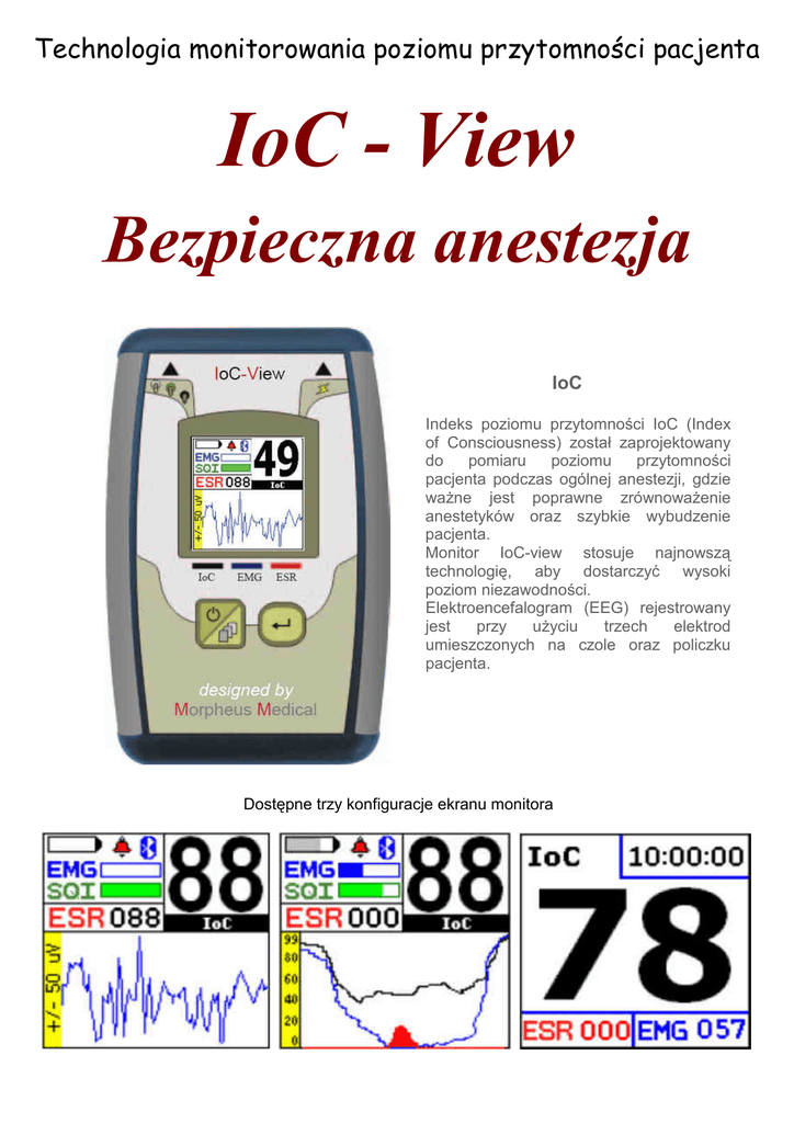 Technologia monitorowania poziomu przytomności pacjenta IoC - View Bezpieczna anestezja IoC Indeks poziomu przytomności IoC (Index of Consciousness) został zaprojektowany do pomiaru poziomu przytomności pacjenta podczas ogólnej anestezji, gdzie waŜne jest poprawne zrównowaŜenie anestetyków oraz szybkie wybudzenie pacjenta. Monitor IoC-view stosuje najnowszą technologię, aby dostarczyć wysoki poziom niezawodności. Elektroencefalogram (EEG) rejestrowany trzech elektrod jest przy uŜyciu umieszczonych na czole oraz policzku pacjenta. Dostępne trzy konfiguracje ekranu monitora IoC Stan kliniczny 99 Pacjent obudzony 80 Sedacja 60 Ogólna anestezja 40 Głęboka anestezja 0 Indeks IoC został zaprojektowany zgodnie ze standardową skalą monitorów do pomiaru głębokości anestezji gdzie zakres ogólnej anestezji wykrywany jest w zakresie 40-60 IoC. Izoelektryczne EEG Monitor IoC-View uŜywa trzech wysokiej jakości elektrod. Parametry techniczne Indeks oraz aktualizacja ekranu Całkowite opóźnienie aktualizacji indeksu Fala EEG EEG Suppression Rate (ESR) EMG Trend IoC Indeks jakości sygnału SQI Górny i dolny alarm IoC System sprawdzający impedancję elektrod Baterie CMRR Waga Wymiary MoŜliwość bezprzewodowej transmisji do komputera, PDA Producent IoC 0-99, Filtr 1-47Hz, 1 sekundowa aktualizacja ekranu 8s ± 500 µV skalowalne, Filtr 1 -30 Hz, długość okna - 3 sekundy 0-100% Krzywa i wskaźnik wartości 5, 6 minut Tak Tak Tak, 3 elektrody 2xAA >140 dB 130 g 117 x 78 x 24 mm Tak Morpheus Medical, Llacuna 162 08018 Barcelona, Spain Przedstawiciel handlowy: EMTEL ul. Zamkowa 1 41-803 Zabrze Telefon: 032 271 90 13 Fax: 032 271 57 27 e-mail: [email protected] internet: www.emtel.com.pl