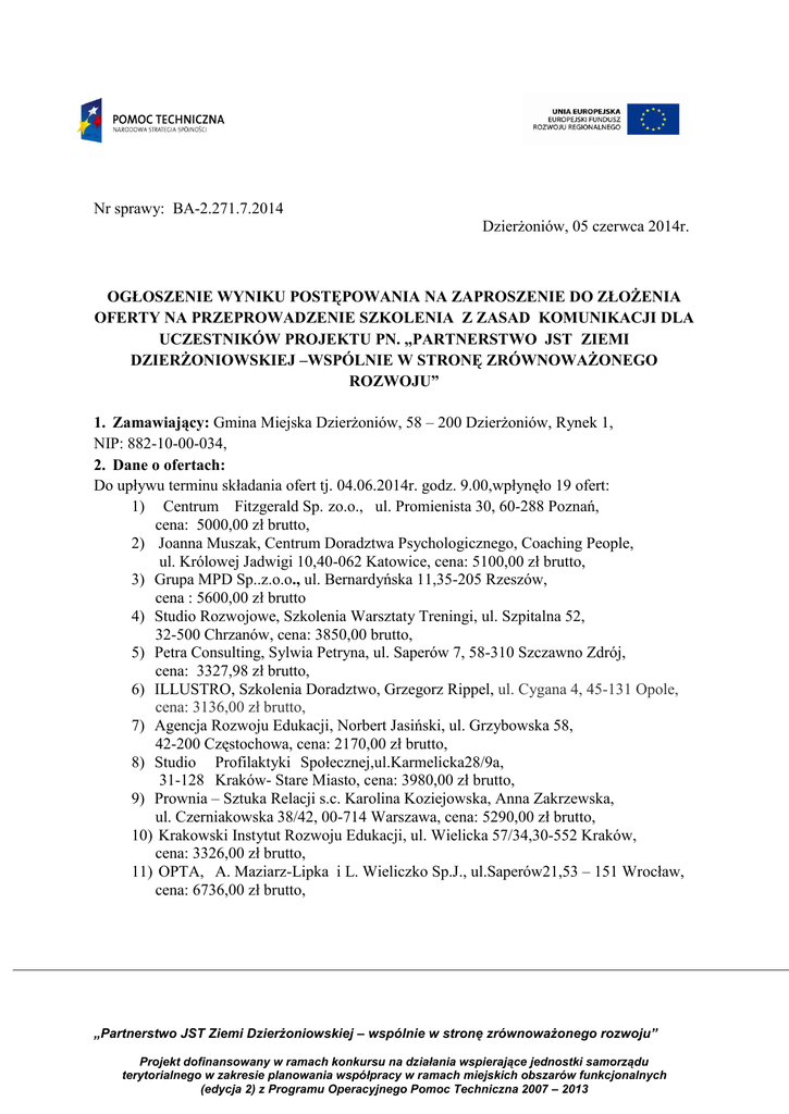 Nr sprawy: BA-2.271.7.2014 Dzierżoniów, 05 czerwca 2014r. OGŁOSZENIE WYNIKU POSTĘPOWANIA NA ZAPROSZENIE DO ZŁOŻENIA OFERTY NA PRZEPROWADZENIE SZKOLENIA Z ZASAD KOMUNIKACJI DLA UCZESTNIKÓW PROJEKTU PN. „PARTNERSTWO JST ZIEMI DZIERŻONIOWSKIEJ –WSPÓLNIE W STRONĘ ZRÓWNOWAŻONEGO ROZWOJU” 1. Zamawiający: Gmina Miejska Dzierżoniów, 58 – 200 Dzierżoniów, Rynek 1, NIP: 882-10-00-034, 2. Dane o ofertach: Do upływu terminu składania ofert tj. 04.06.2014r. godz. 9.00,wpłynęło 19 ofert: 1) Centrum Fitzgerald Sp. zo.o., ul. Promienista 30, 60-288 Poznań, cena: 5000,00 zł brutto, 2) Joanna Muszak, Centrum Doradztwa Psychologicznego, Coaching People, ul. Królowej Jadwigi 10,40-062 Katowice, cena: 5100,00 zł brutto, 3) Grupa MPD Sp..z.o.o., ul. Bernardyńska 11,35-205 Rzeszów, cena : 5600,00 zł brutto 4) Studio Rozwojowe, Szkolenia Warsztaty Treningi, ul. Szpitalna 52, 32-500 Chrzanów, cena: 3850,00 brutto, 5) Petra Consulting, Sylwia Petryna, ul. Saperów 7, 58-310 Szczawno Zdrój, cena: 3327,98 zł brutto, 6) ILLUSTRO, Szkolenia Doradztwo, Grzegorz Rippel, ul. Cygana 4, 45-131 Opole, cena: 3136,00 zł brutto, 7) Agencja Rozwoju Edukacji, Norbert Jasiński, ul. Grzybowska 58, 42-200 Częstochowa, cena: 2170,00 zł brutto, 8) Studio Profilaktyki Społecznej,ul.Karmelicka28/9a, 31-128 Kraków- Stare Miasto, cena: 3980,00 zł brutto, 9) Prownia – Sztuka Relacji s.c. Karolina Koziejowska, Anna Zakrzewska, ul. Czerniakowska 38/42, 00-714 Warszawa, cena: 5290,00 zł brutto, 10) Krakowski Instytut Rozwoju Edukacji, ul. Wielicka 57/34,30-552 Kraków, cena: 3326,00 zł brutto, 11) OPTA, A. Maziarz-Lipka i L. Wieliczko Sp.J., ul.Saperów21,53 – 151 Wrocław, cena: 6736,00 zł brutto, „Partnerstwo JST Ziemi Dzierżoniowskiej – wspólnie w stronę zrównoważonego rozwoju” Projekt dofinansowany w ramach konkursu na działania wspierające jednostki samorządu terytorialnego w zakresie planowania współpracy w ramach miejskich obszarów funkcjonalnych (edycja 2) z Programu Operacyjnego Pomoc Techniczna 2007 – 2013 12) Centrum Psychologii i Rozwoju Osobistego MILVUM, Wioletta Kania, ul. 3 Maja 40/1a, Bielawa, cena: 5513,00 zł brutto, 13) Ziemowit, Jadwiga Piwońska, ul. Myśliwska 9, 05-807 Podkowa Leś., cena: 4425,20 zł brutto, 14) JPG service Justyna Glińska ,ul. Grabiszyńska 281/305a, 53-234 Wrocław, cena: 4700,00 zł brutto, 15) Dolnośląskie Centrum Psychoterapii Sp. z o.o., ul. Sienkiewicza 116/4, 50-347 Wrocław, cena: 5500,00 zł brutto, 16) Publico, Anna Kornacka ,ul. Zakole 17/5, 71-454 Szczecin, cena: 3100,00 zł brutto, 17) Dolnośląskie Centrum Rozwoju Lokalnego, ul. Jedności Narodowej 45 B, 50-260 Wrocław, cena: 5081,00 zł brutto, 18) DLAKADR.PL Sp. z o.o., ul. Nakielska 3, 01-106 Warszawa, cena: 3740,00 zl brutto, 19) Agencja SEDNO Sp. z o.o., ul. Batorego 34/7, 59-220 Legnica, cena : 6798,00 zł brutto. 3. Liczba ofert niepodlegających rozpatrzeniu :1- Agencja Rozwoju Edukacji, Norbert Jasiński, ul. Grzybowska 58,42-200 Częstochowa – ze względu na niekompletność przesłanych dokumentów, określonych w zaproszeniu do złożenia oferty (brak konspektu szkolenia, menu). 4. Wskazanie wybranej oferty z uzasadnieniem jej wyboru: Najkorzystniejsza oferta: Publico, Anna Kornacka ,ul. Zakole 17/5, 71-454 Szczecin, cena: 3100,00 zł brutto. Uzasadnienie wyboru: oferta jest najkorzystniejsza pod względem ceny, spełnia warunki określone w zaproszeniu do złożenia oferty. Zastępca Burmistrza ds. społecznych Ryszard Szydłowski „Partnerstwo JST Ziemi Dzierżoniowskiej – wspólnie w stronę zrównoważonego rozwoju” Projekt dofinansowany w ramach konkursu na działania wspierające jednostki samorządu terytorialnego w zakresie planowania współpracy w ramach miejskich obszarów funkcjonalnych (edycja 2) z Programu Operacyjnego Pomoc Techniczna 2007 – 2013