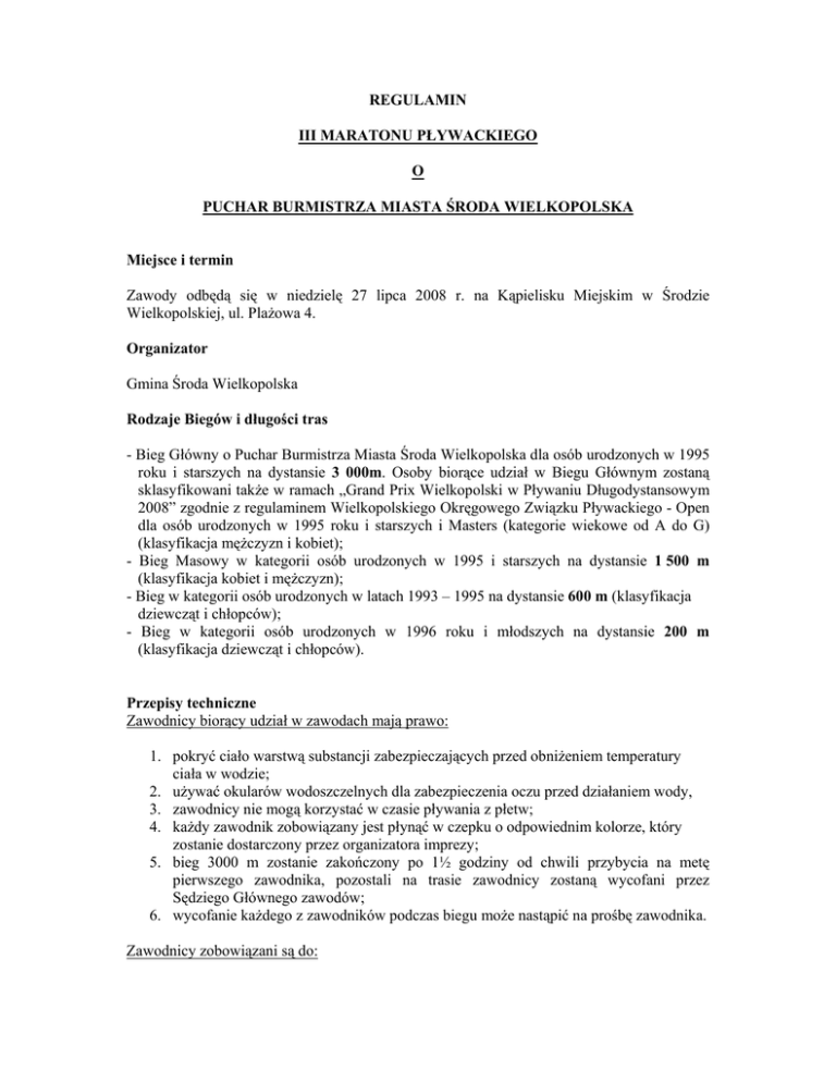 REGULAMIN III MARATONU PŁYWACKIEGO O PUCHAR BURMISTRZA MIASTA ŚRODA WIELKOPOLSKA Miejsce i termin Zawody odbędą się w niedzielę 27 lipca 2008 r. na Kąpielisku Miejskim w Środzie Wielkopolskiej, ul. Plażowa 4. Organizator Gmina Środa Wielkopolska Rodzaje Biegów i długości tras - Bieg Główny o Puchar Burmistrza Miasta Środa Wielkopolska dla osób urodzonych w 1995 roku i starszych na dystansie 3 000m. Osoby biorące udział w Biegu Głównym zostaną sklasyfikowani także w ramach „Grand Prix Wielkopolski w Pływaniu Długodystansowym 2008” zgodnie z regulaminem Wielkopolskiego Okręgowego Związku Pływackiego - Open dla osób urodzonych w 1995 roku i starszych i Masters (kategorie wiekowe od A do G) (klasyfikacja mężczyzn i kobiet); - Bieg Masowy w kategorii osób urodzonych w 1995 i starszych na dystansie 1 500 m (klasyfikacja kobiet i mężczyzn); - Bieg w kategorii osób urodzonych w latach 1993 – 1995 na dystansie 600 m (klasyfikacja dziewcząt i chłopców); - Bieg w kategorii osób urodzonych w 1996 roku i młodszych na dystansie 200 m (klasyfikacja dziewcząt i chłopców). Przepisy techniczne Zawodnicy biorący udział w zawodach mają prawo: 1. pokryć ciało warstwą substancji zabezpieczających przed obniżeniem temperatury ciała w wodzie; 2. używać okularów wodoszczelnych dla zabezpieczenia oczu przed działaniem wody, 3. zawodnicy nie mogą korzystać w czasie pływania z płetw; 4. każdy zawodnik zobowiązany jest płynąć w czepku o odpowiednim kolorze, który zostanie dostarczony przez organizatora imprezy; 5. bieg 3000 m zostanie zakończony po 1½ godziny od chwili przybycia na metę pierwszego zawodnika, pozostali na trasie zawodnicy zostaną wycofani przez Sędziego Głównego zawodów; 6. wycofanie każdego z zawodników podczas biegu może nastąpić na prośbę zawodnika. Zawodnicy zobowiązani są do: 1. podporządkowania się decyzjom Komisji Sędziowskiej, szczególnie w zakresie przestrzegania trasy wyścigu (pod sankcją dyskwalifikacji); 2. poddania się badaniu lekarskiemu przed zawodami przez lekarza zawodów, 3. zgłoszenia się na starcie wyścigu w czepku o odpowiednim kolorze, jaki zawodnicy otrzymają od organizatora, oraz wypisanym numerem na ramieniu; 4. podpisania własnoręcznie oświadczenia stwierdzającego, że w wyścigu startuje na własną odpowiedzialność oraz że nie będzie wnosić żadnych pretensji do organizatorów w razie ewentualnego poniesienia uszczerbku na zdrowiu wynikłego ze startu w wyścigach; 5. wpisania na widocznym miejscu numeru startowego. Uczestnictwo: 1. zgłoszenie do poszczególnych biegów będą przyjmowane w dniu zawodów; 2. wszyscy zawodnicy muszą posiadać dowód osobisty lub inny dokument stwierdzający tożsamość; 3. osoby niepełnoletnie, chcące brać udział w zawodach, są zobowiązane do przedstawienia pisemnego pozwolenia od rodziców lub prawnych opiekunów. Ubezpieczenie Organizator ubezpiecza wszystkich uczestników pływania na czas trwania zawodów od odpowiedzialności cywilnej (OC). Zasady Finansowania Organizatorzy ponoszą koszty związane z organizacją zawodów, ufundowaniem nagród, pucharów i medali. Nagrody Organizatorzy zapewniają - dla pierwszych trzech uczestników (bez podziału na płeć) biegu na 3000 m – dyplomy, puchary, nagrody rzeczowe; - dla pierwszych trzech osób w klasyfikacji Grand Prix – dyplomy, puchary, nagrody rzeczowe (dla kobiet i mężczyzn); - dla pierwszych trzech osób w każdej kategorii Masters (dla kobiet i mężczyzn) – dyplomy i puchary; - dla pierwszych trzech uczestników biegu na 1500m (dla kobiet i mężczyzn) – dyplomy, puchary, medale i nagrody rzeczowe; - dla pierwszych trzech uczestników biegu na 600m (dla dziewcząt i chłopców) – dyplomy, puchary, medale i nagrody rzeczowe; - dla pierwszych trzech uczestników biegu na 200m (dla dziewcząt i chłopców) – dyplomy, puchary, medale i nagrody rzeczowe; - dla najmłodszego zawodnika zawodów – dyplom, puchar, medal i nagrodę rzeczową; - dla najstarszego zawodnika zawodów – dyplom, puchar, medal i nagrodę rzeczową; - dla najlepszego średzianina – dyplom, puchar, medal i nagrodę rzeczową; - dla najlepszego Wielkopolanina – dyplom, puchar, medal i nagrodę rzeczową; - dla wszystkich zawodników z poszczególnych biegów – pamiątkowe dyplomy uczestnictwa. Komisja sędziowska i przepisy sportowe Sędziego głównego zawodów wyznaczają organizatorzy. Sędzia Główny w porozumieniu z organizatorami powołuje komisję sędziowską. Wyścigi odbędą się zgodnie z obowiązującymi przepisami imprez sportowo – rekreacyjnych. Regulamin został opracowany zgodnie z ustawą z dn. 22.08.1997 r. o bezpieczeństwie imprez masowych (Dz.U.05.108.909 j.t.). Biuro Zawodów Biuro zawodów i recepcja mieścić się będą w miejscu zawodów tj. na Kąpielisku Miejskim w Środzie Wielkopolskiej (ul. Plażowa 4) i będą czynne w dniu zawodów od godz. 10.00. Zapisy do poszczególnych biegów będą miały miejsce w dniu zawodów. Postanowienia końcowe Interpretacja niniejszego regulaminu należy do organizatorów. Organizatorzy zastrzegają sobie prawo do odwołania zawodów w przypadku niesprzyjających warunków atmosferycznych (burz, duża fala, zbyt niska temperatura wody) oraz warunków ekologicznych. W sprawach organizacyjnych prosimy o kontakt z Marcinem Bednarzem 061 286 77 08, 0792 78 05 27, [email protected].