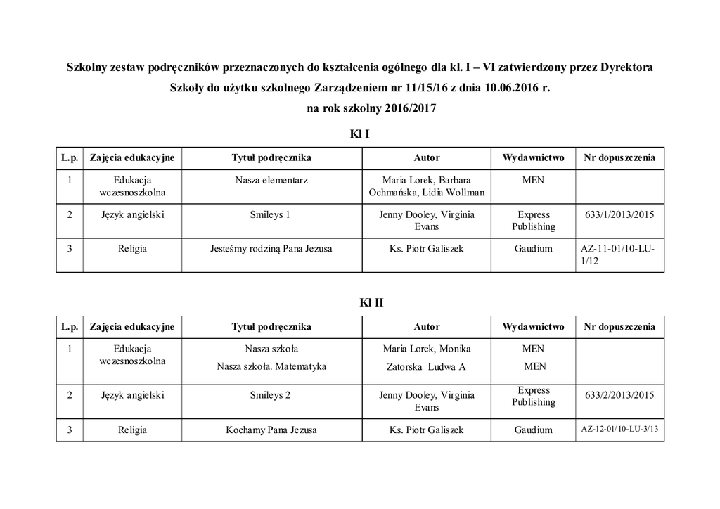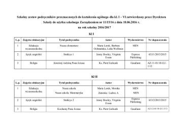 Szkolny zestaw podręczników przeznaczonych do kształcenia ogólnego dla kl. I – VI zatwierdzony przez Dyrektora Szkoły do użytku szkolnego Zarządzeniem nr 11/15/16 z dnia 10.06.2016 r. na rok szkolny 2016/2017 Kl I L.p. Zajęcia edukacyjne Tytuł podręcznika Autor Wydawnictwo 1 Edukacja wczesnoszkolna Nasza elementarz Maria Lorek, Barbara Ochmańska, Lidia Wollman MEN 2 Język angielski Smileys 1 Jenny Dooley, Virginia Evans Express Publishing 633/1/2013/2015 3 Religia Jesteśmy rodziną Pana Jezusa Ks. Piotr Galiszek Gaudium AZ-11-01/10-LU1/12 Nr dopus zczenia Nr dopus zczenia Kl II L.p. Zajęcia edukacyjne Tytuł podręcznika Autor Wydawnictwo 1 Edukacja wczesnoszkolna Nasza szkoła Maria Lorek, Monika MEN Nasza szkoła. Matematyka Zatorska Ludwa A MEN 2 Język angielski Smileys 2 Jenny Dooley, Virginia Evans Express Publishing 633/2/2013/2015 3 Religia Kochamy Pana Jezusa Ks. Piotr Galiszek Gaudium AZ-12-01/ 10-LU-3/13 Kl III L.p. Zajęcia edukacyjne Tytuł podręcznika Autor Wydawnictwo 1 Edukacja wczesnoszkolna Nasza szkoła Maria Lorek, Monika Zatorska MEN Nasza szkoła. Matematyka Agata Ludwa MEN 2 Język angielski Smileys 3 Jenny Dooley, Virginia Evans Express Publishing 633/3/2013/2016 3 Religia Przyjmujemy Pana Jezusa Ks. Piotr Galiszek Gaudium AZ-13-01/ 10-LU-4/14 Nr dopus zczenia Kl. IV L.p. 1 Zajęcia edukacyjne Język polski Tytuł podręcznika Autor Wydawnictwo Słowa na start kl. IV. Kształcenie literackie i kulturowe. Cz.1 Marlena Derlukiewicz Nowa Era Słowa na start kl. IV. Kształcenie językowe. Cz. 2 D. Chwastniewska, A. Gorzałczyńska-Mróz, D. Rożek Nr dopus zczenia 338/1/2011/2015 338/2/2011/2015 2 Język angielski Starland 1 Jenny Dooley, Virginia Evans Express Publishing 231/1/2009/2015 3 Historia i społeczeństwo Wczoraj i dziś Grzegorz Wojciechowski Nowa Era 443/1/2012/2015 4 Przyroda Tajemnice przyrody kl. IV M. Marko-Worłowska, F. Szlajfer, J. Stawarz Nowa Era 399/1/2011/2014 Matematyka z plusem kl IV M. Dobrowolska, GWO 340/1/2015/z1 5 Matematyka M. Jucewicz, M. Karpiński 6 Plastyka Muzyka Do dzieła Jadwiga Lukas, K. Onak Nowa Era 326/1/2011/2015 Lekcja muzyki kl. IV Maria Gromek, Grażyna Kilbach Nowa Era 589/1/2012/2015 Jak to działa. L Łabecki, M. Łabecka Nowa Era 295/2010/2014 Jestem chrześcijaninem Ks. Waldemar Janiga Gaudium AZ-21-01/ 10-LU-1/12 Tytuł podręcznika Autor Wydawnictwo Nr dopus zczenia Słowa na start kl. V. Kształcenie literackie i kulturowe. Cz.1 Marlena Derlukiewicz Nowa Era 338/4/2013/2015 Słowa na start kl. V. Kształcenie językowe. Cz. 2 Anna Wojciechowska, Agnieszka Marcinkiewicz Język angielski Starland 2 Jenny Dooley, Virginia Evans Express Publishing 231/2/2010/2015 Wczoraj i dziś Grzegorz Wojciechowski Nowa Era 443/2/2012/2015 4 Historia i społeczeństwo Przyroda Tajemnice przyrody kl. V M. Marko-Worłowska, F. Szlajfer, J. Stawarz Nowa Era 399/2/2013/2015 5 Matematyka Matematyka z plusem kl V M. Dobrowolska, M. Jucewicz, M. Karpiński GWO 773/2/2016 7 9 Zajęcia techniczne 10 Religia Kl V L.p. 1 2 3 Zajęcia edukacyjne Język polski 338/3/2013/2015 6 7 Plastyka Muzyka 8 Zajęcia komputerowe 9 Zajęcia techniczne 10 Religia Do dzieła Jadwiga Lukas, K. Onak Nowa Era 326/2/2011/2015 Lekcja muzyki kl. V Maria Gromek, Grażyna Kilbach Nowa Era 589/2/2013/2015 Lubię to Michał Kęska Nowa Era 729/2/2016 Jak to działa. L Łabecki, M. Łabecka Nowa Era 295/2/2010/2015 Wierzę w Boga Ks. Waldemar Janiga Gaudium AZ-22-01/ 10-LU-2/13 Autor Wydawnictwo Nr dopus zczenia Kl VI L.p. 1 Zajęcia edukacyjne Język polski Tytuł podręcznika Słowa z uśmiechem kl. VI. Literatura i kultura 551/5/2014 E. Horwat, A. Żegleń WSiP 551/6/2014 551/7/2014 Nauka o języku i ortografii cz. 1 i 2 2 Język angielski Starland 2 Jenny Dooley, Virginia Evans Express Publishing 231/2/2010/2015 3 Historia i społeczeństwo Przyroda Wczoraj i dziś Grzegorz Wojciechowski Nowa Era 443/3/2014 Przyrodo witaj! kl VI E. Gromek, E. Kłos, W. Kafta, WSiP 530/3/2014 4 5 Matematyka 6 Plastyka Matematyka z plusem kl VI M. Dobrowolska, M. Jucewicz, M. Karpiński GWO 340/3/2014 Plastyka 4 - 6 S. Stopczyk, J. Chołasińska, WSiP 406/3/2014 B. Neubart 7 Muzyka Klucz do muzyki Urszula Smoczyńska, K. Jakóbczak-Drążek WSiP 406/3/2014 8 Religia Wierzę w Kościół Ks. Waldemar Janiga Gaudium AZ-23-01/ 10-LU-2/14 Dopuszczam do użytku na rok szkolny 2016/2017 Dyrektor Szkoły
