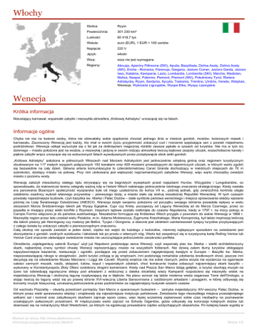 Włochy Stolica: Rzym Powierzchnia: 301 230 km² Ludność: 60 418,7 tys Waluta: euro (EUR), 1 EUR = 100 centów Napięcie: 220 V Język: włoski Wiza: wiza nie jest wymagana Regiony: Abruzja, Apeniny Północne (SKI), Apulia, Bazylikata, Dolina Aosty, Dolina Aosty (SKI), Emilia - Romania, Florencja, Gargano, Jezioro Comer, Jezioro Garda, Jezioro Iseo, Kalabria, Kampania, Lazio, Lombardia, Lombardia (SKI), Marche, Mediolan, Moliza, Neapol, Palermo, Piemont, Piemont (SKI), Południowy Tyrol, Riwiera Adriatycka, Rzym, Sardynia, Sycylia, Toskania, Trentino, Umbria, Veneto, Watykan, Wenecja, Wybrzeże Liguryjskie, Wyspa Elba, Wyspy Liparyjskie Wenecja Krótka informacja Nieustający karnawał, wspaniałe zabytki i niezwykła atmosfera „Królowej Adriatyku” unoszącej się na falach. Informacje ogólne Chyba nie ma na świecie osoby, która nie obiecałaby sobie spędzenia chociaż jednego dnia w mieście gondoli, mostów, kolorowych masek i karnawału. Zauroczony Wenecją jest każdy, kto miał w swoim życiu przyjemność zobaczyć cud i marzenie spędzające sen z powiek niejednemu podróżnikowi. Wenecja odkąd wynurzyła się z fal jak za dotknięciem magicznej różdżki zawsze pękała w szwach od turystów. Nie ma w tym nic dziwnego – miasto położone jest na wodzie, a niezwykłą i jedyną w swoim rodzaju atmosferę tworzą bajkowe zespoły uliczek, wszechobecne kanały i piękne zabytki wręcz unoszące się na wzburzonych falach wywoływanych przez przepływajcie obok setki gondoli. „Królowa Adriatyku” położona w północnych Włoszech nad Morzem Adriatyckim jest jednocześnie odrębną gminą oraz regionem turystycznym zbudowanym na 117 małych wyspach połączonych 150 kanałami oraz 409 mostami prowadzącymi do tajemniczych uliczek, w których warto zgubić się bezwiednie na cały dzień. Główna arteria komunikacyjna to czterokilometrowy Canal Grande dochodzący w niektórych miejscach do 70 m szerokości, dzielący miasto na połowę. Przy nim ulokowana jest większość najznamienitszych zabytków Wenecji, więc warto chociażby zwiedzić miasto z poziomu wody. Wenecję założyli mieszkańcy stałego lądu skrywający się na bagnistych wysepkach przed najazdami Hunów, Wizygotów i Longobardów, co spowodowało, że malownicze tereny odegrały ważną rolę w historii Włoch nabierając jednocześnie istotnego znaczenia strategicznego. Kiedy nastała era panowania Bizancjum społeczność wyspiarska była od niego uzależniona do końca VII w., później jednak, gdy zwierzchnia kontrola uległa osłabieniu osadnicy wybrali własnego przywódcę – pierwszego dożę, a miasto stało się stolicą niezależnej Republiki Weneckiej. W tych czasach powstały najważniejsze budowle, czyli bazylika św. Marka i Pałac Dożów – stałe symbole państwa weneckiego i miejsca sprawowania władzy wpisane później na Listę Światowego Dziedzictwa UNESCO. Wenecja dzięki swojemu położeniu od początku swojego istnienia posiadała wpływy w wielu obszarach Morza Śródziemnego takich jak Wyspy Egejskie, Cypr czy Kreta, począwszy od Laguny Weneckiej aż do Morza Czarnego, przez co popadła w trwający przez wieki konflikt z Rzymem. Imperium lądowe zostało nietknięte do czasów Napoleona, kiedy w 1797 r. na mocy pokoju w Campio Formio włączono je do państwa austriackiego. Niezależnie formujące się Królestwo Włoch przyjęło z powrotem do siebie Wenecję w 1866 r. Niezwykły region przez lata urzekał wielu Polaków, m.in. Adama Mickiewicza, Zygmunta Krasińskiego, Marię Konopnicką, był także inspiracją twórczą dla takich pisarzy jak Hemingway czy malarzy jak Bellini, Tycjan i Giorgione, a obecnie jest obiektem zainteresowań tysięcy turystów przybywających z całego świata by zobaczyć zabytki o pierwszorzędnym znaczeniu. Całą okolicę nie sposób zwiedzić w jeden dzień, ciężko też wejść do każdego z kościołów, niemniej najlepszym sposobem na zwiedzanie jest skorzystanie z gondoli, wodnych autobusów i taksówek lub po prostu z własnych nóg. Warto też zaopatrzyć się w turystyczną kartę Rolling Venice lub Venice Card znacznie ułatwiające zwiedzanie miasta nie uszczuplające jednocześnie zasobności portfela. Określenia „najelegantszy salonik Europu” użył już Napoleon podziwiając serce Wenecji, czyli wspaniały plac św. Marka – wielki architektoniczny skarb, najbardziej znany symbol chwały Wenecji reprezentujący miasto na wszystkich folderach. Nie dziwią zatem tłumy turystów oblegające najwytworniejsze kawiarnie, restauracje i ogródki, posilające się przed zobaczeniem najpiękniejszej świątyni w Europie – Bazyliki św. Marka, niepozostawiającej nikogo w obojętności. Jedni turyści znikają w jej wnętrzach, inni podziwiają romańskie zdobienia środkowych drzwi, jeszcze inni decydują się na odwiedzenie Museo Marciano i Loggi dei Cavalli. Wystrój wnętrza nie ma sobie równych, jedna wizyta nie wystarcza na ogarnięcie całości cennych mozaik, rzeźb, sklepień, łuków, kopuł i wspaniałych zdobień, choć koniecznie trzeba zobaczyć najcenniejszy skarb bazyliki – wykonany w Konstantynopolu Złoty Ołtarz ozdobiony drogimi kamieniami. Kiedy nad Piazza San Marco latają gołębie, a turyści słuchają muzyki na żywo lub odwiedzają egzotyczne sklepy pod arkadami z widocznej z daleka strzelistej wieży Kampanili rozpościera się niezwykły widok na majestatyczną Wenecję i okoliczną lagunę rozpływającą się w błękicie. Na placu wznosi się także misterna wieża zegarowa Torre dell'Orologio, a stojąc twarzą do laguny widzi się po prawej stronie XVI-wieczną Liberia Sansoviniana z rzeźbionymi arkadami i posągami, w której odbywają się koncerty muzyki klasycznej, uznawaną jednocześnie przez podróżników za najpiękniejszy budynek wszech czasów. Od wschodu Piazzettę – otwartą przestrzeń pomiędzy San Marco a spacerowym bulwarem – zamyka majestatyczny XIV-wieczny 